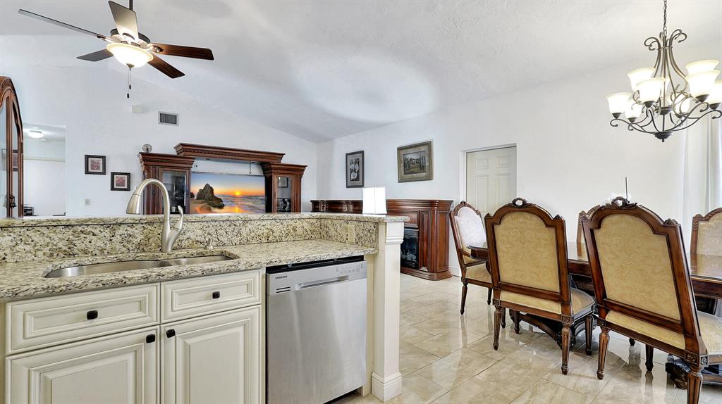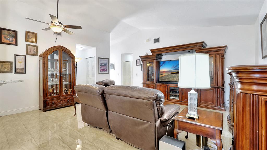 Rarely available updated 2 bed 2 bath home in the coveted Falcon's Lea Community! With a converted screened patio turned dining room, this home boasts extra space and efficiency. The neutral 42'' custom wood cabinetry and 2-year new hi-end appliances make the kitchen a chef's dream. Soaring vaulted ceilings in the great room and primary bedroom add to the sense of spaciousness. And with new porcelain tile floors throughout, cleaning is a breeze. The generously sized bedrooms all feature walk-in closets and the updated bathrooms include a double vanity in the primary. Plus, enjoy the convenience of a LARGE 2-car garage and the beauty of producing avocado and mango trees in the backyard. And don't forget about the community pool directly across the street! Close to all shopping!