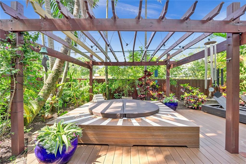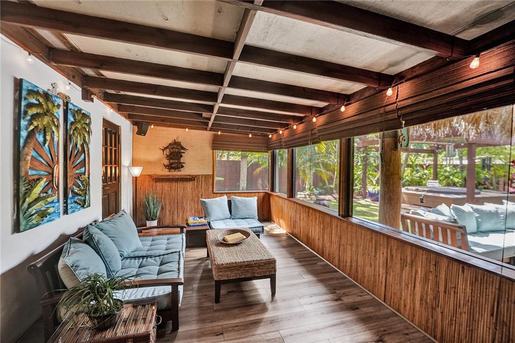 This gorgeous & meticulously maintained home in highly desirable Shady Banks neighborhood is surrounded by a tropical paradise & mature oak trees. Custom Kitchen, Granite Counters w/ Breakfast Bar, Updated bathroom features a rain shower & handheld shower, copper sink, imported shell stone tile & countertop w/ teak vanity. Solid oak doors w/ antique hardware reclaimed vintage hardwood floors, plantation shutters, “smart light switches/outlets”, walk-in closets, interior & garden sound system, impact windows. Exterior w/ desirable living space for entertaining, large tiki hut, full size bar w/ ice machine & 2 fridges, ceiling fans & sink, large composite deck w/oversized hot tub. Minutes to Downtown Las Olas, the Beach, 2 Parks w/Tennis Volleyball Fitness Equip& Riverfront Nature Preserve