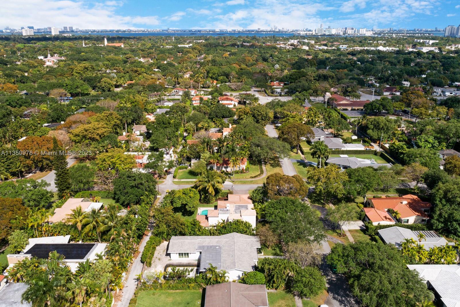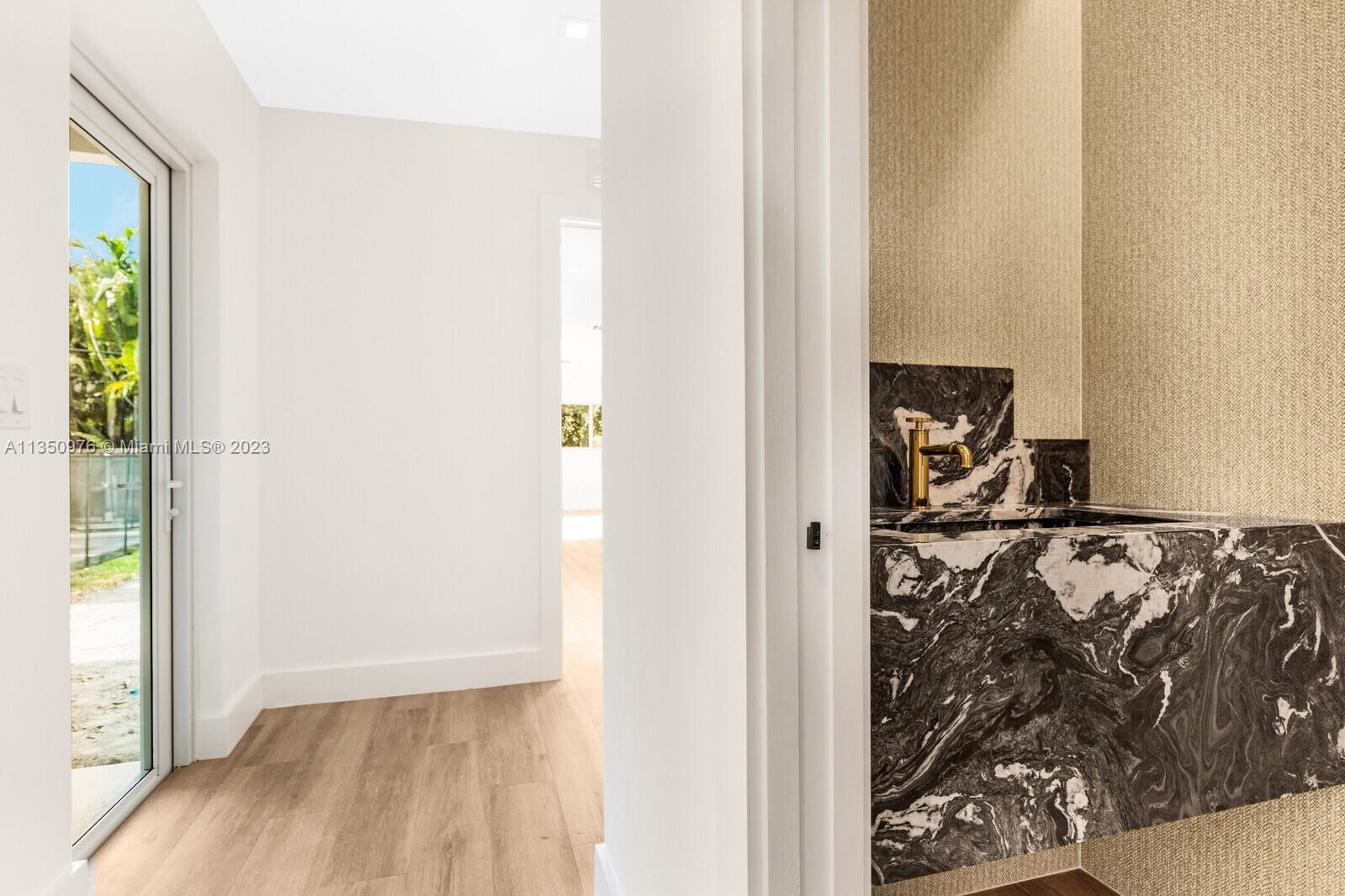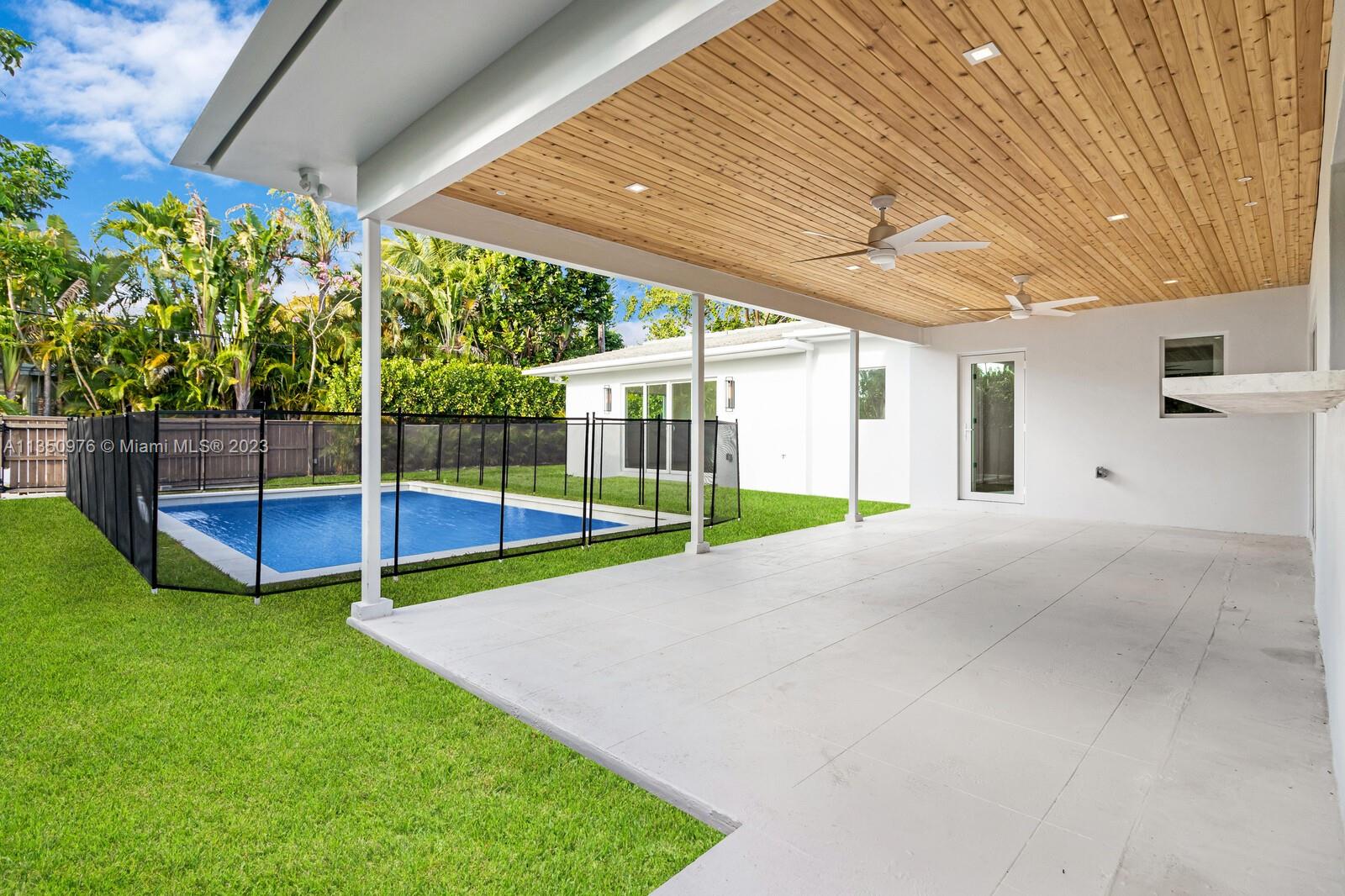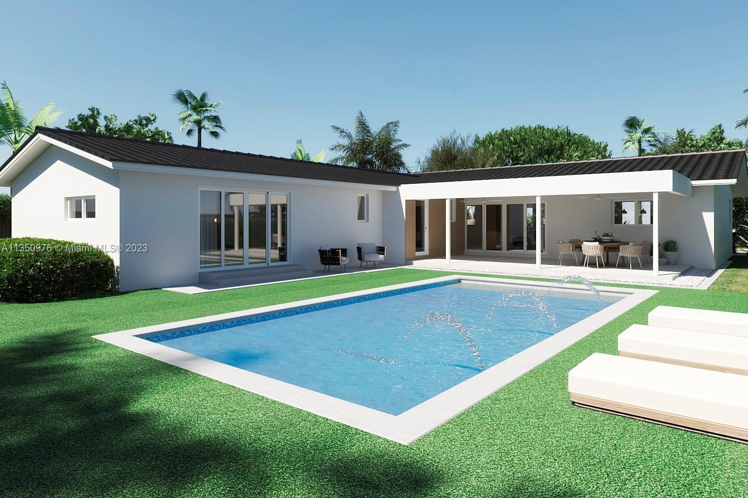 Florida living at its finest with custom curated home by local designer builder in desirable area of Miami Shores. Entry Foyer opens to expansive living overlooking lush backyard & pool. Two wings separate the home with 2 VIP suites equal in size to create 4 bedrooms, 3 full bathrooms & 1 half bath. The primary overlooks pool with private access, 2 walk-in closets, along with 2-person shower & soaking tub. With design in mind, the kitchen delivers custom cabinetry with oversized island that allows seating for more than 6 and commercial grade appliances including gas stove with dual oven. Plus, separate laundry room off kitchen. Retreat outdoors to 300 sq ft covered patio, 15x26 pool with water feature & green space. Rear parking for 2 vehicles. All new with permits.