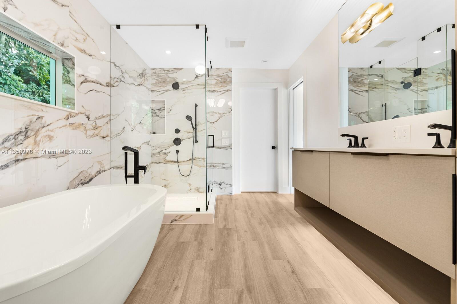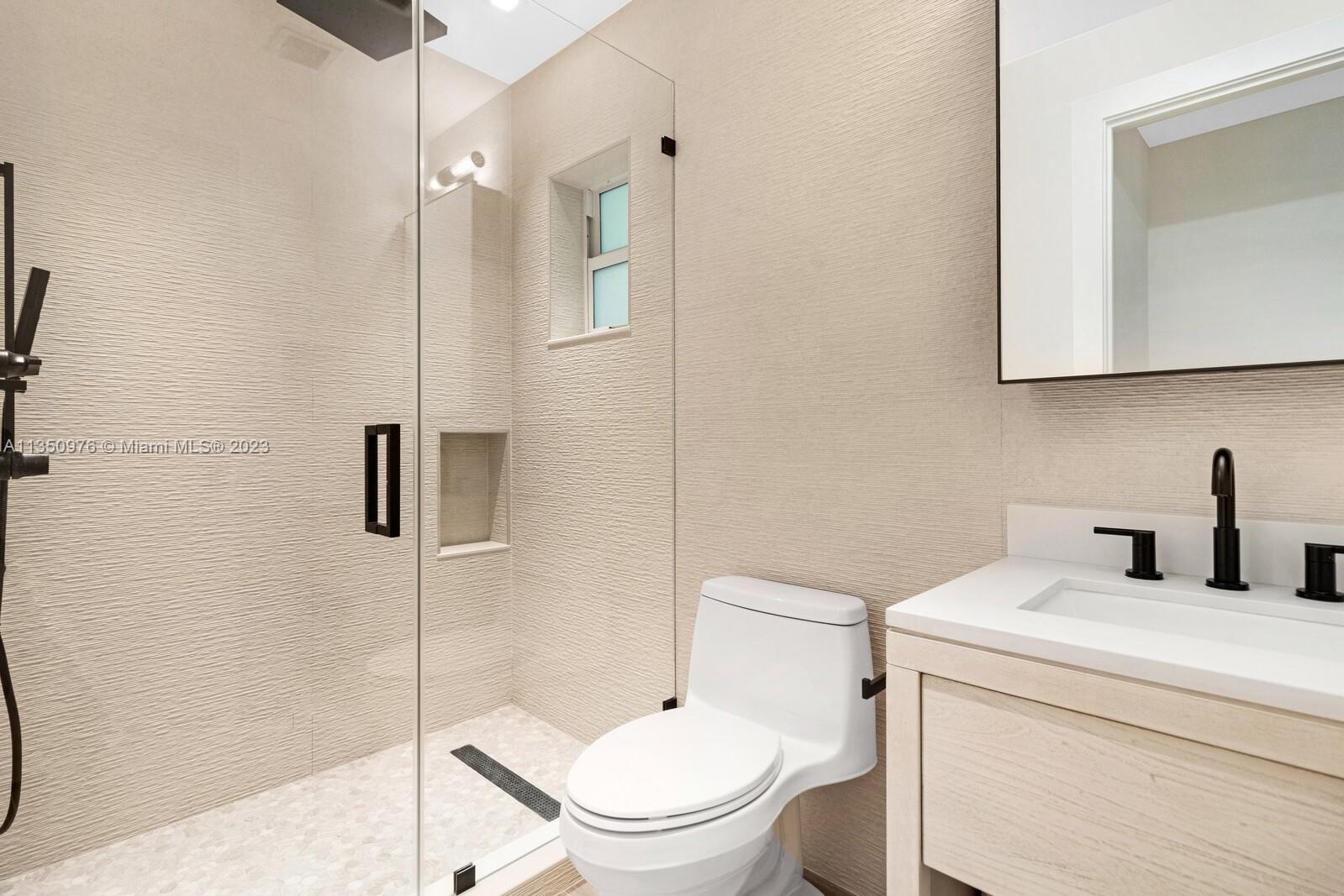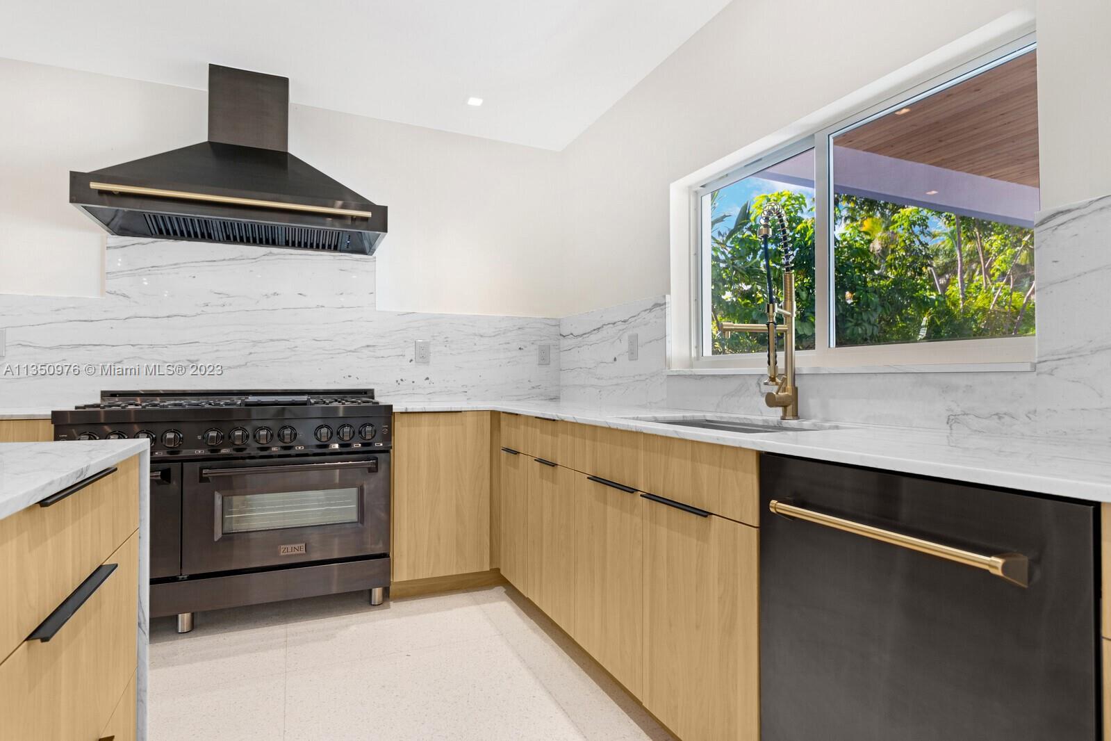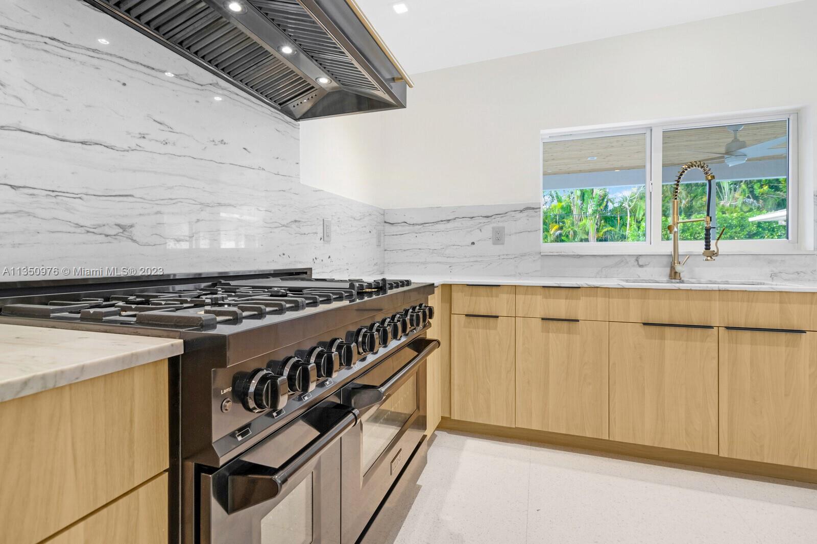 Florida living at its finest with custom curated home by local designer builder in desirable area of Miami Shores. Entry Foyer opens to expansive living overlooking lush backyard & pool. Two wings separate the home with 2 VIP suites equal in size to create 4 bedrooms, 3 full bathrooms & 1 half bath. The primary overlooks pool with private access, 2 walk-in closets, along with 2-person shower & soaking tub. With design in mind, the kitchen delivers custom cabinetry with oversized island that allows seating for more than 6 and commercial grade appliances including gas stove with dual oven. Plus, separate laundry room off kitchen. Retreat outdoors to 300 sq ft covered patio, 15x26 pool with water feature & green space. Rear parking for 2 vehicles. All new with permits.