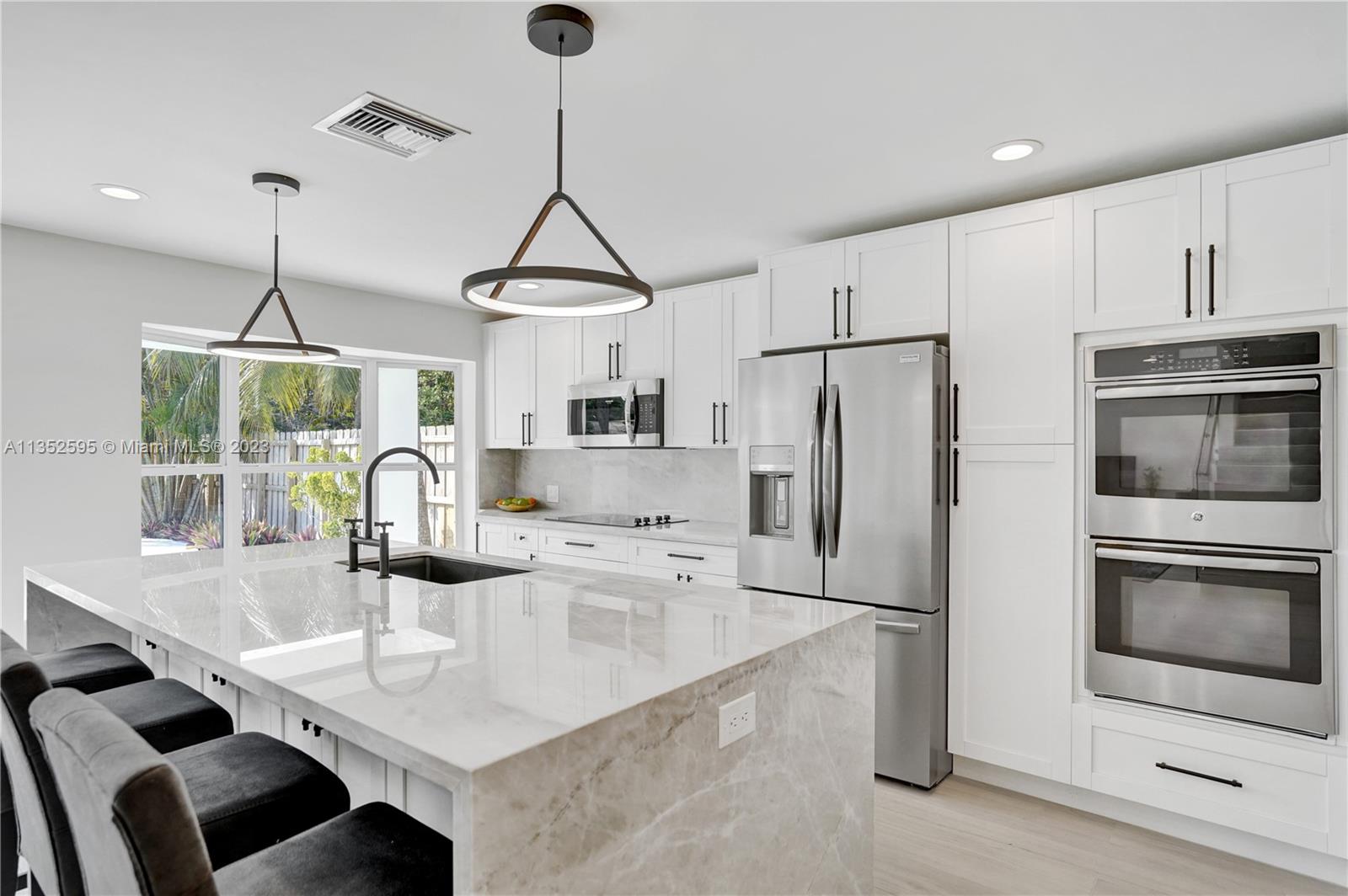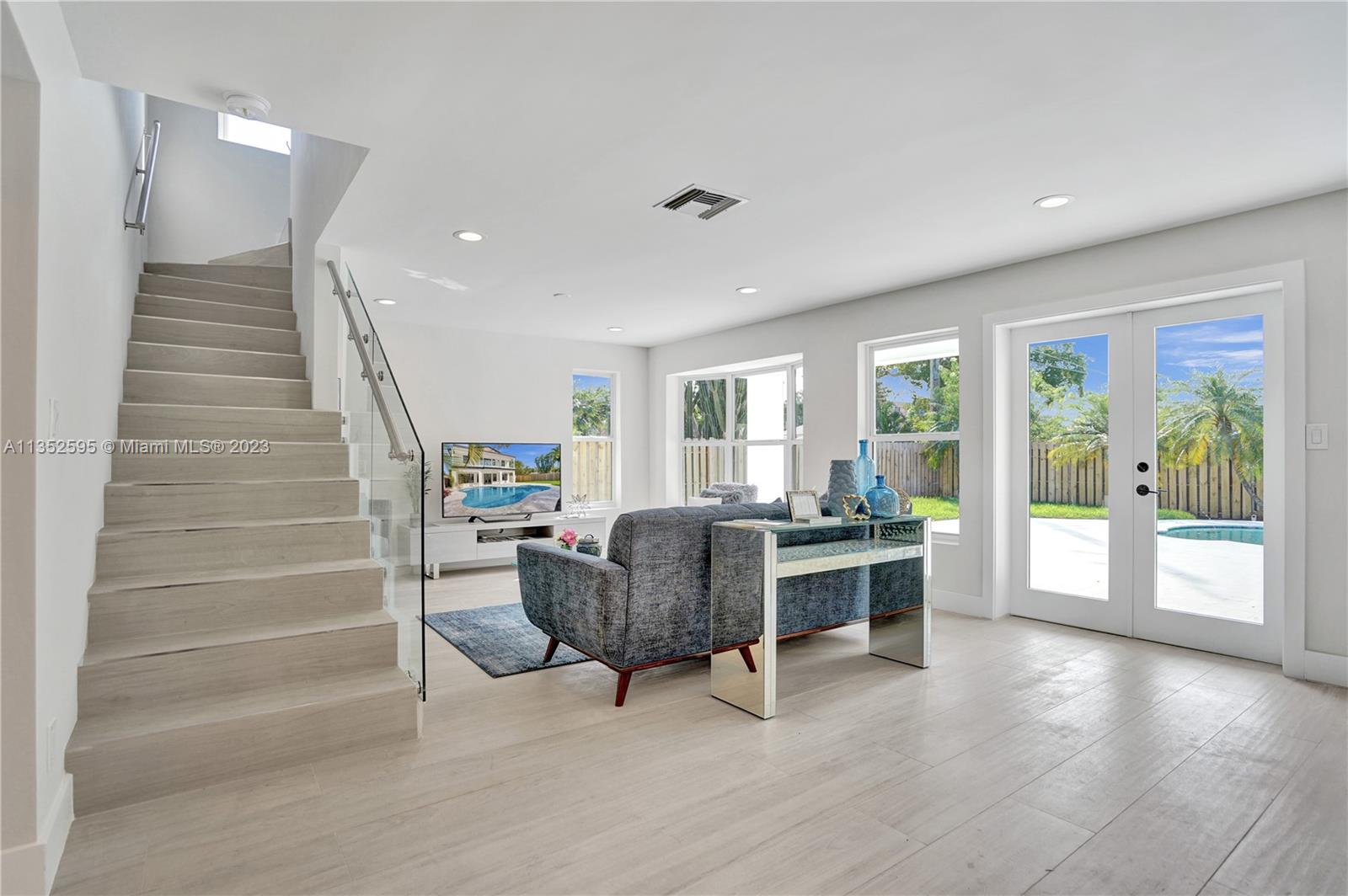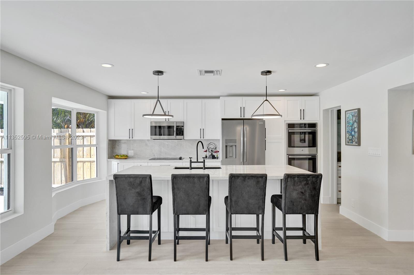 Bright updated 4 bedroom home with a pool 10-minute walk to Las Olas. Open kitchen and living room with views out to the backyard. The kitchen has a nice-sized island made with real stone, which is great for entertaining. There are three bedrooms on the first floor and the primary is on the second floor with a beautiful balcony with a glass banister where you can see out to the pool and backyard when you are relaxing in bed. The primary closet is a great size, made for someone who loves to have a lot of closet space. It even has a skylight to bring in extra light. The primary bathroom has a large walk-in shower, a nice soaking tub, and double sinks. The backyard is so nice for entertaining and relaxing, with a nice-sized pool to cool off from the Florida heat. House is ready to move into.