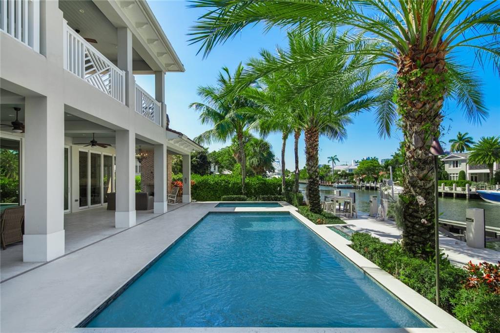 A Rio Vista DREAM HOME. Step into the 2-story, 3-car 2017 British West Indies style home featuring 6 beds, 6.1 baths, oversized primary suite with walk in closets, state of the art interiors of natural woods and meticulous mill works throughout. The perfect home for entertaining all and enjoying family. Stunning bar room and gourmet kitchen between a vast open great room full of sliders to open the entire room, overviewing the pool and waterfront. 100ft of dockage, boat lift and floating dock. The perfect set up that cruises you minutes to the ocean. Enjoy the outdoors underneath the fanned cantilever roof featuring a fireplace, summer kitchen, astroturf landscaping for easy maintenance, and gorgeous exterior lighting that keeps the home glowing at night. Heated pool and house generator.