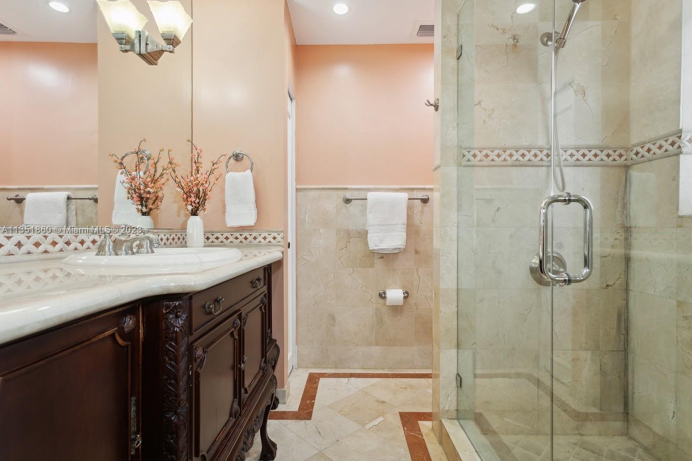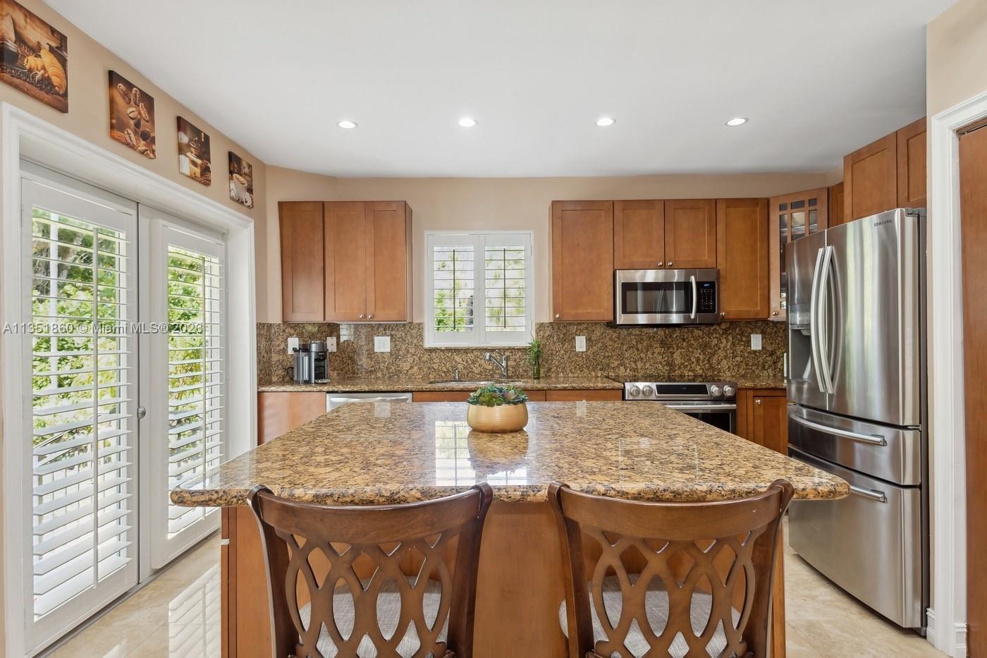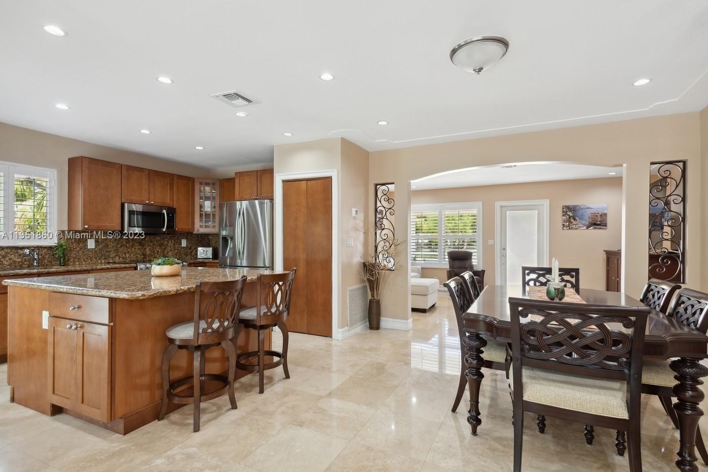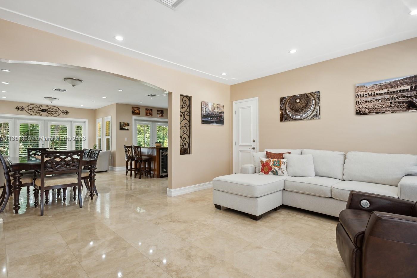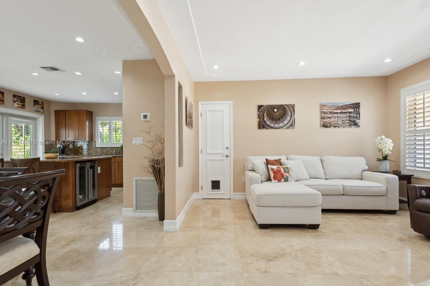 Charming and elegantly updated Gables gem! Enter into this beautiful move in ready, open floor plan to experience the perfect ambiance offering Impact windows /doors, immaculate neutral travertine and hardwood floors, plantation shutters throughout and a new Carrier A/C with u.v. light, new duct work and PVC plumbing. Perfect for intimate gatherings with an over sized island with seating, temperature controlled wine cooler, stainless steel appliances ,wood and granite kitchen, including a full house Generac generator. Crown molding with delicately designed sculptured ceilings, recessed lighting and a full 2 car garage make this the perfect oasis to include outdoor relaxation on the Chicago brick patio among mature and meticulously manicured foliage with a park like setting. Welcome Home!