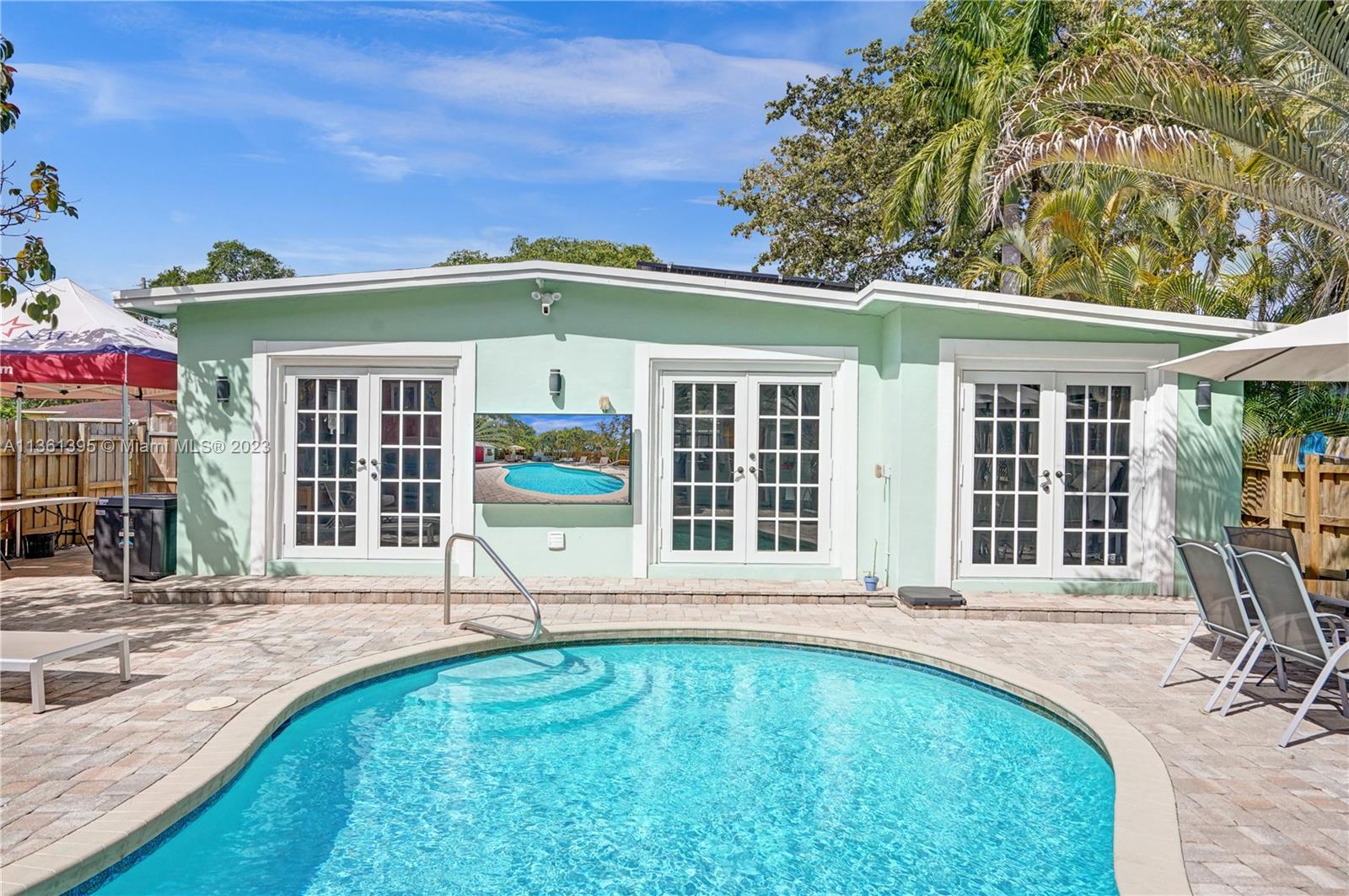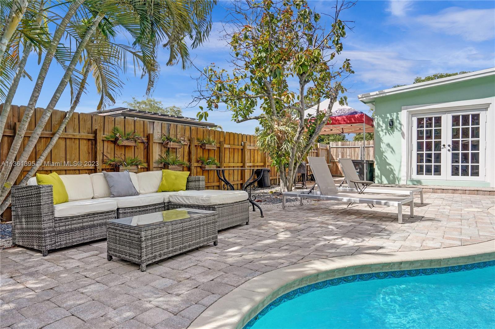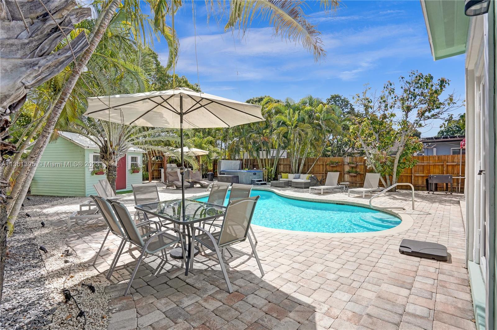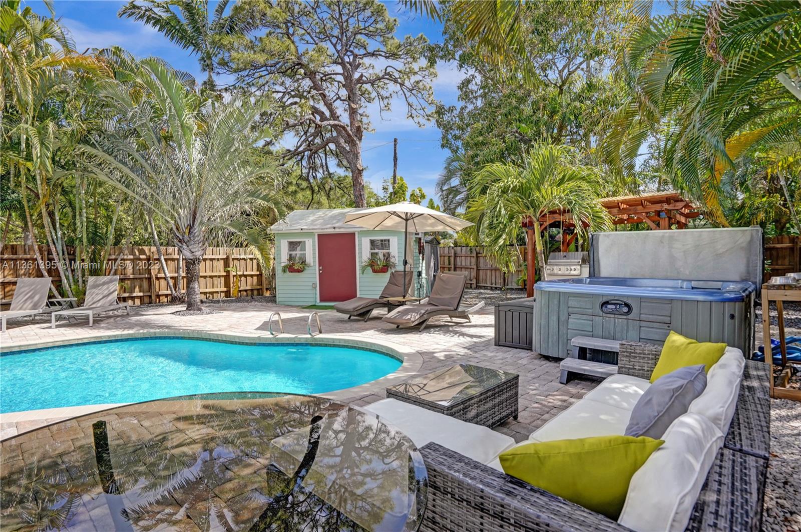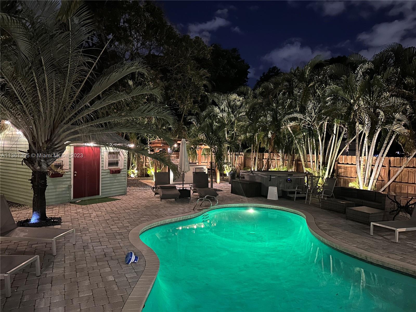 Live or Air B & B the Florida dream in this beautifully renovated 3/2 Pool Home plus cottage. This one has it all: 3 bedrooms 2 baths plus cottage, open plan, stunning updated kitchen and baths, large pool with heater and chiller, Hot Springs Spa, impact windows & doors & accordion panels, Tropical Kitchen, roof top whole house solar panels, car charging station, on demand tankless hot water, low maintenance tropical rock garden, 7 car parking. Open flexible living space and chef’s kitchen with stainless steel appliances and granite counters. The split bedroom plan ensures privacy for the primary bedroom. French doors from the Primary bedroom, main living, and guest bedroom lead to the garden oasis where you will splash, soak, relax, barbecue and dine amongst exotic palms and fruit trees.