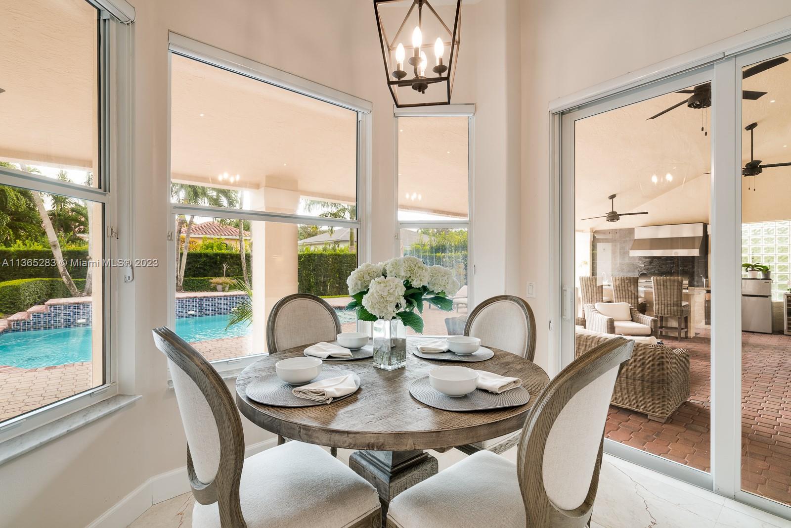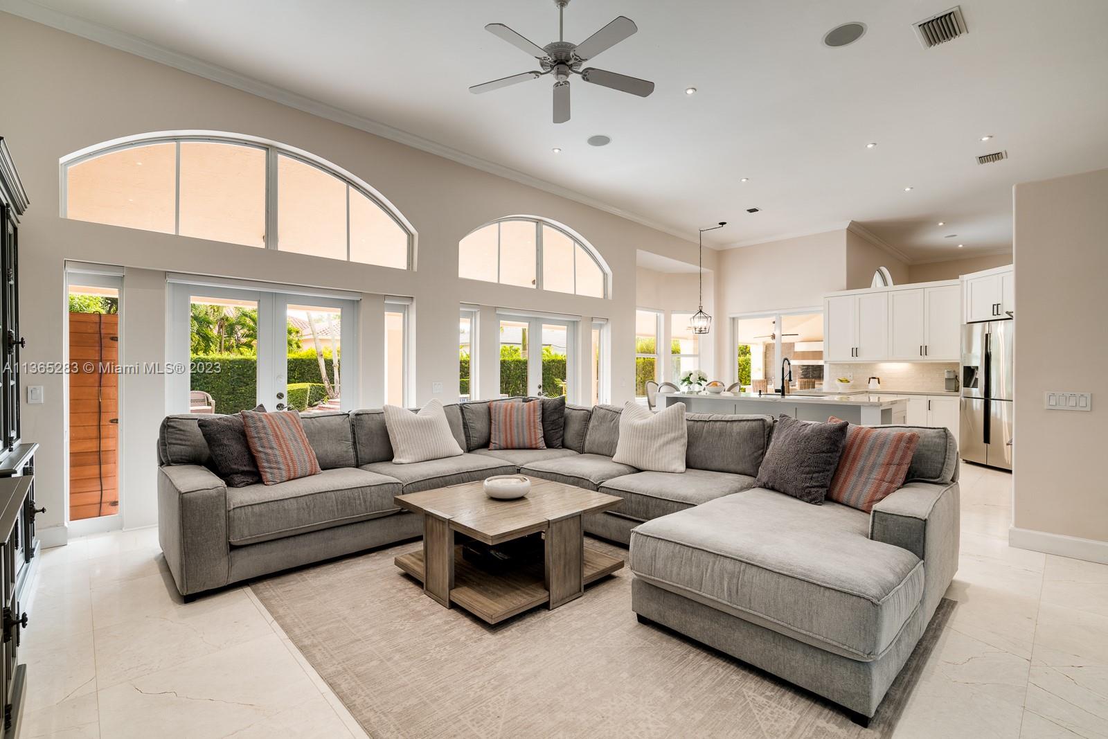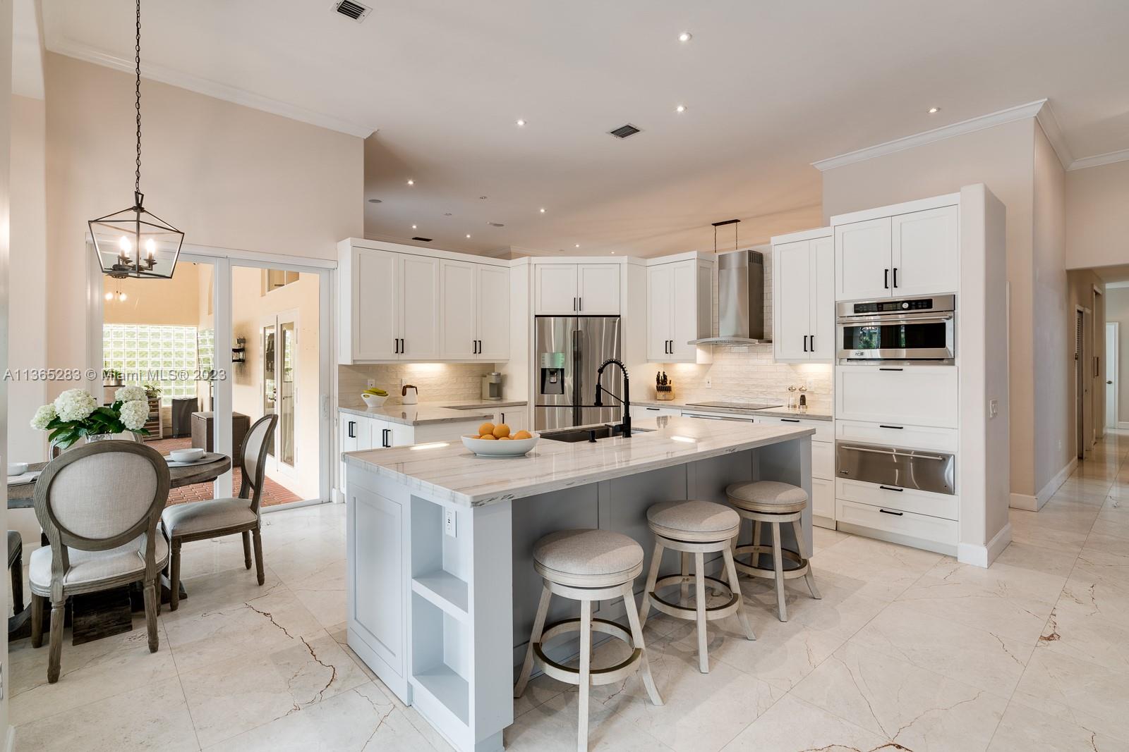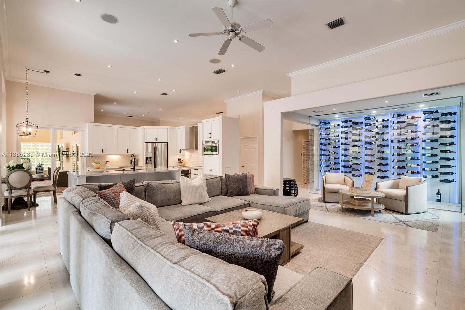 Modern 4 bdrm/ 3 bath remodeled beauty. Soaring volume ceilings & fantastic natural light. Grand formal living rm & dining rm. Stunning, glass enclosed wine storage is an art piece while also offering functionality for your wine collection. Spacious family rm opens to a true gourmet kitchen, featuring Turkish marble floors, eat in island seating, white cabinetry, quartz countertops & breakfast area. Lovely primary suite w/ spa-like bath, double vanities, shower, jetted tub. Impact windows/doors. Fantastic summer kitchen w/BBQ & expansive covered patio, pool w/ water feature, lovely yard has privacy hedge & plenty of seating space, all perfect for summer afternoons entertaining family & friends. Indoor laundry room. New AC, security system. 2 car garage.
