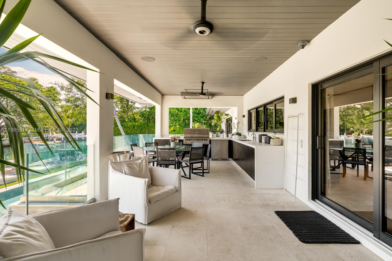 Spectacular completely remodeled waterfront home in sought after Key Biscayne. Beautiful one story with open floor plan, stunning water views and abundant natural light. Enjoy the Tropical Key Biscayne lifestyle with a modern architectural design. Ideal floorplan with primary bedroom and 3 kids bedrooms on one side, plus a guest room, and staff quarters and a separate 1/1 Gym/ Guesthouse. Exquisite custom finishes featuring Limestone and Marble floors, Italian Kitchen and doors and top of the line materials throughout. Covered terrace with summer kitchen overlooking the pool and patio area. Private dock with direct ocean access.