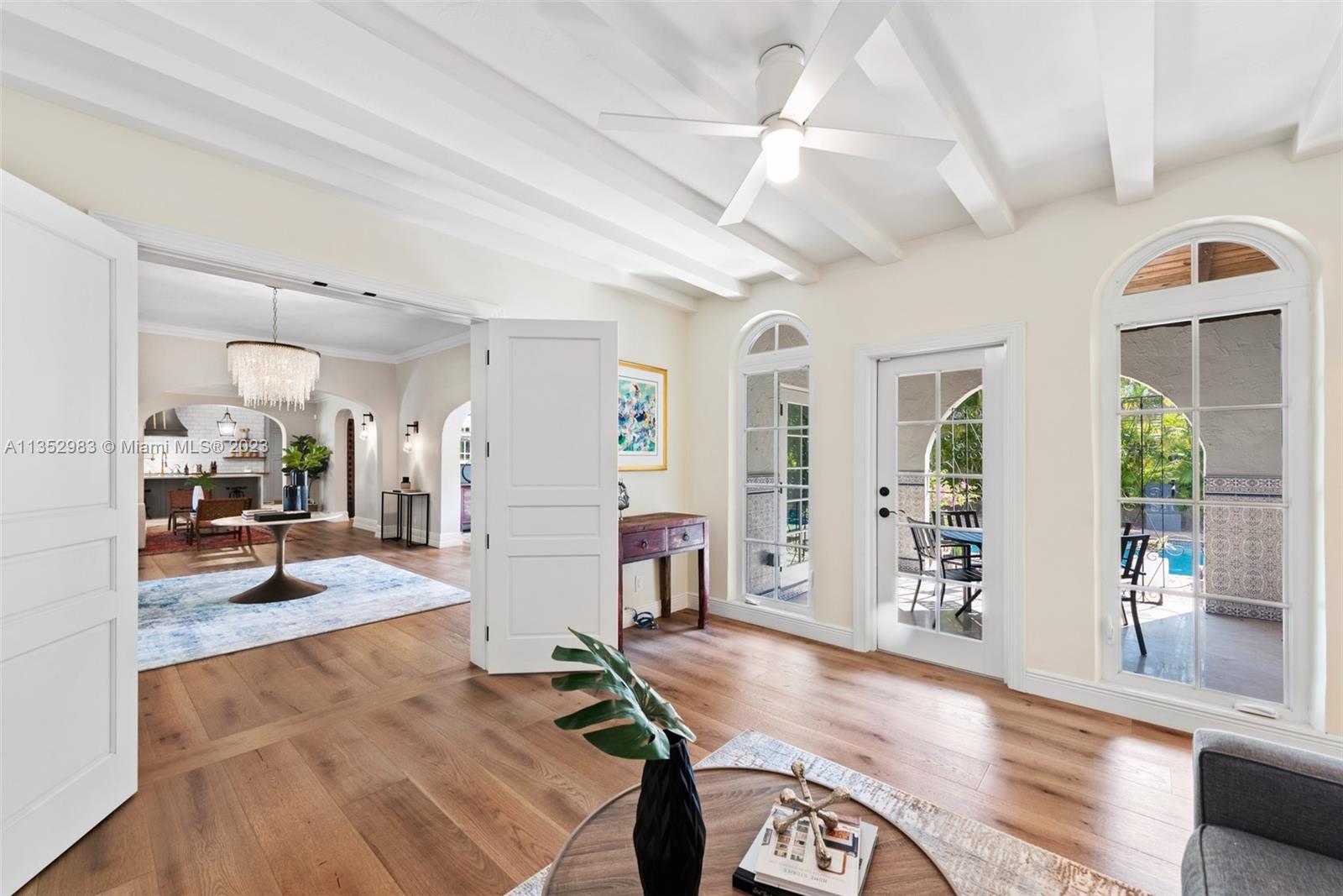 Boasting a unique combination of character and history, stunning designer updates, and a highly-coveted location on storied Columbus Blvd, this property is an absolute dream. The modern upgrades throughout the interior perfectly complement the character & charm of the original 1925 architecture, resulting in a flawless blend of old and new. The private primary suite includes an office, sitting room, & luxurious bath, while 5 additional en-suite bedrooms, a dedicated office, & full guest/in-law quarters provide ample space for family & friends. Outside, you'll find a beautiful pool, brick patio, and summer kitchen, perfect for relaxing or entertaining guests. Impact windows & doors, newer roof, and stunning canopy of banyan trees provide the finishing touches on this impressive Gables home.