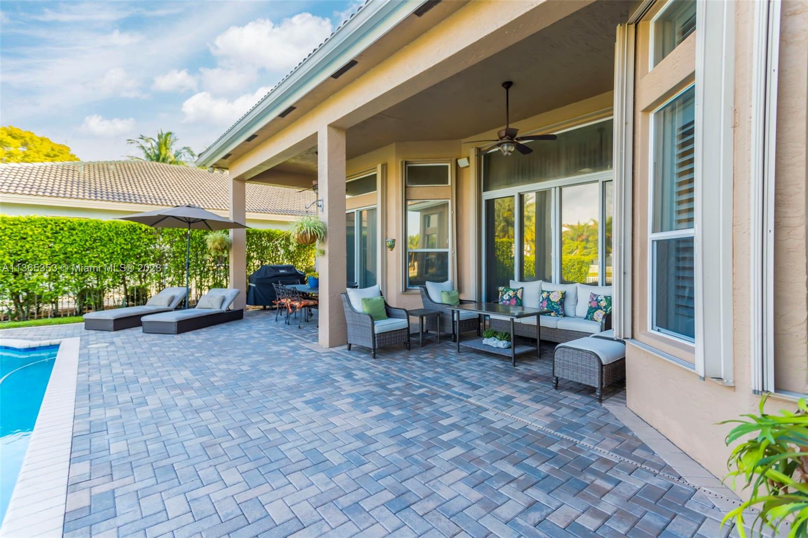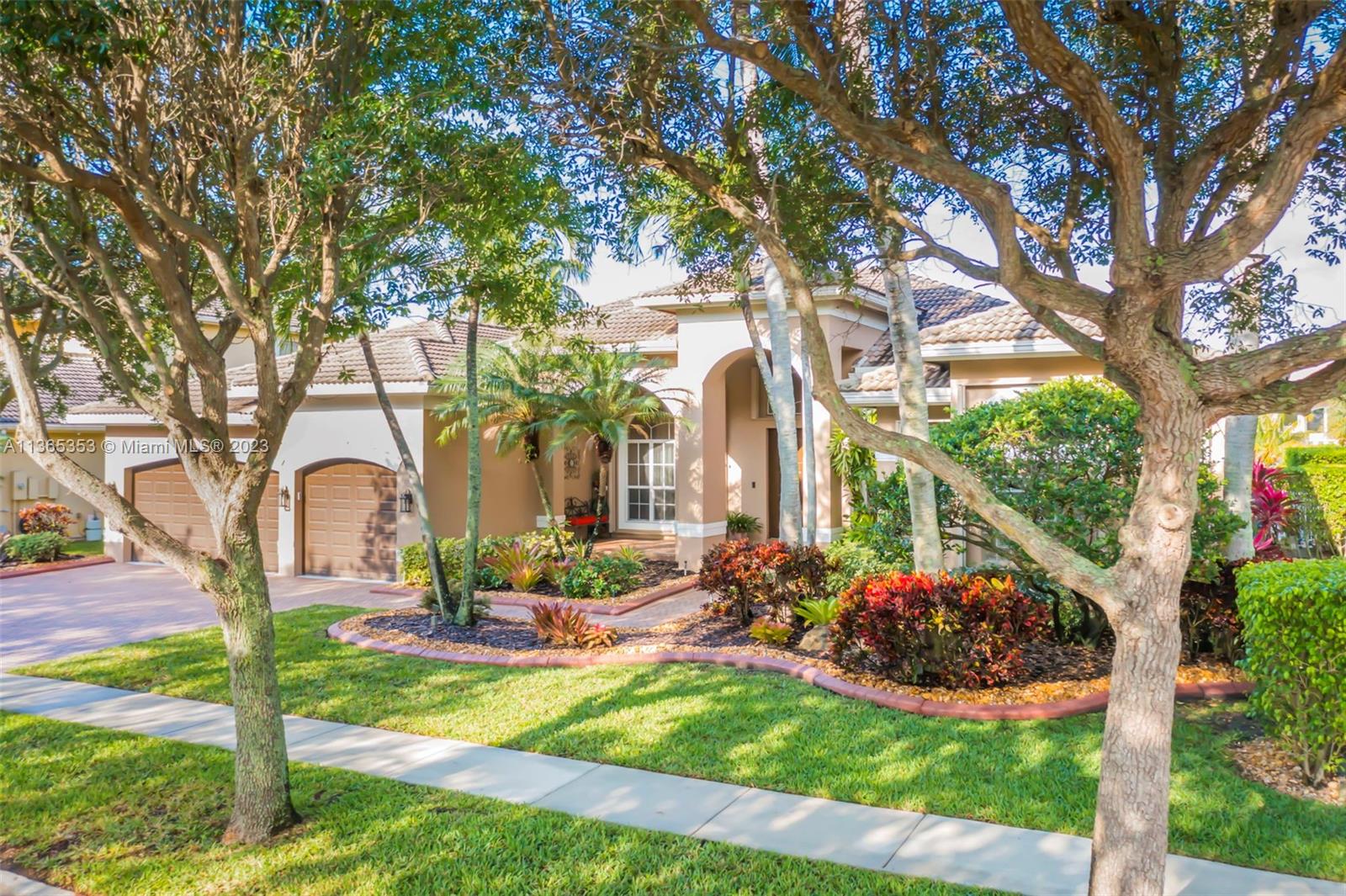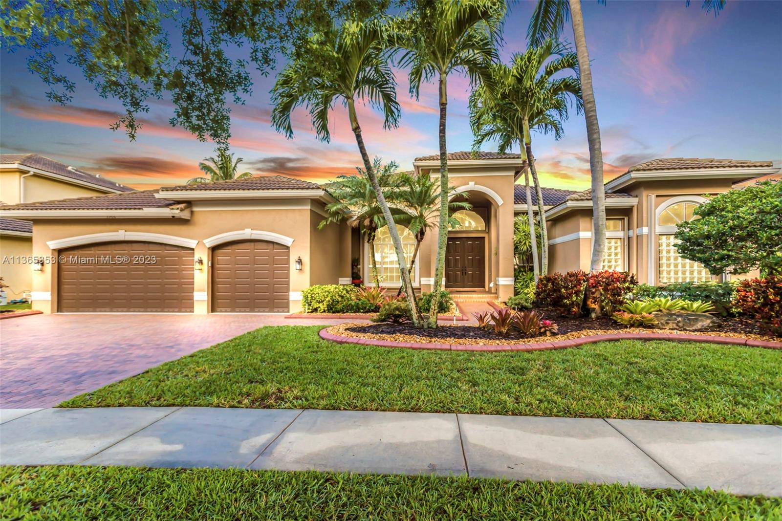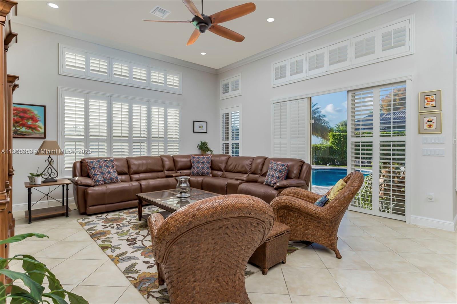 Stunning home in the sought after guard gated section of Majestic Falls in Sunset Lakes. This highly desired Caliterra model is privately located on a cul de sac street w no thru traffic.Its amazing lush landscaping awaits you. Interior features an abundance of natural light, plantation shutters, & new flooring throughout.The kitchen boasts all GE SS appliances, a snack bar & a breakfast nook. Butlers pantry located off of the dining room. Primary suite features 2 large walk-in closets & sliding doors that open to stunning lake views. Pavered Patio is complete w a covered area including a TV & speakers, perfect for entertaining.The beautifully resurfaced freeform pool includes a spa. Lots of greenery for kids & pets Brand new epoxy flooring in garage.Standby Interior photos coming soon.