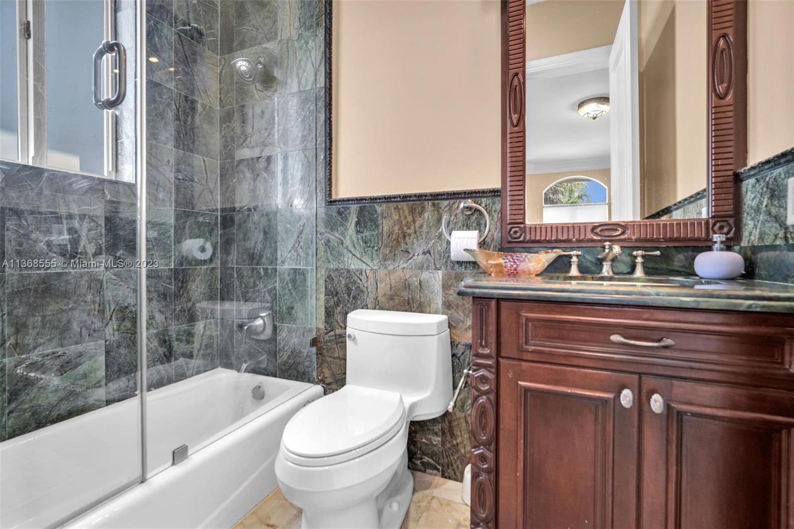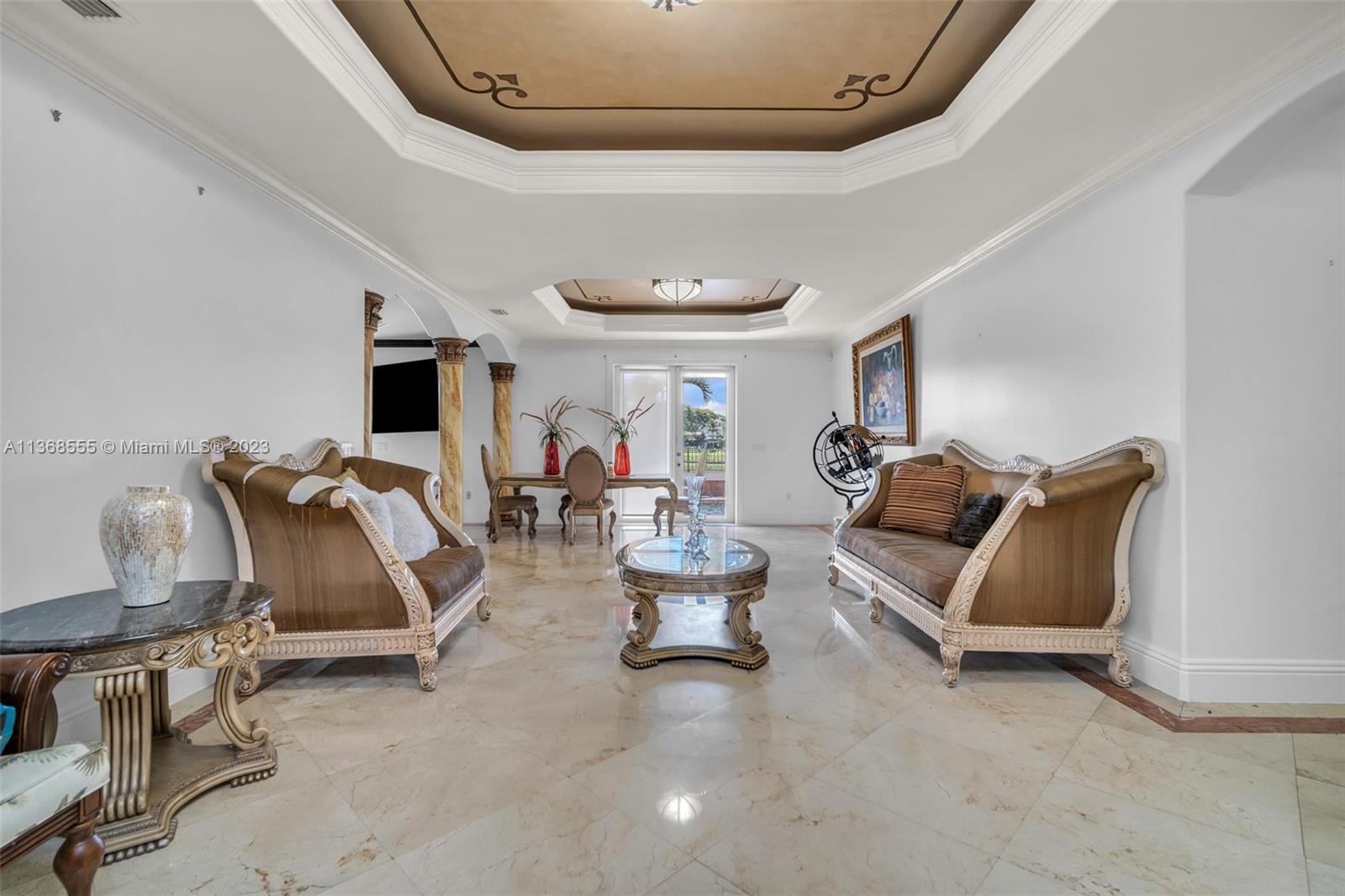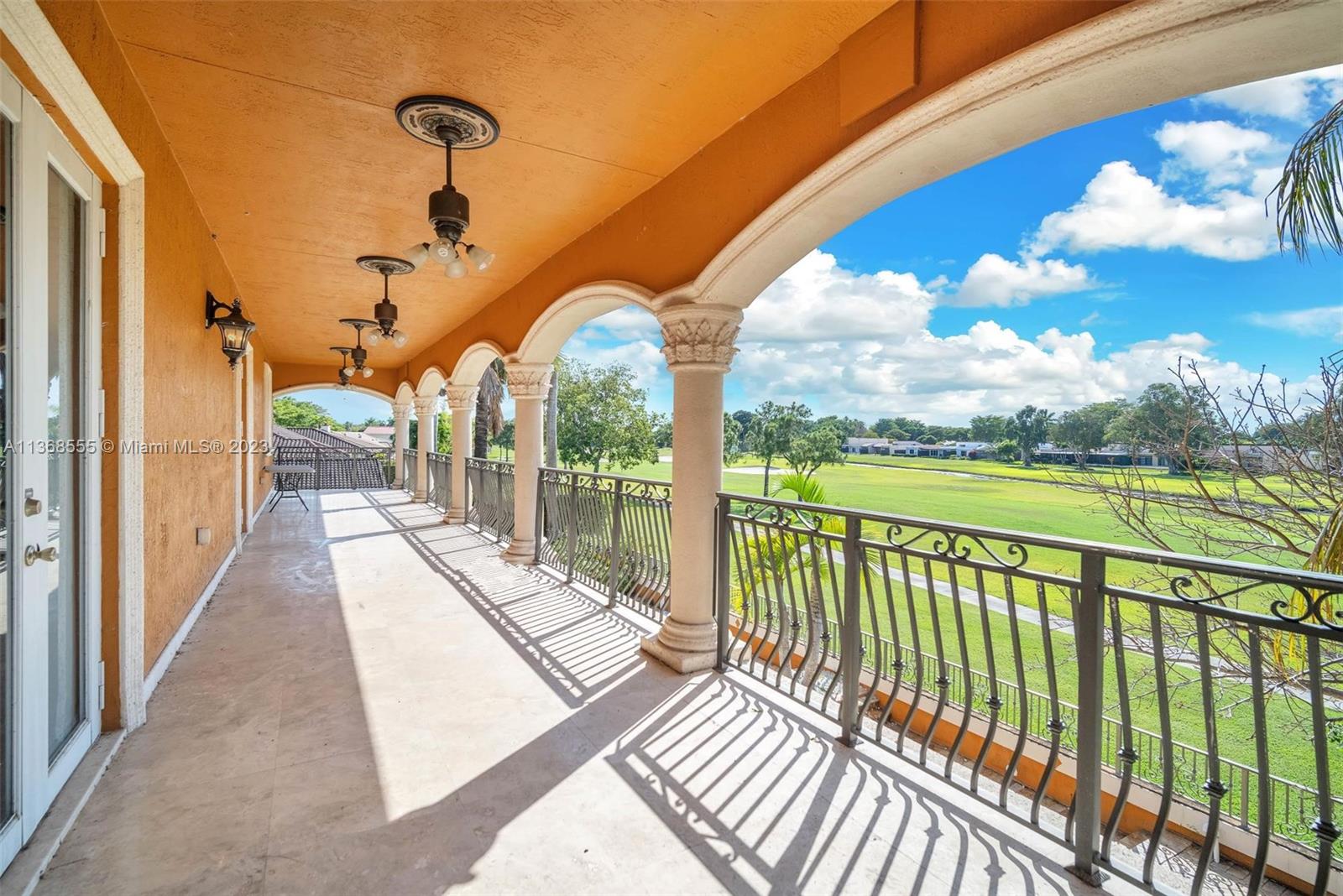 Luxury and elegance throughout this 2-story jewel! Resort style home includes pool & jacuzzi. Watch the sun set. A breath-taking view of the Country Club of Miami Golf Course. The picturesque detail on the ceilings complements the marble floors throughout the home. Custom cabinetries adore the walls of the kitchen which is adjacent to a spacious formal dining area. Each bedroom is oversized and accommodates family members with private bathrooms. This split-level floor plan also has a full downstairs bedroom for your guest to enjoy. Experience sophistication at its best as you open custom French doors leading to an extraordinary huge upstairs master bedroom with an enormous sitting area and equally large bathroom. Large balcony. Welcome home, this is a must-see property!
