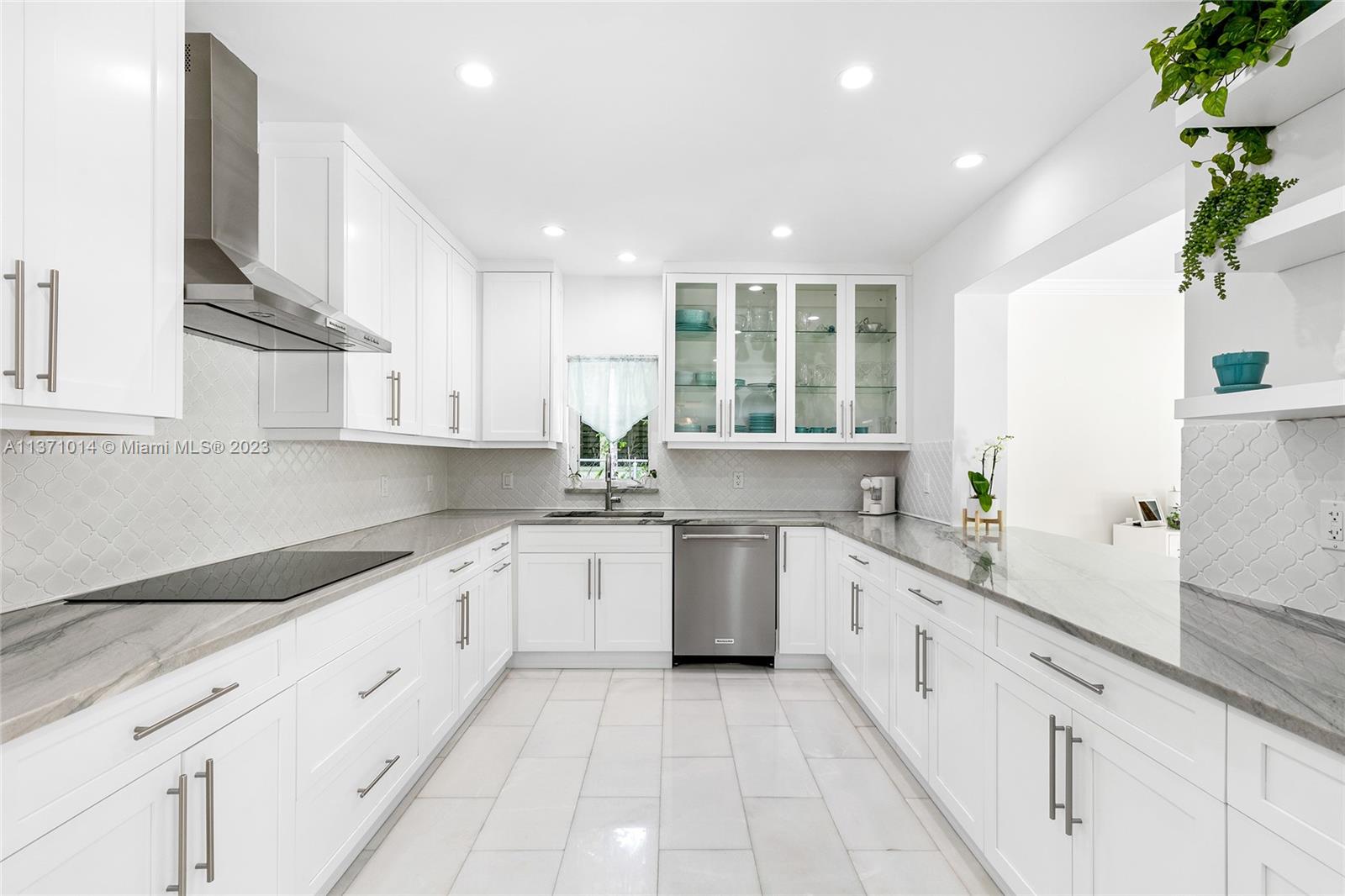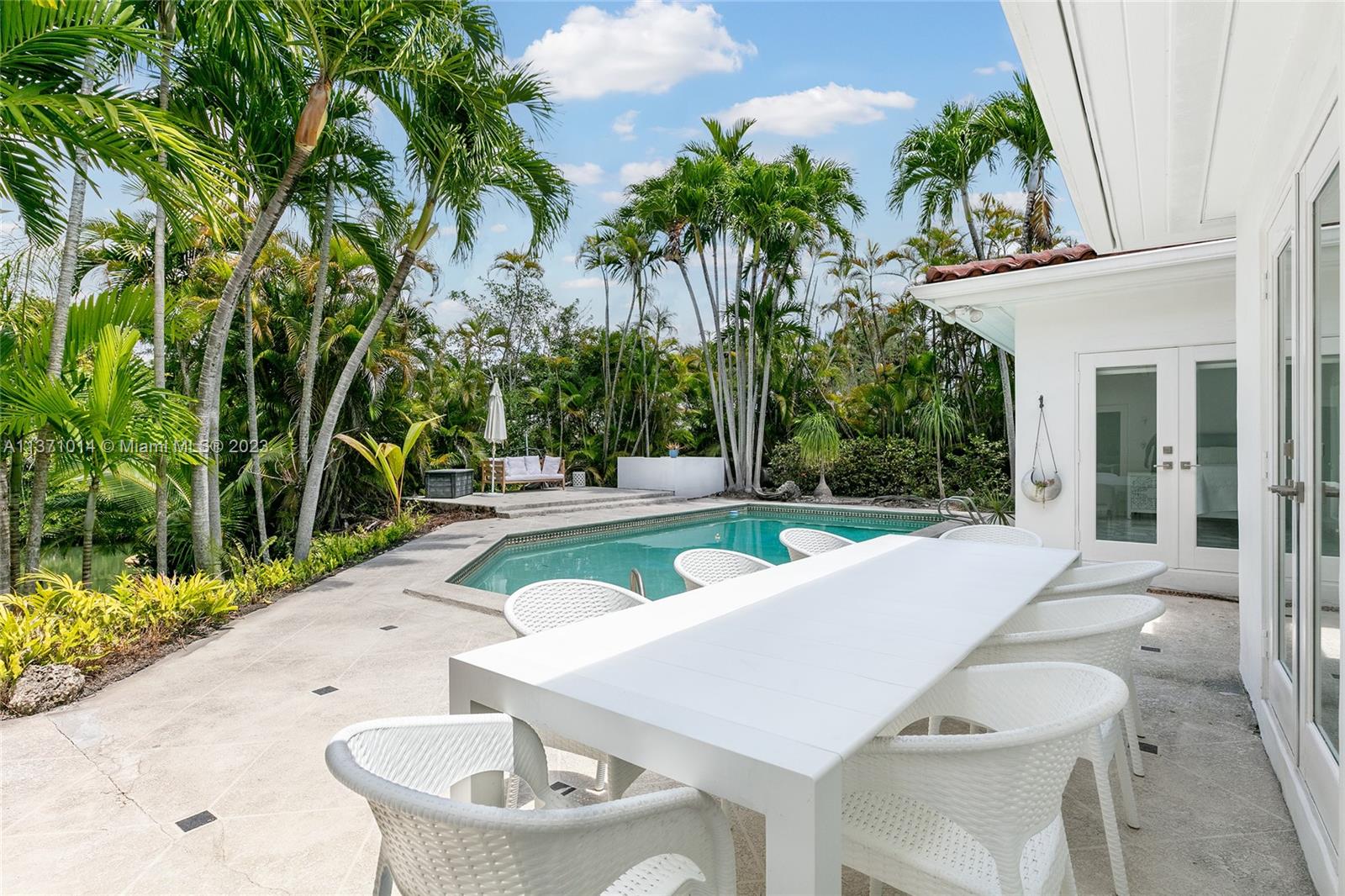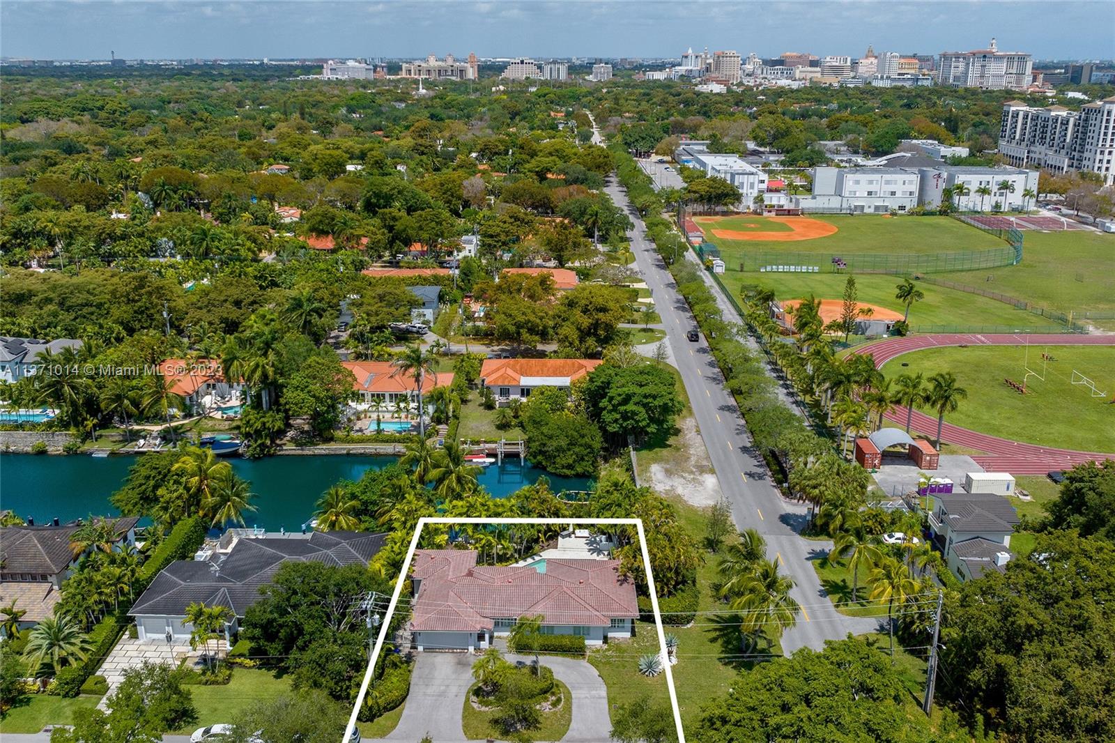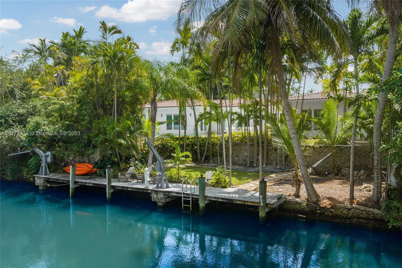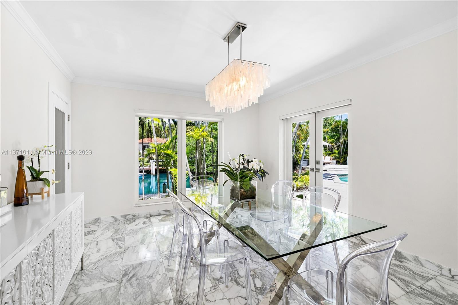 This elevated ranch style home sits on the intracoastal waterway on a 12,000 SF lot in a quiet family neighborhood in Coral Gables. The 4BR/3BA home features Statuary marble floors, high ceilings, spacious living room & private dining area w/large windows that provide direct views to the large pool deck & waterway. An open kitchen sports Kitchen Aid appliances, Quartzite counter tops plus a breakfast area. Elegant principal suite offers direct waterway views, & beautiful principal bath w/glass shower & soaking tub. The other 3 BRs are each well proportioned. Outdoor highlights incl. large pool w/cabana bath, large palms, a boat lift & private wood dock. Hurricane impact resistant windows/doors, laundry room & 2 car gar, plus amazing central location complete this offering.