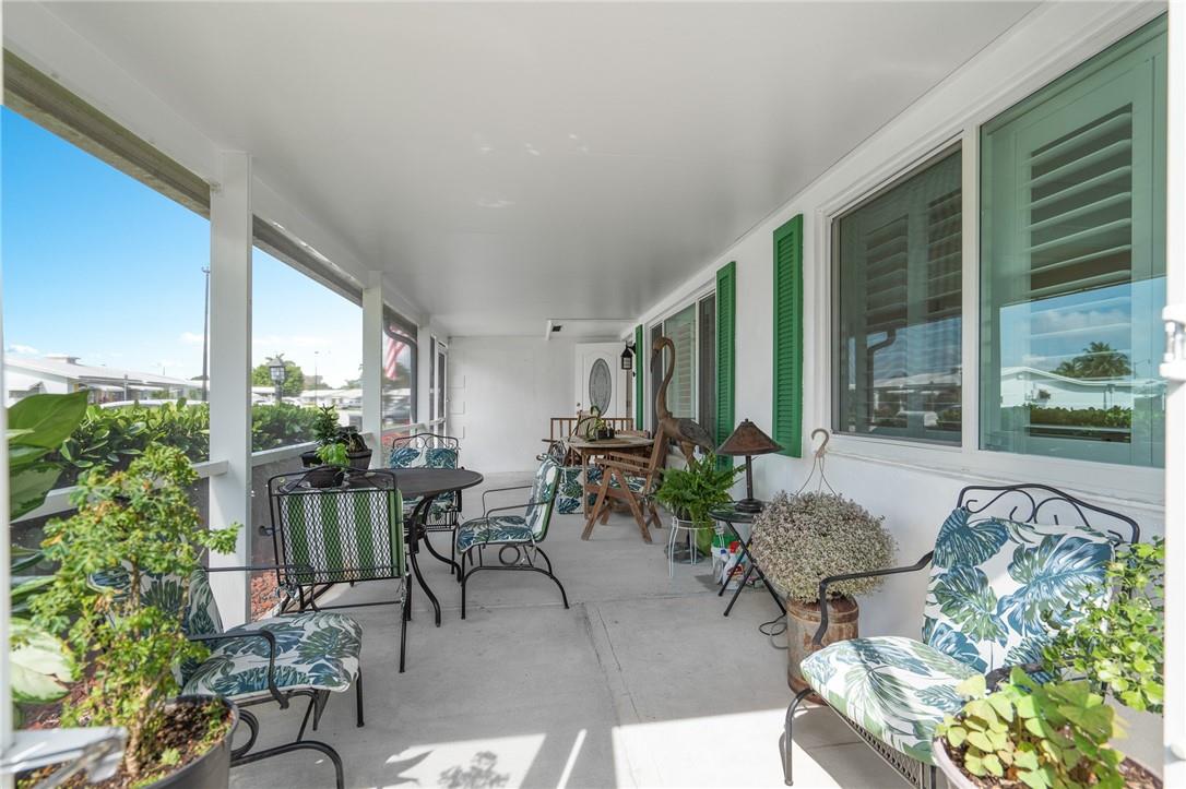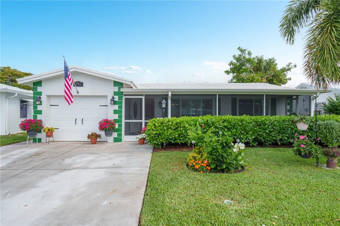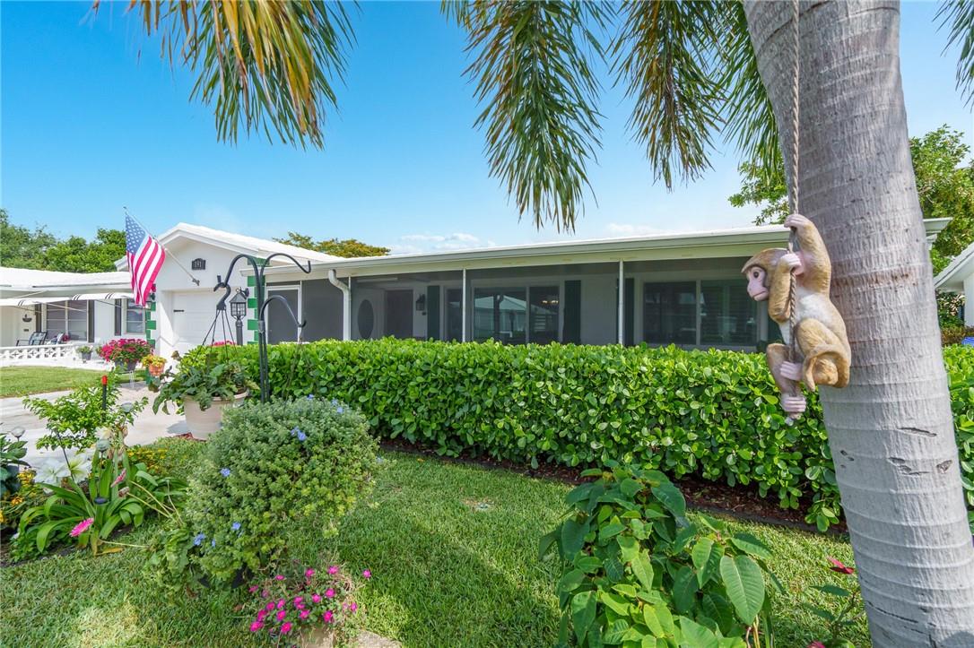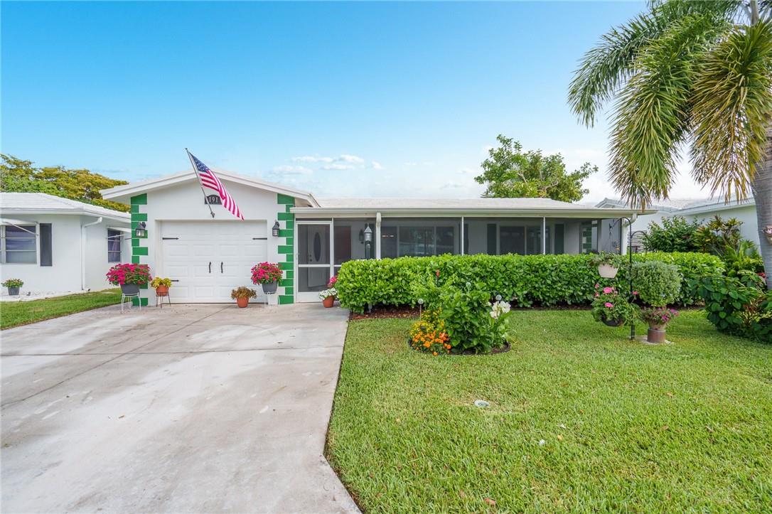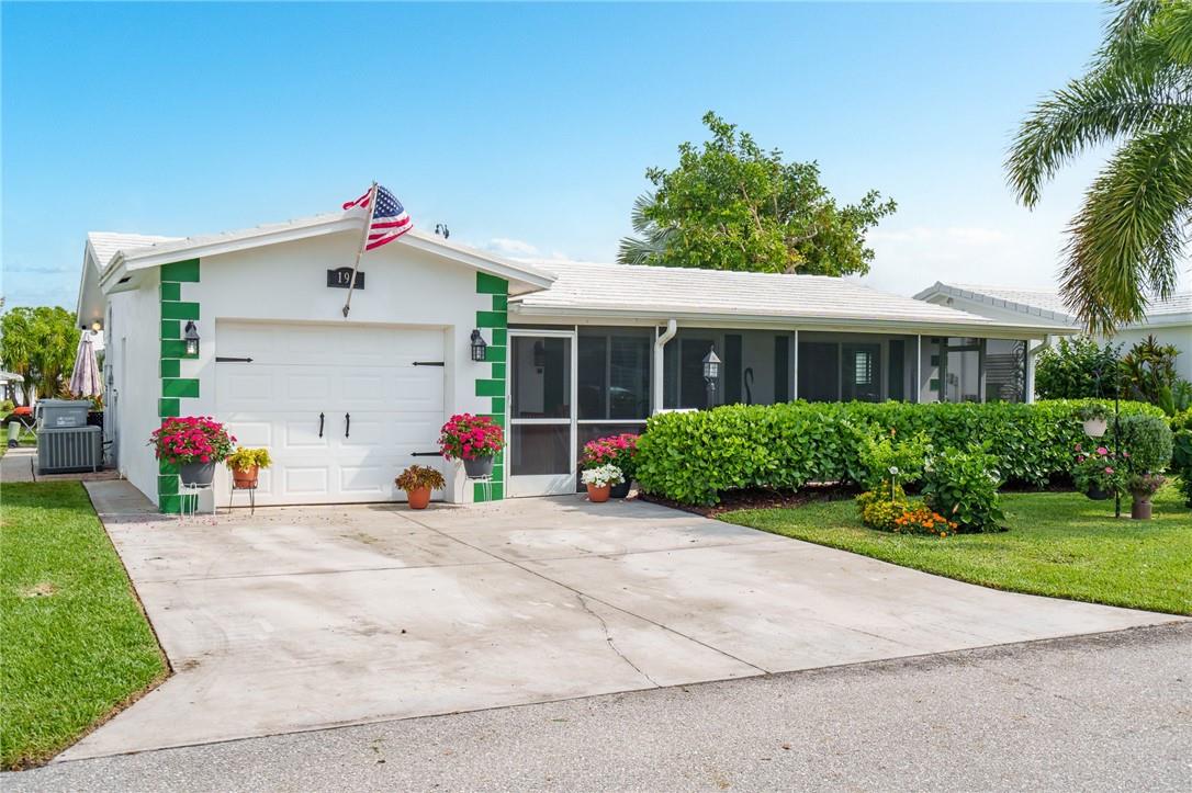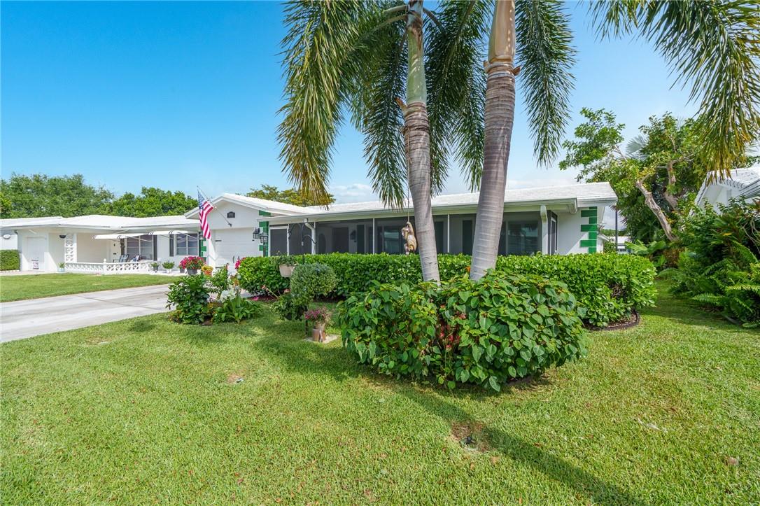 Tropical landscaping surrounds this beautifully remodeled 2/2 w garage,10'x30 att. screened front porch & patio area perfect for entertaining &relaxing. Great location situated steps from clubhouse & community pool. Updated throughout featuring kitchen cabinets & granite counters, stainless steel appliances. Bathroom vanities feature granite tops, tiled bathroom walls and showers.24" porcelain tile throughout living area + crown molding & plantation shutters. Spacious Florida room. Hurricane windows & doors throughout, new electrical panel, A/C 2016. W/H 2020. 55+golf community amenities include 2 pools, house painting, courtesy bus, water/sewer, landscaping and lots more. Monthly Assoc. fee $274. $350 application fee. One time capital contribution $200. Minimum credit score $700.