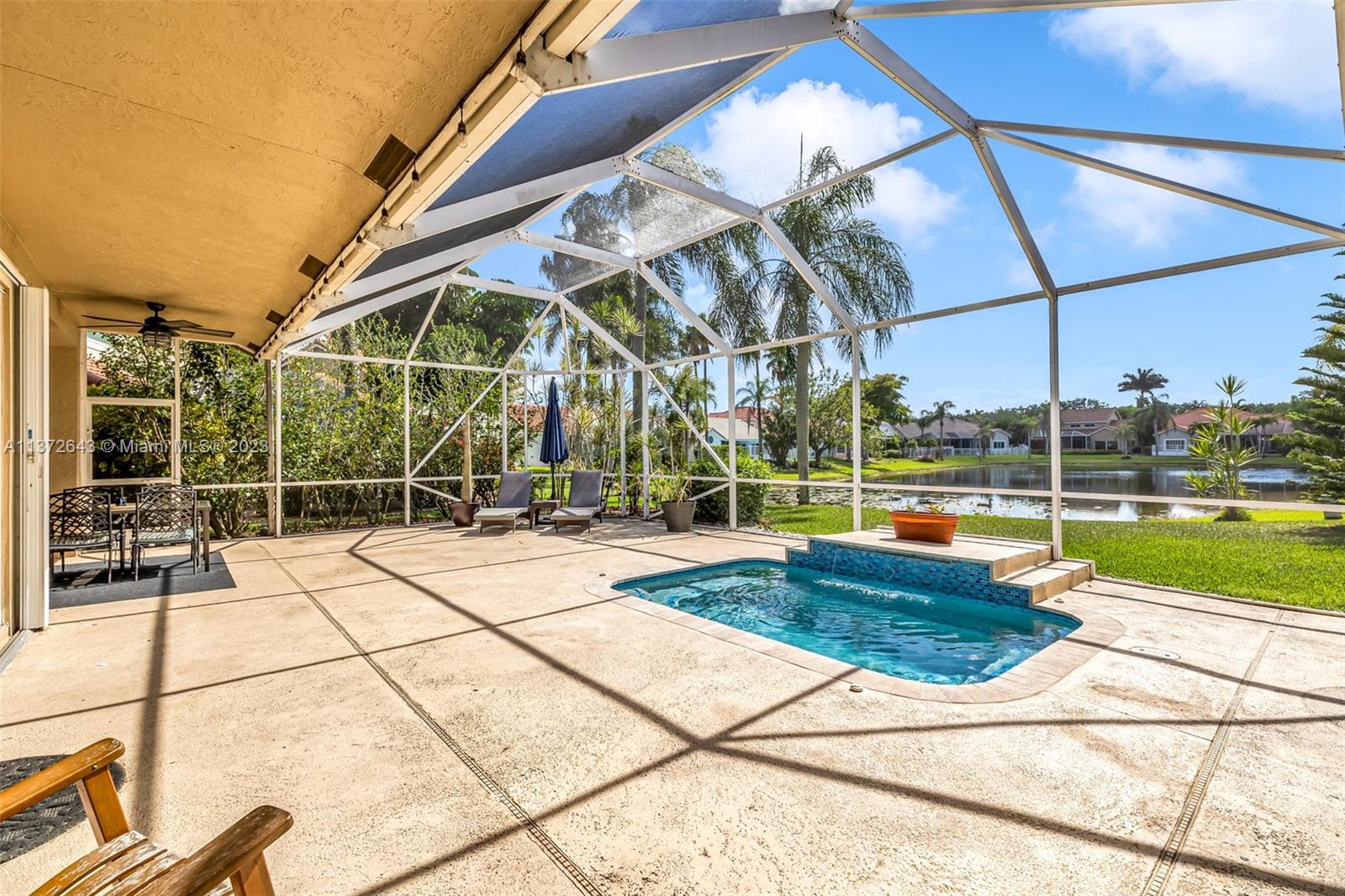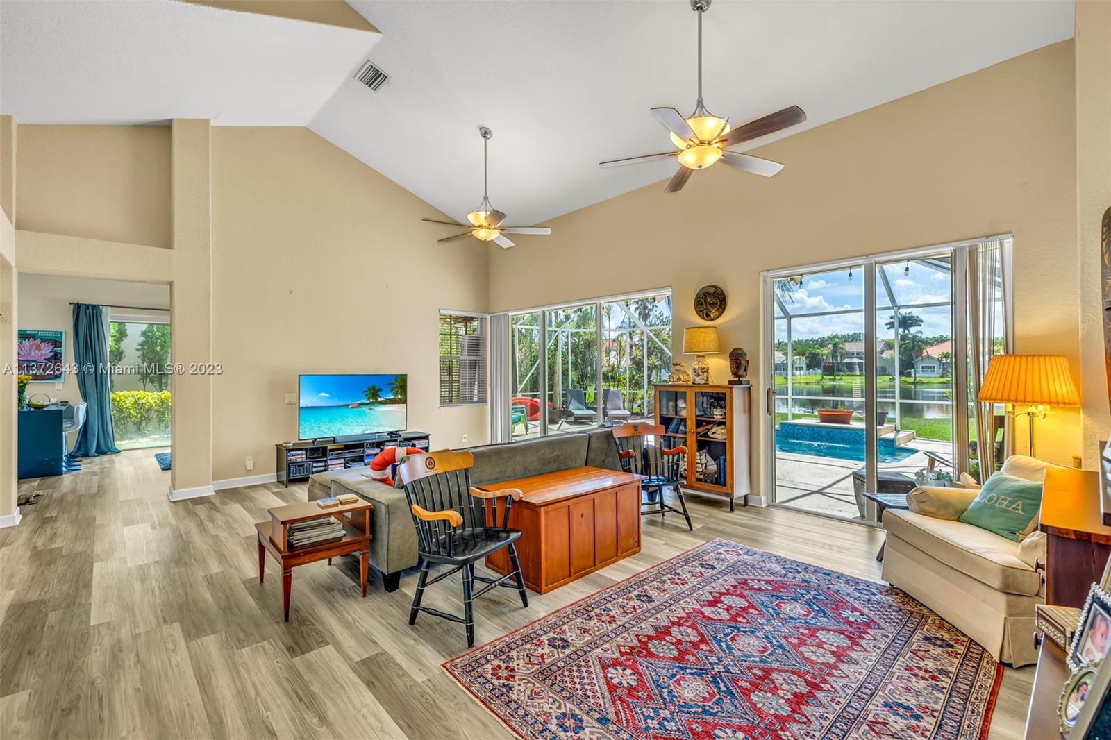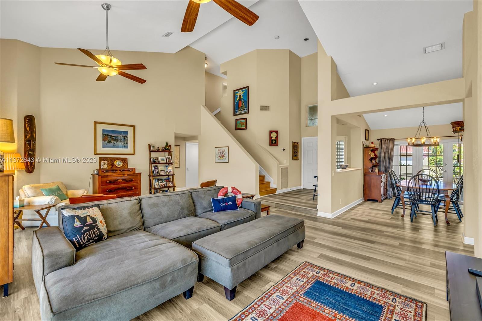 This distinctly cozy home welcomes you with a sizable & homey environment in a beautiful setting. Offering an excellent layout with high ceilings & wrap-around sliding patio doors in the lower level, incorporating light & the outdoors. New lower level flooring, formal dining with access to courtyard, comfortable kitchen w/ beautiful cabinetry, quartz counters & plenty of storage options. Primary suite w/ ample closet space. The large en-suite bathroom also serves as cabana bath. Upstairs features real hardwood flooring, 3 Br's + bath. Updated A/C & electric panel, garage door & accordion shutters. Relax in the privacy of your screened lanai & heated pool/spa w gorgeous views. Laguna Springs is a hidden gem of just 106 homes, ideally situated, steps from schools, parks & places of worship.