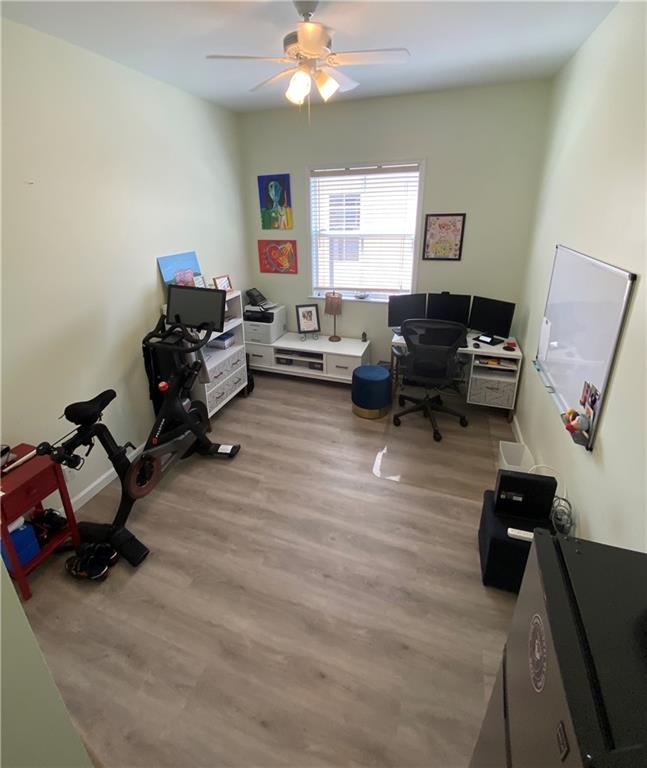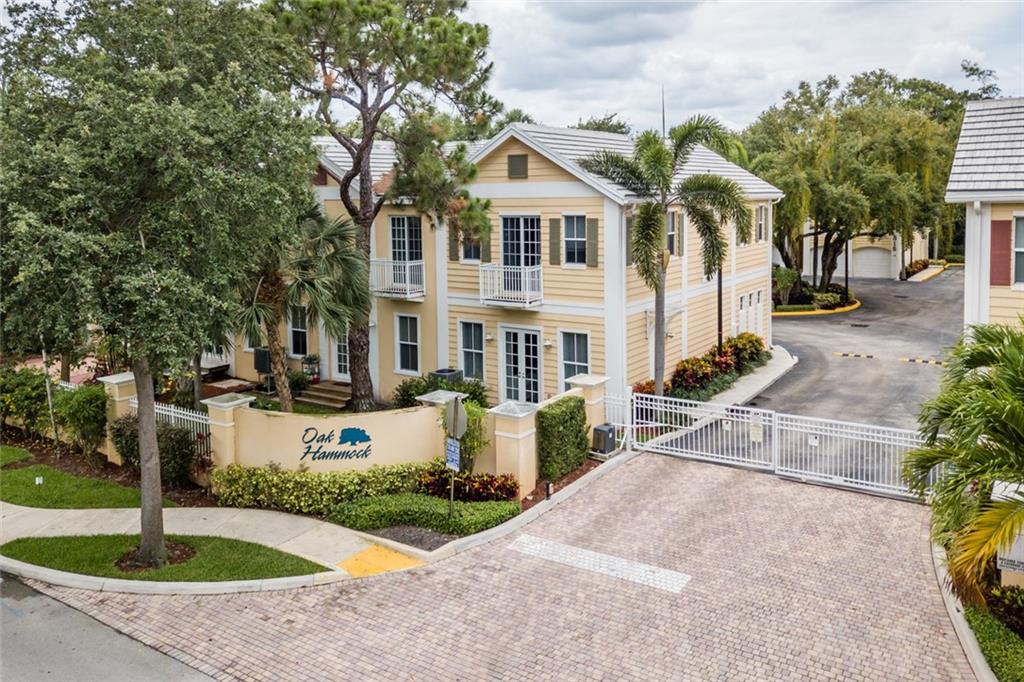 This airy, spacious townhouse is 1,874 sq ft and features 11' ceilings, wood grain vinyl floors throughout, a massive master bedroom w/balcony & extra lg jacuzzi & shower stall, custom closets in all 3 bedrooms, bonus den area on second floor makes a perfect office or play room for kids, upstairs washer/dryer, newer flooring & kitchen appliances, private fenced-in patio w/retractable awning & Impact windows. 2 car garage has a hydraulic lift to fit 3 total cars. Oak Hammock is a beautifully maintained gated community w/heated pool. It is a hidden gem - the only community offering this much space & garages in this price point so close to downtown Fort Lauderdale! Fee Simple Townhouse - buy this with as little as 3% down!
