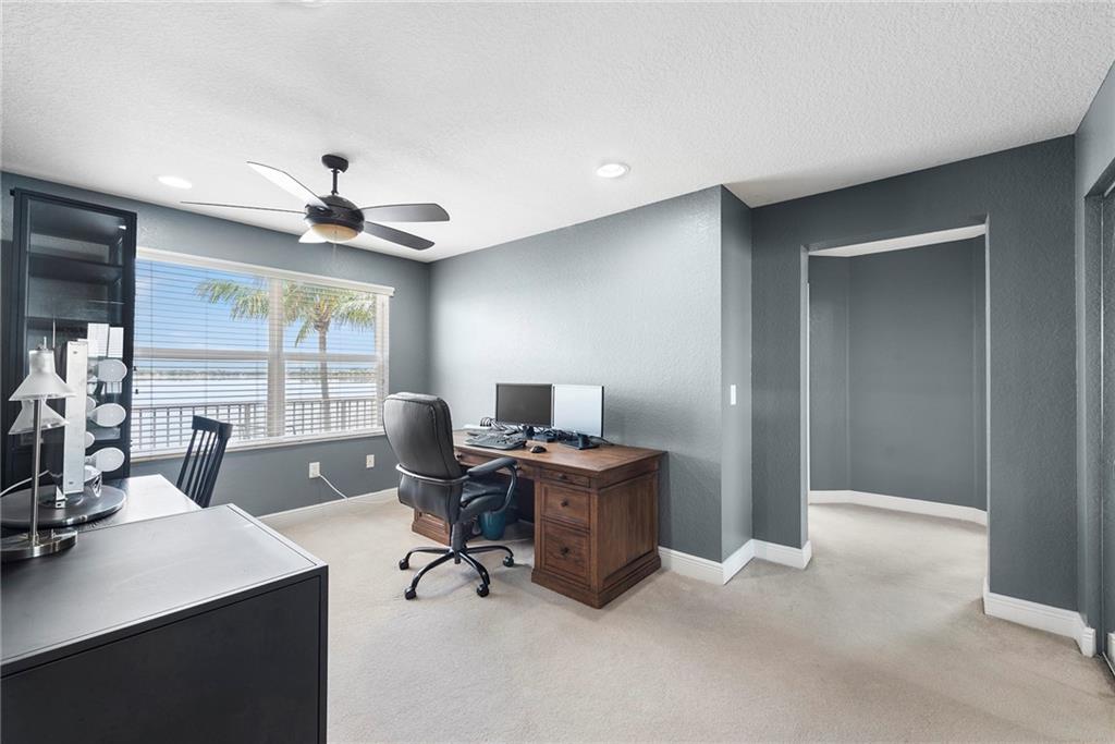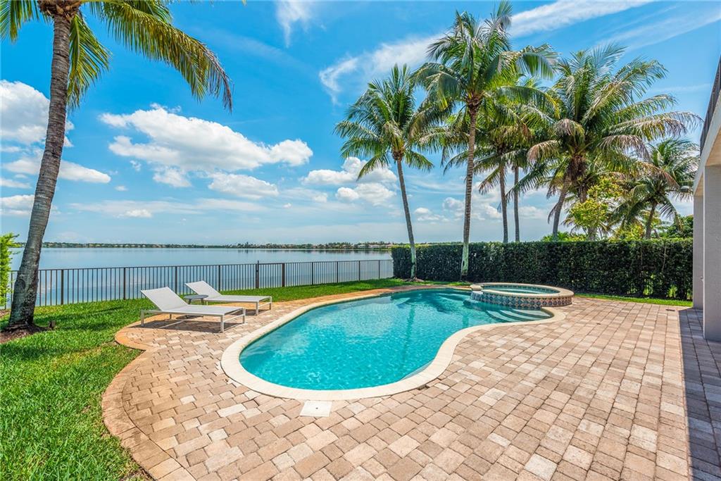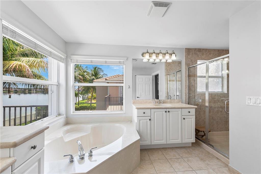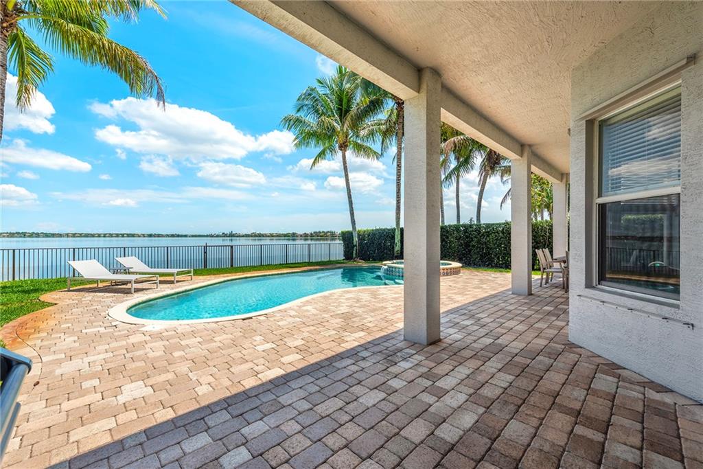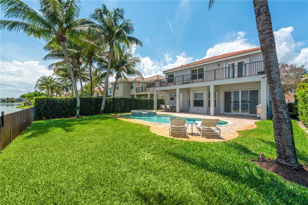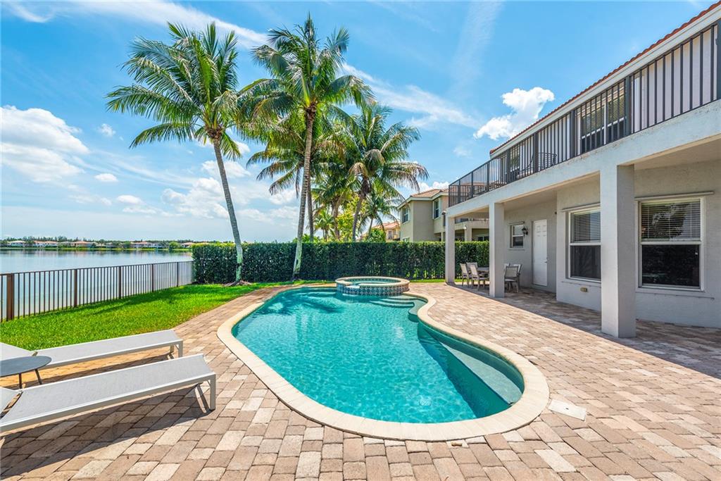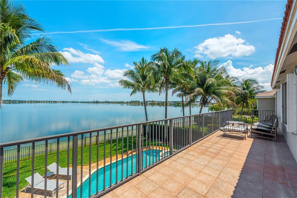 Spacious lakefront, pool home in Sunset Falls! This 5 bedroom, 4 bath home features a terrific floor plan with one bedroom & bath conveniently located on the first floor. The bathroom downstairs also has an exterior door & serves as the cabana bath. The primary bedroom upstairs has a private balcony the width of the house & full-size, separated sitting room - perfect for an office or nursery. The other 3 bedrooms & laundry room are all upstairs. Downstairs you can enjoy serene lake views from the family room and kitchen. Sunset Falls is a guard-gated community with community pool, tennis courts, basketball court & playgrounds.
