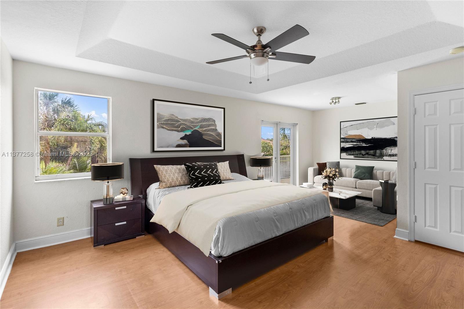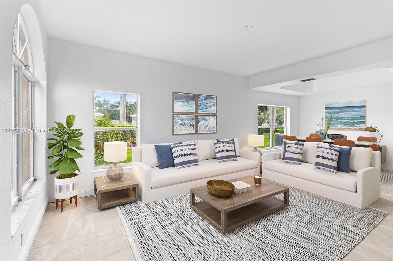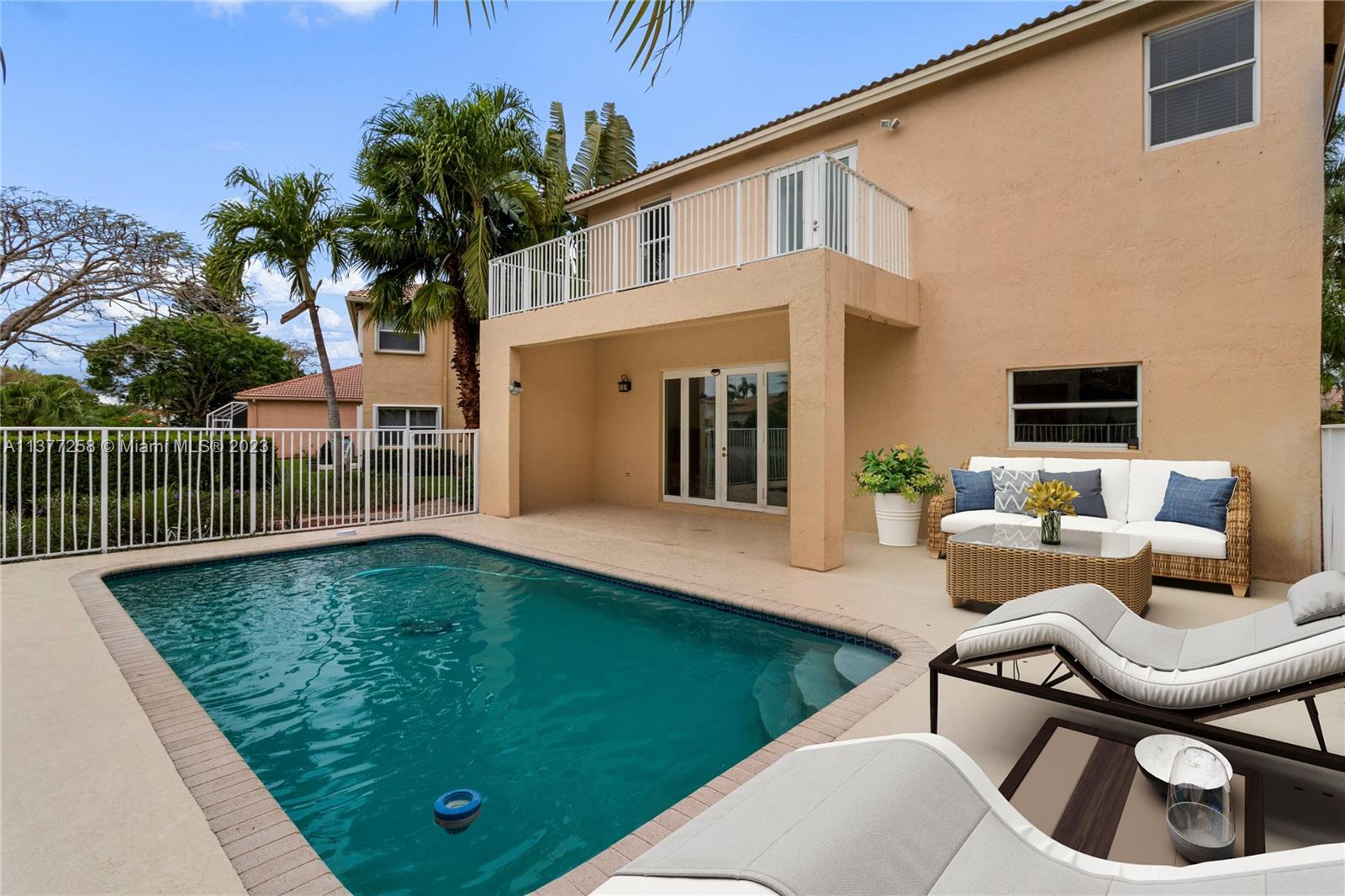 Best buy in Weston! Spectacular pool, lagoon & garden views abound from this two story 4 bedroom, 2.5 bath home located at Sapphire Isle in the Emerald Estates community. Features include updated kitchen & baths, marble floors downstairs & wood floors upstairs. Large primary suite offers sitting area, private balcony overlooking the pool and lagoon plus large walk-in closet & second closet, spacious primary bath includes dual vanities, tub & separate shower. All bedrooms are upstairs. Home is on a large fenced corner lot with meandering walk paths through lush, tropical landscaping. Community amenities include swimming pool, fitness room & playground. Outside the gates is Emerald Estates Public Park w/tennis & basketball courts, picnic pavilions & more. Furnishings are virtually staged.