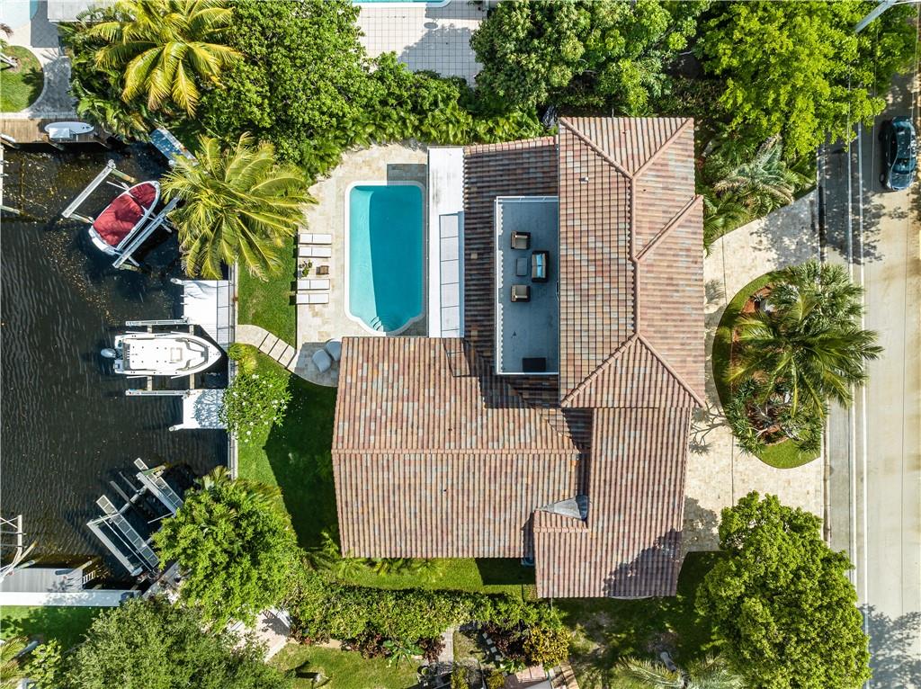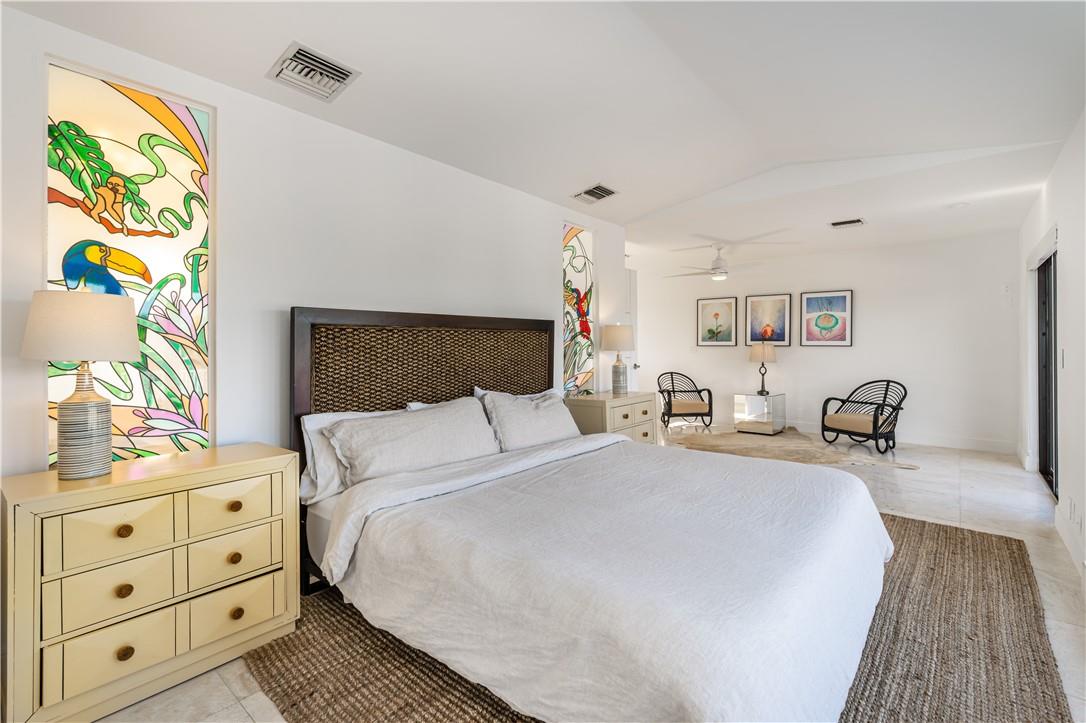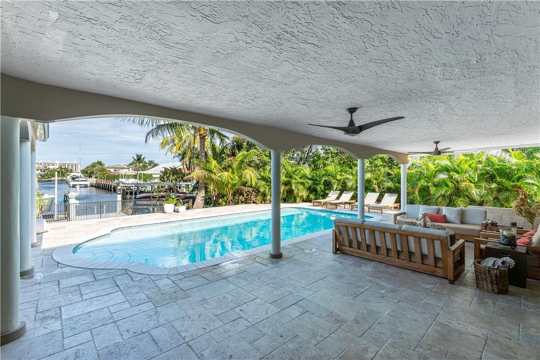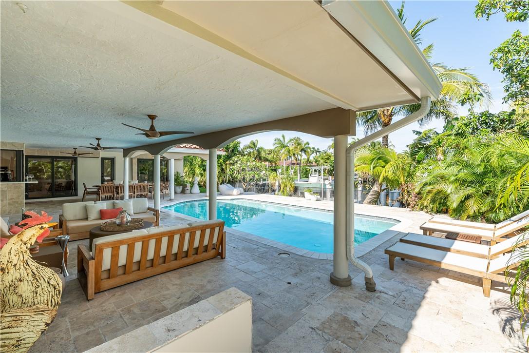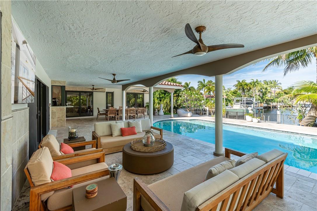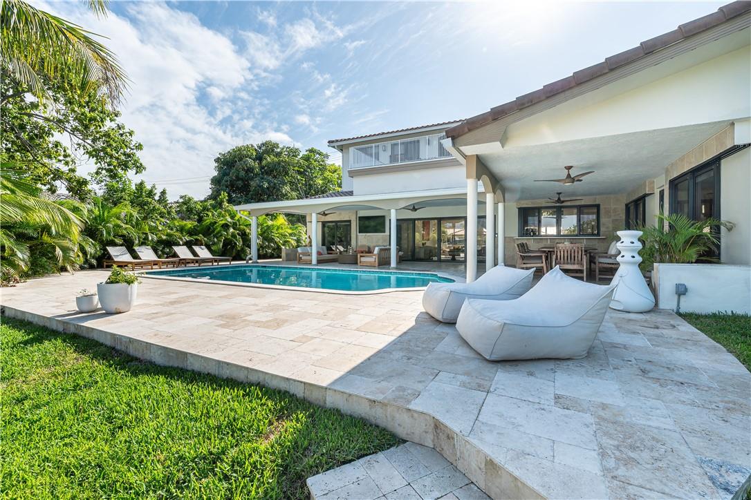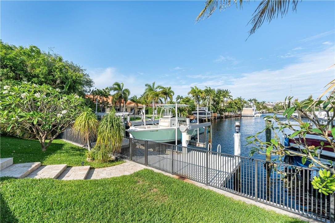 Modern, spacious, open & flowing floor plan, perfect entertaining inside & out. Large, beautifully landscaped waterfront lot, boat lift & very private back yard & pool. Great breezes & easterly view down length of canal. High ceilings & bright interior with impact windows & doors throughout. Huge covered patio & large heated pool. Spacious modern kitchen, island seating & pass through to patio bar. 5 bedrooms include separate guest wing with VIP suite. 3 bedrooms including an office occupy separate wing. Roomy master suite & sitting area opens to private balcony overlooking waterway. Walk-in closet & luxurious tub & shower. New AC, 2 car garage & circular driveway has lots of off street parking. Oversized lot has room for garden & grassed areas provide room for kids playground & dog run.