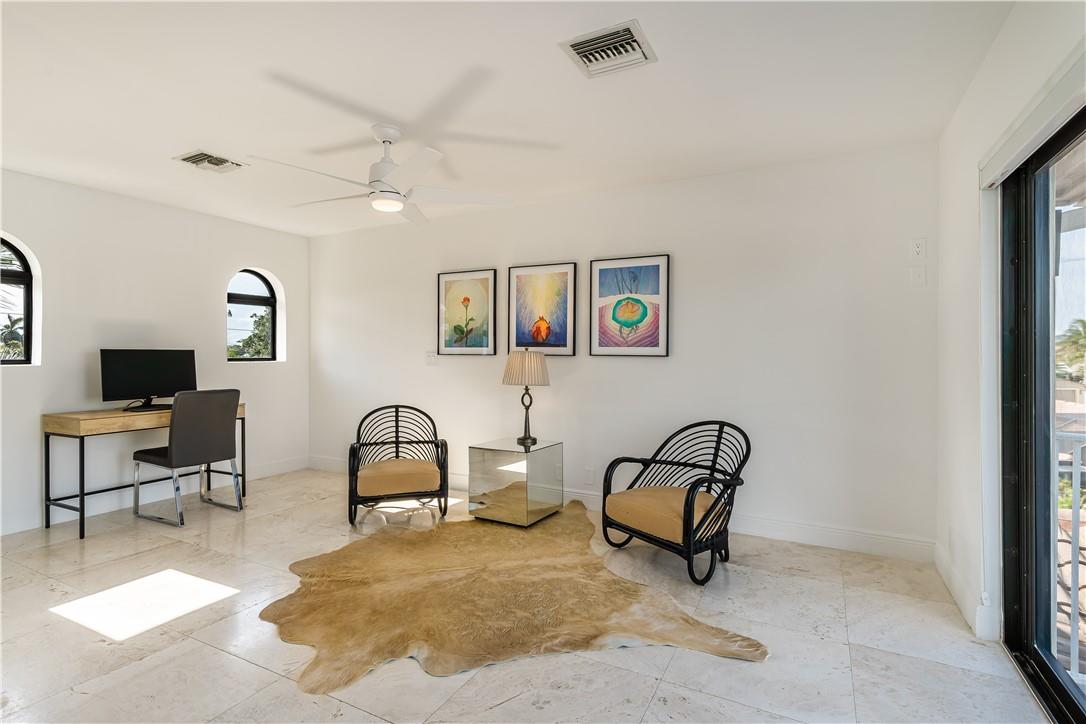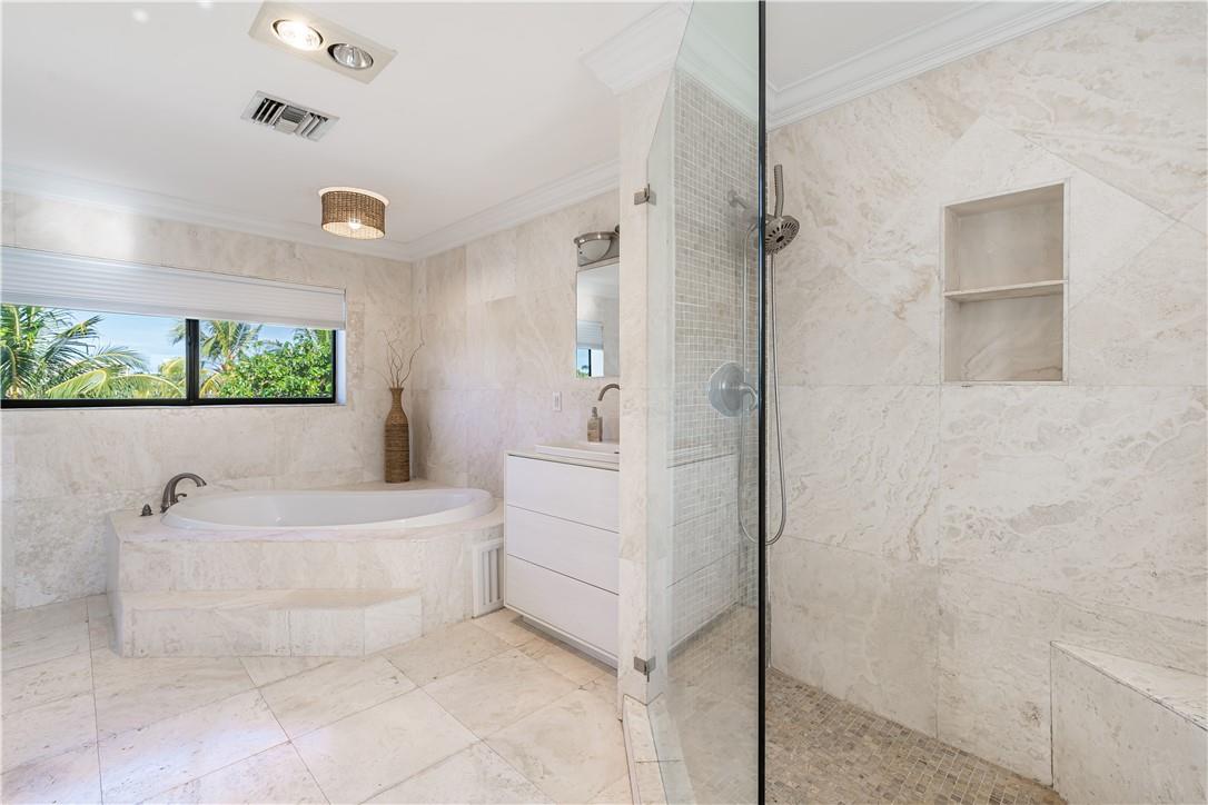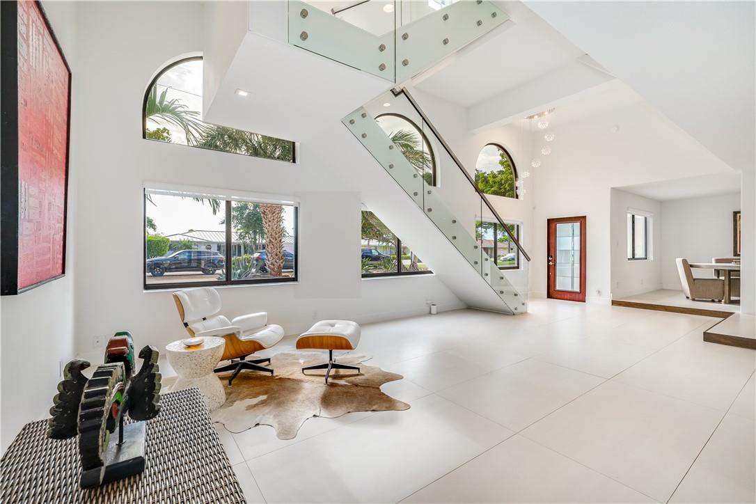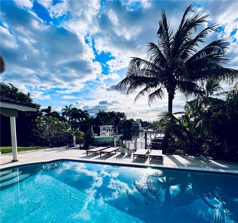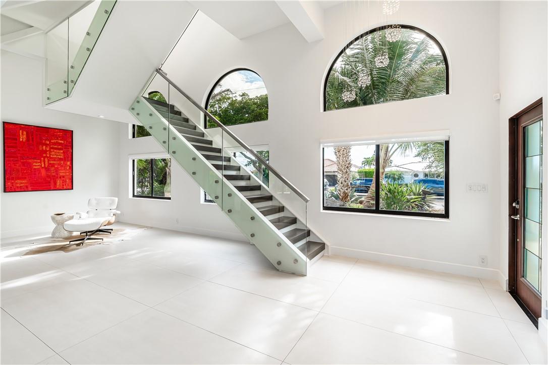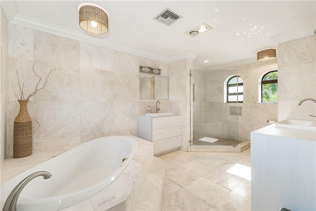 Modern, spacious, open & flowing floor plan, perfect entertaining inside & out. Large, beautifully landscaped waterfront lot, boat lift & very private back yard & pool. Great breezes & easterly view down length of canal. High ceilings & bright interior with impact windows & doors throughout. Huge covered patio & large heated pool. Spacious modern kitchen, island seating & pass through to patio bar. 5 bedrooms include separate guest wing with VIP suite. 3 bedrooms including an office occupy separate wing. Roomy master suite & sitting area opens to private balcony overlooking waterway. Walk-in closet & luxurious tub & shower. New AC, 2 car garage & circular driveway has lots of off street parking. Oversized lot has room for garden & grassed areas provide room for kids playground & dog run.