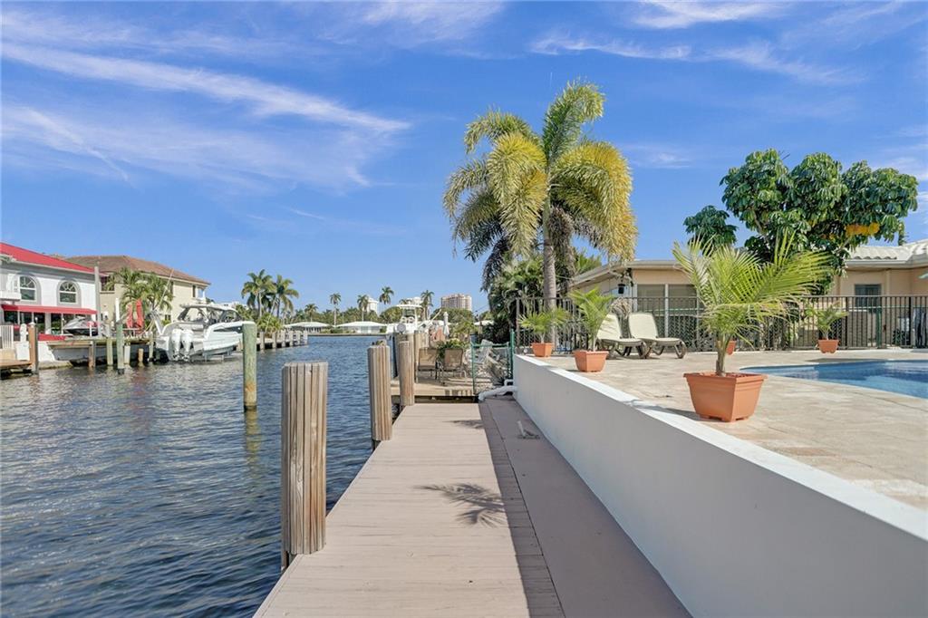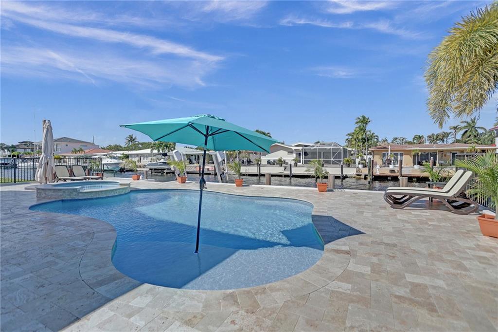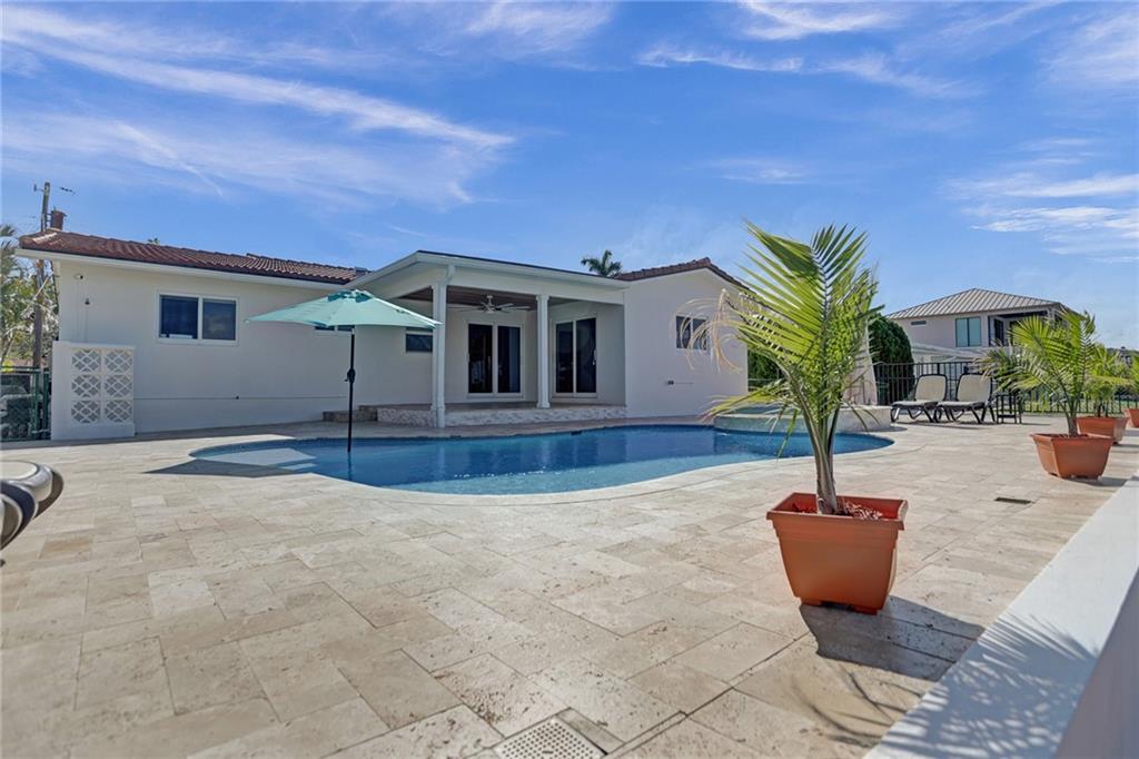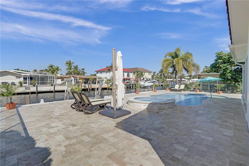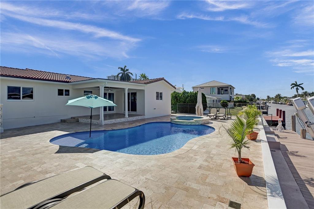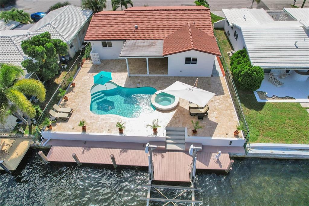 Paradise for boating enthusiasts! This fully remodeled 3-bed, 2-bath home in Pompano Isles is just 3 houses from the intracoastal, easy access to the Hillsboro inlet w/no fixed bridges. Open floor plan creates a seamless flow, Newly marble-paved and well-lit outdoor space. Unwind in new resort-style saltwater heated pool with a 6-jet spa and sun shelf, views of the deep water canal from your outdoor oasis. 60 ft seawall, 50 ft dock, and a 13,000 lb. boat lift, ensuring an ideal boating experience. With new impact windows, doors, irrigation, lighting, gas appliances include Tankless hot water heater, Dryer, Range, pool/spa, Great drainage, This home guarantees safety and efficiency. Open concept white designer kitchen showcases solid wood cabinets, 3'' countertops, and a spacious pantry.