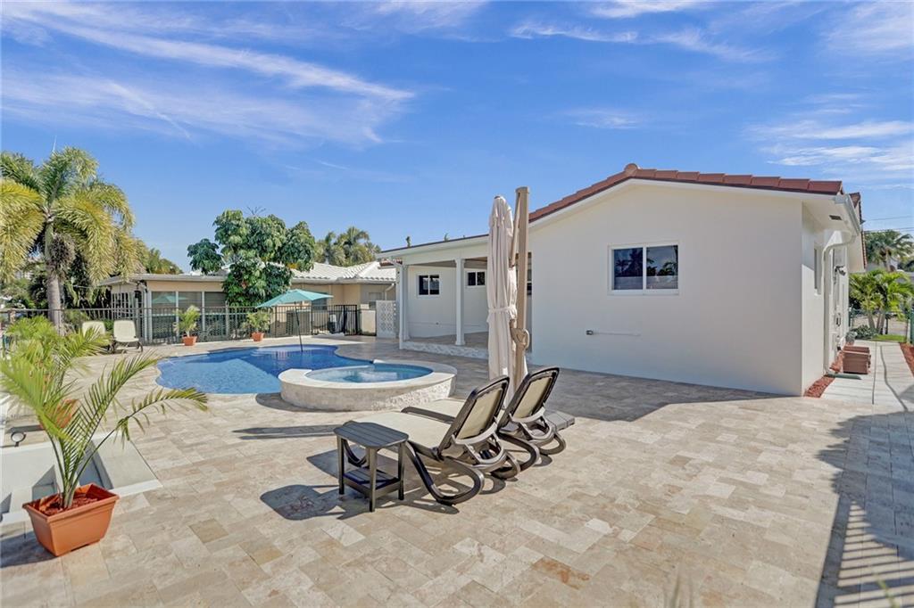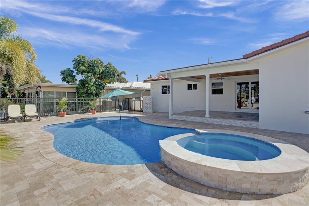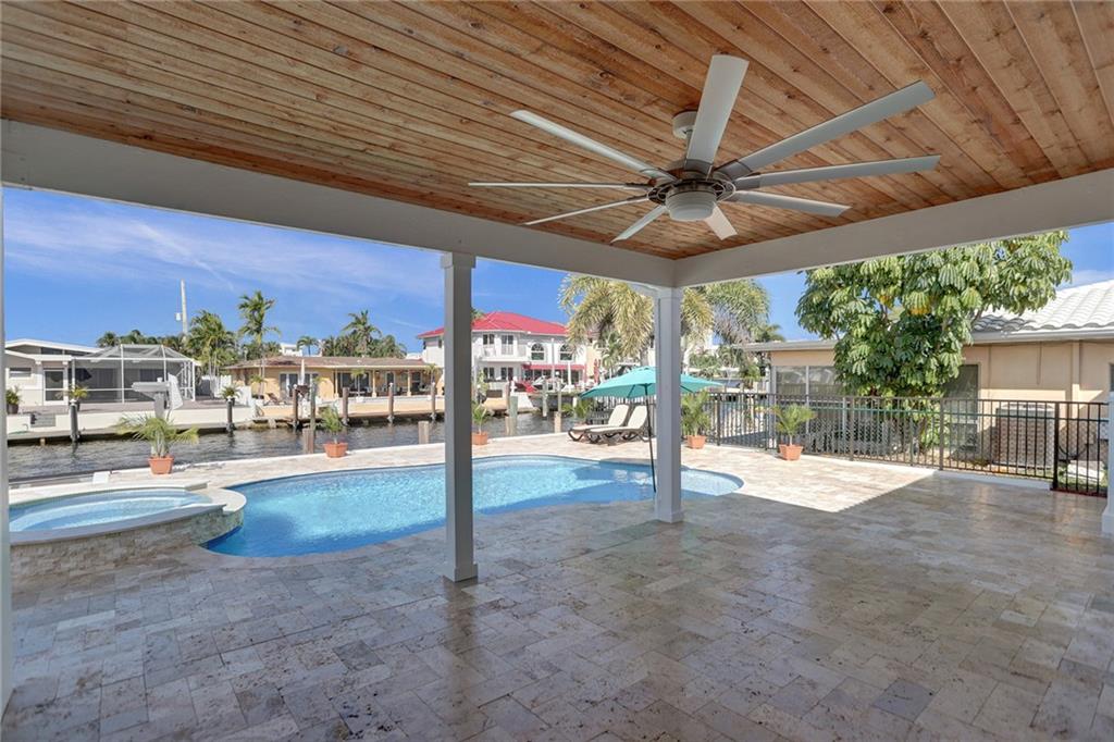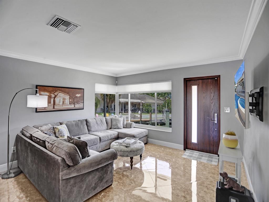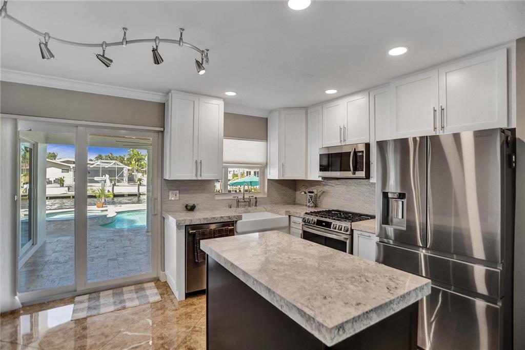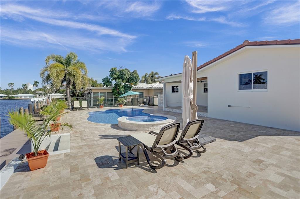 Paradise for boating enthusiasts! This fully remodeled 3-bed, 2-bath home in Pompano Isles is just 3 houses from the intracoastal, easy access to the Hillsboro inlet w/no fixed bridges. Open floor plan creates a seamless flow, Newly marble-paved and well-lit outdoor space. Unwind in new resort-style saltwater heated pool with a 6-jet spa and sun shelf, views of the deep water canal from your outdoor oasis. 60 ft seawall, 50 ft dock, and a 13,000 lb. boat lift, ensuring an ideal boating experience. With new impact windows, doors, irrigation, lighting, gas appliances include Tankless hot water heater, Dryer, Range, pool/spa, Great drainage, This home guarantees safety and efficiency. Open concept white designer kitchen showcases solid wood cabinets, 3'' countertops, and a spacious pantry.
