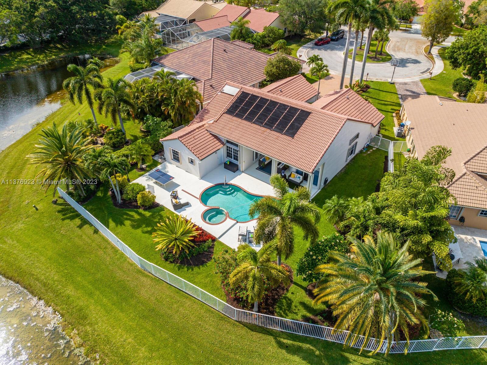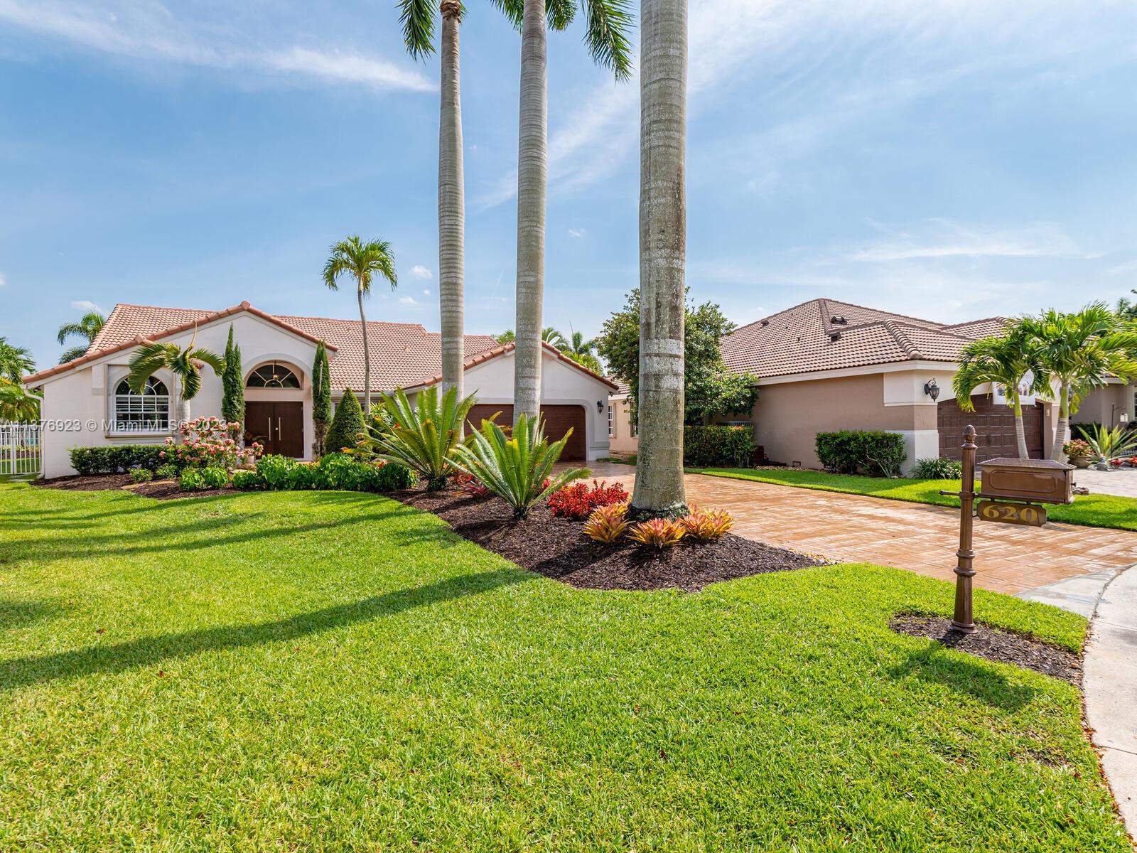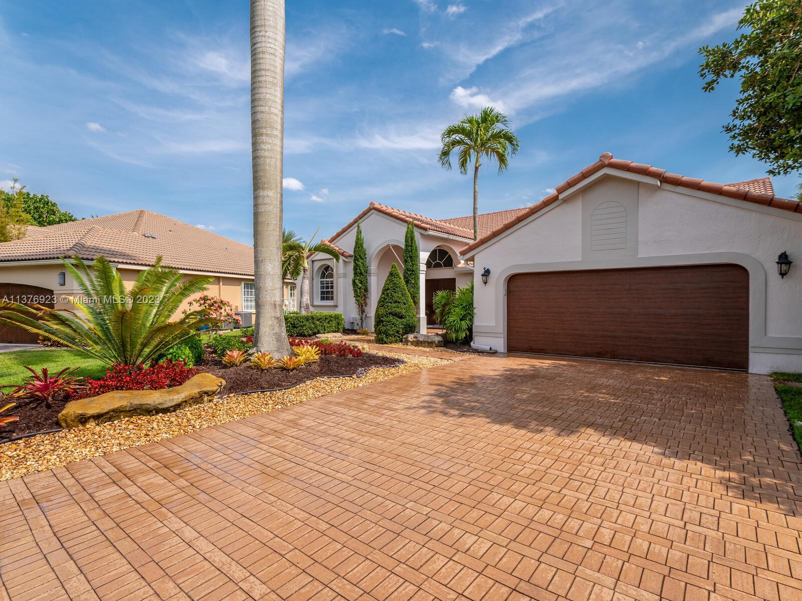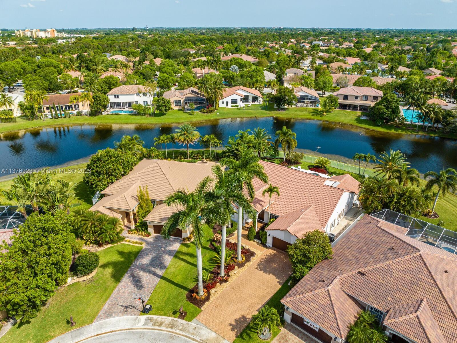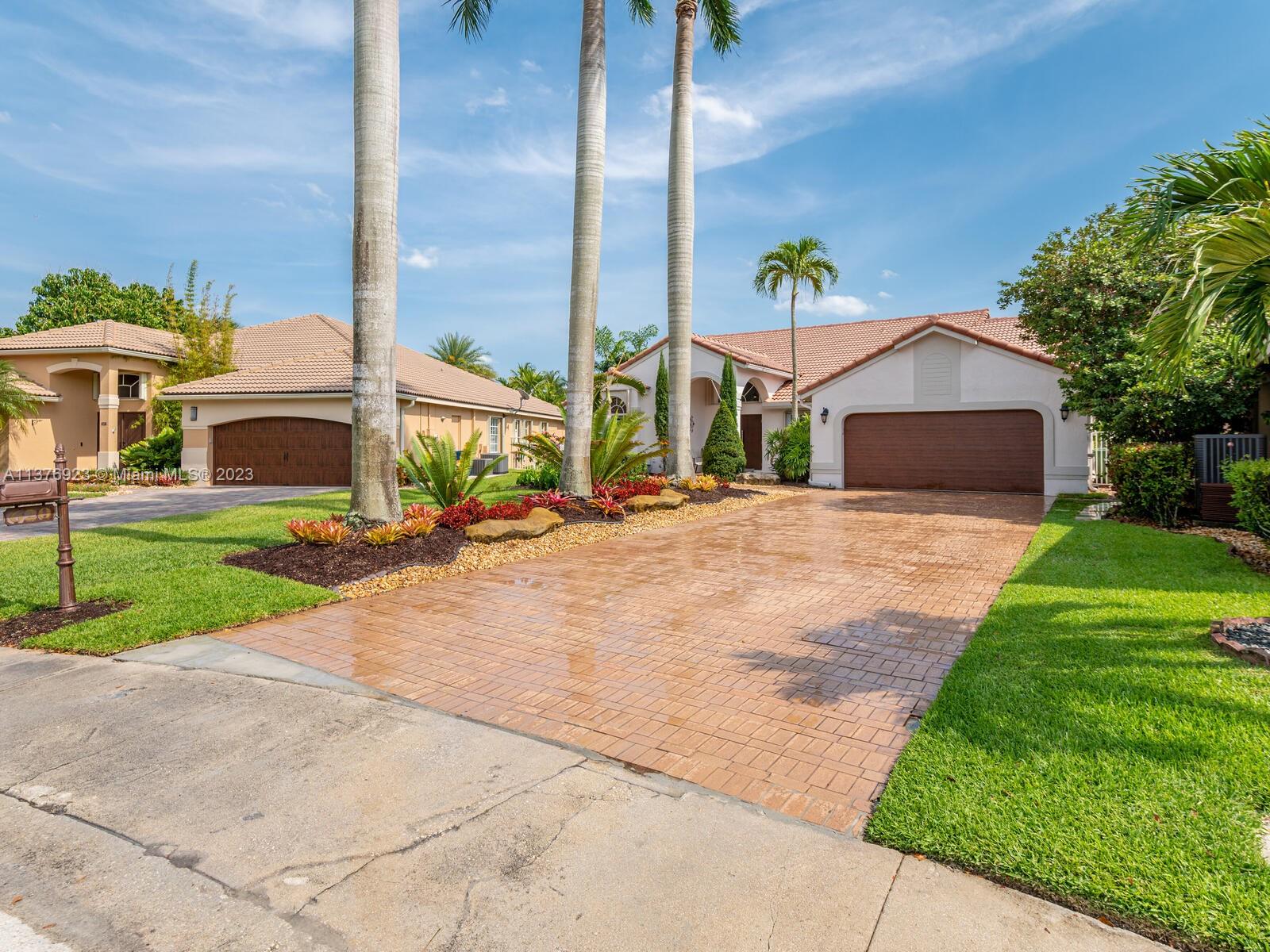 This exquisite, one-story single family home in Weston-Lakes features 4 beds, 3.5 baths, and sits on a cul-de-sac pie-shaped lot, and more than 1/3 Acre of land. This prime location offers a quiet environment, with a long driveway for up to 6 cars. Enjoy the stunning lake view, community pool, kids' playground, and soccer field across the backyard. Recently updated with new plumbing, AC, tankless water heater, kitchen, floors, bathrooms, recess lights, garage and main entrance hurricane doors, freshly painted inside-outside, and stunning landscaping. Accordion hurricane shutters and 2007 roof. Situated near A+ schools, parks, shopping centers and more. Airport and beach only 20-30 min away. Don't miss your chance to own this spectacular home in Weston's most desirable community!