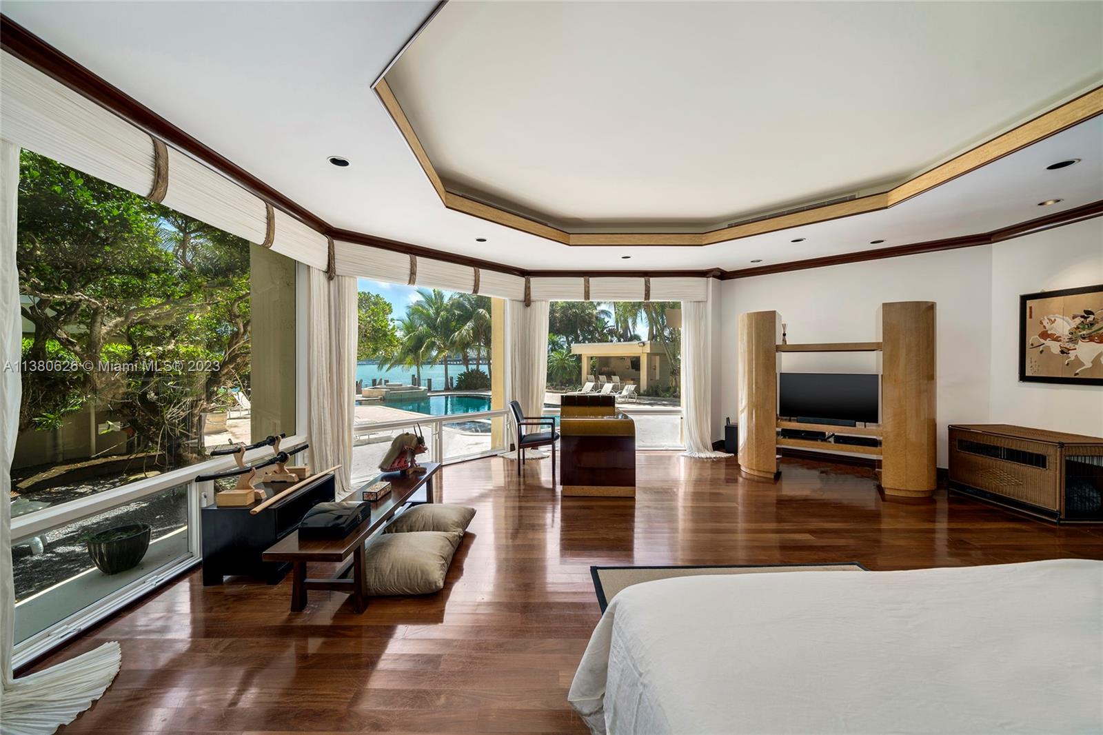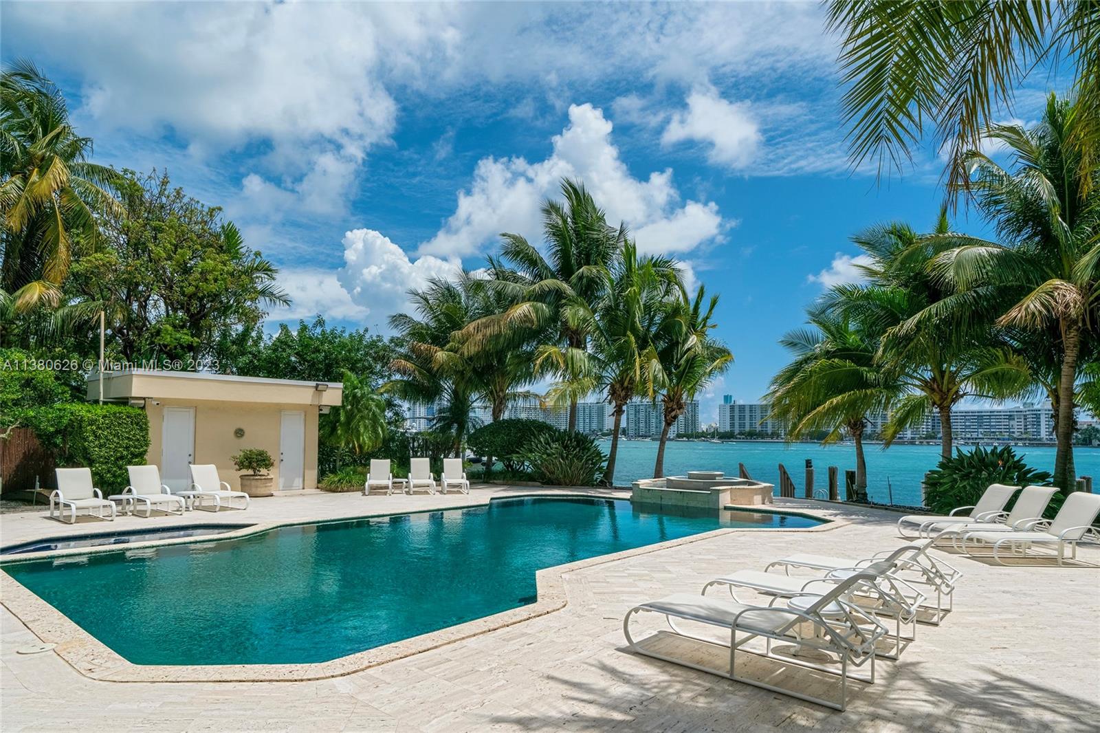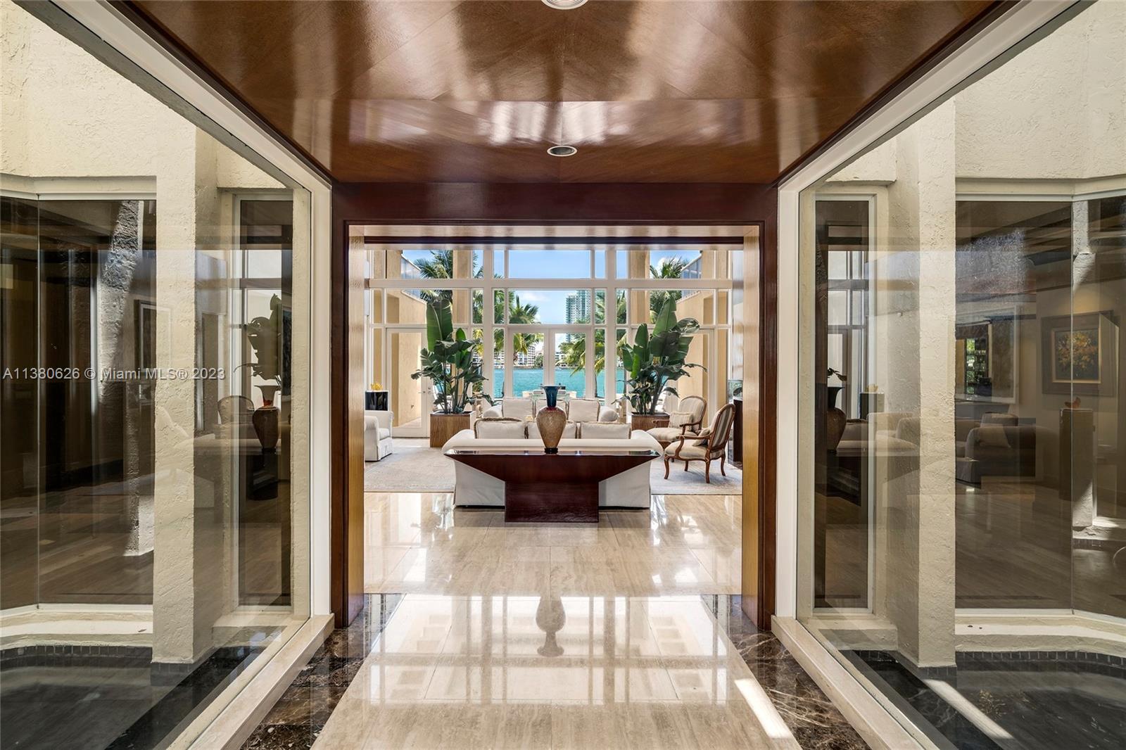 Located on exclusive guard-gated Star Island this residence boasts a manicured 40,000 SF lot, and actual area of 12,374 SF, 6BR plus an office, 8+1BA, and 100FT of sparkling waterfront. Impressive foyer with soaring 30+FT ceilings and custom staircase, exquisite Travertine floors and custom millwork throughout, expansive living room and entertainment room/bar all with large windows and amazing views to the pool and bay. A private dining area, chef’s kitchen with top-of-the-line appliances and a separate breakfast room. The large bay-facing principal suite features dual walk-in closets and dual bathrooms. Upstairs has 4 large guest bedrooms with en-suite baths & oversized Plaza Deck terraces. Heated pool, summer kitchen, 40FT dock, direct bay & ocean access plus amazing central location.