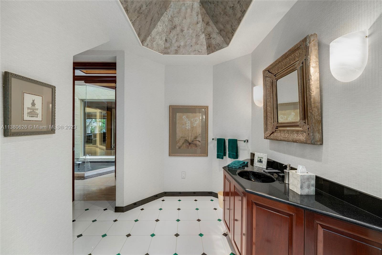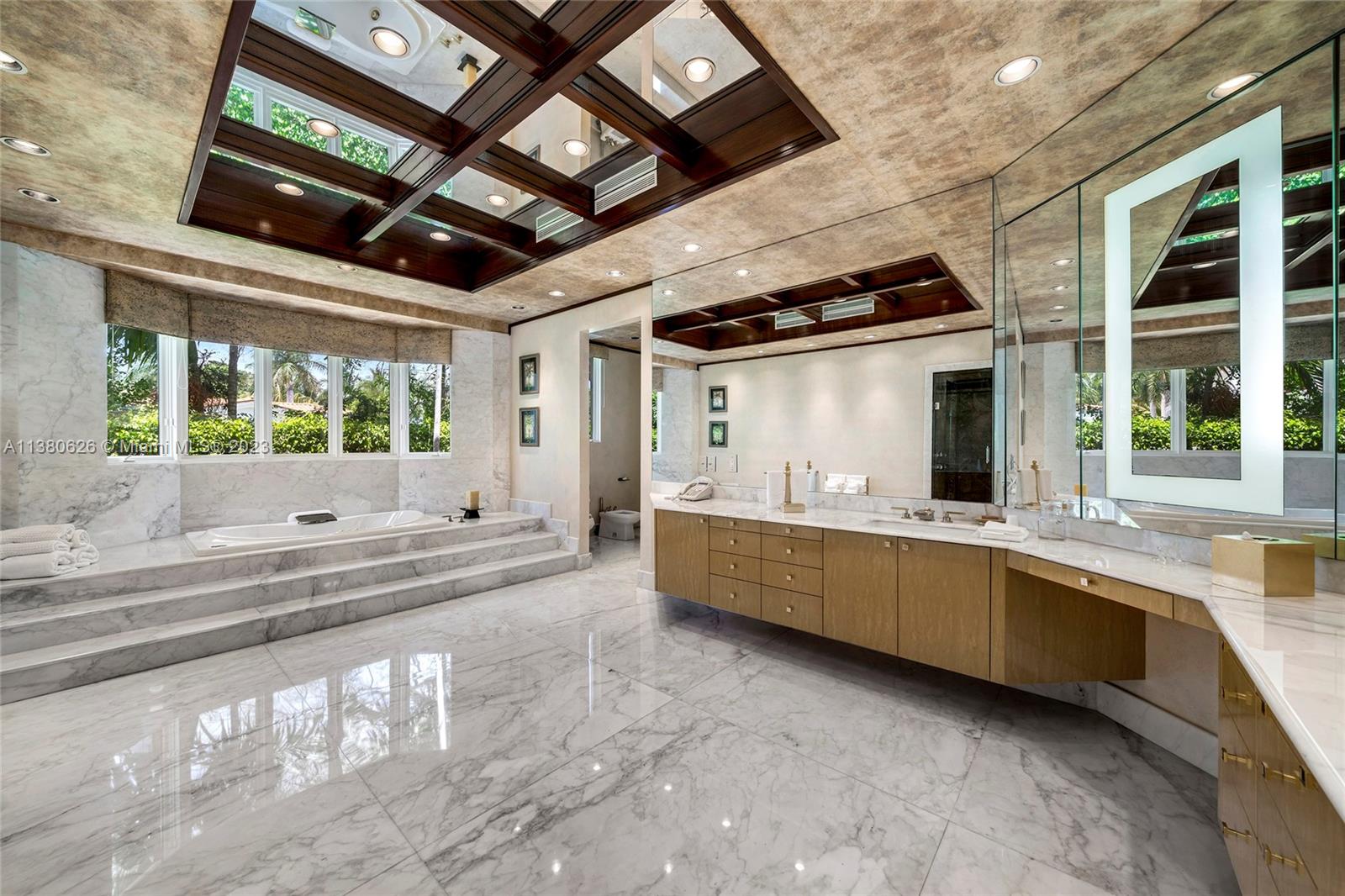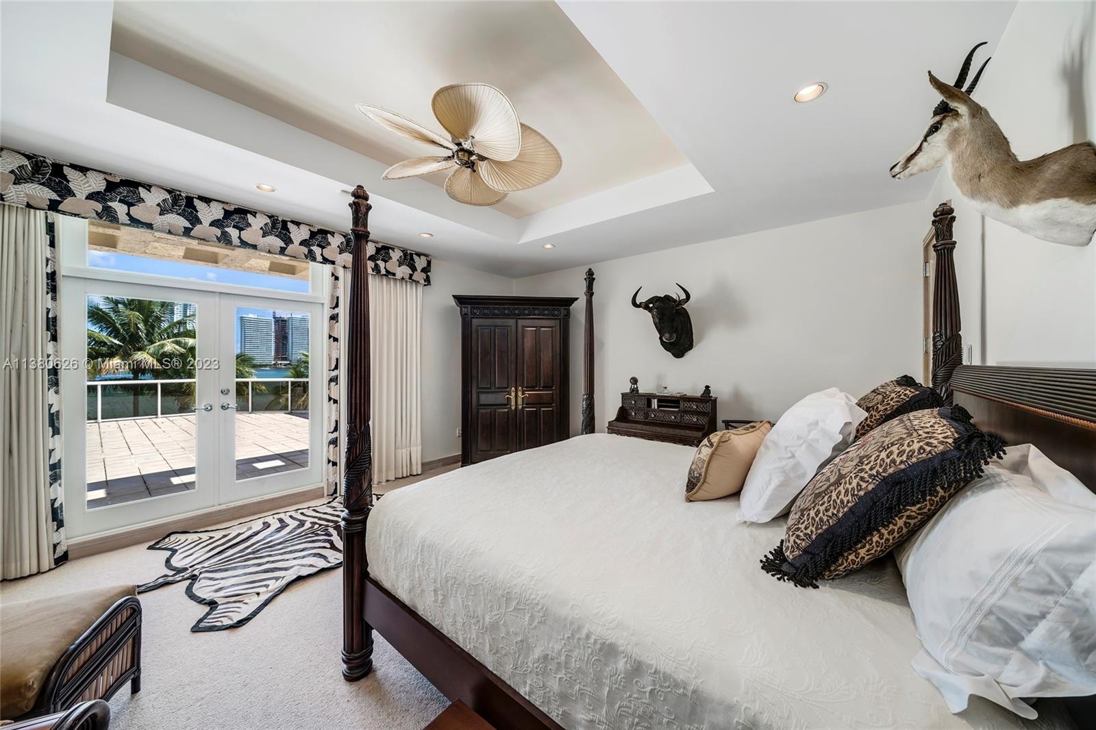 Located on exclusive guard-gated Star Island this residence boasts a manicured 40,000 SF lot, and actual area of 12,374 SF, 6BR plus an office, 8+1BA, and 100FT of sparkling waterfront. Impressive foyer with soaring 30+FT ceilings and custom staircase, exquisite Travertine floors and custom millwork throughout, expansive living room and entertainment room/bar all with large windows and amazing views to the pool and bay. A private dining area, chef’s kitchen with top-of-the-line appliances and a separate breakfast room. The large bay-facing principal suite features dual walk-in closets and dual bathrooms. Upstairs has 4 large guest bedrooms with en-suite baths & oversized Plaza Deck terraces. Heated pool, summer kitchen, 40FT dock, direct bay & ocean access plus amazing central location.
