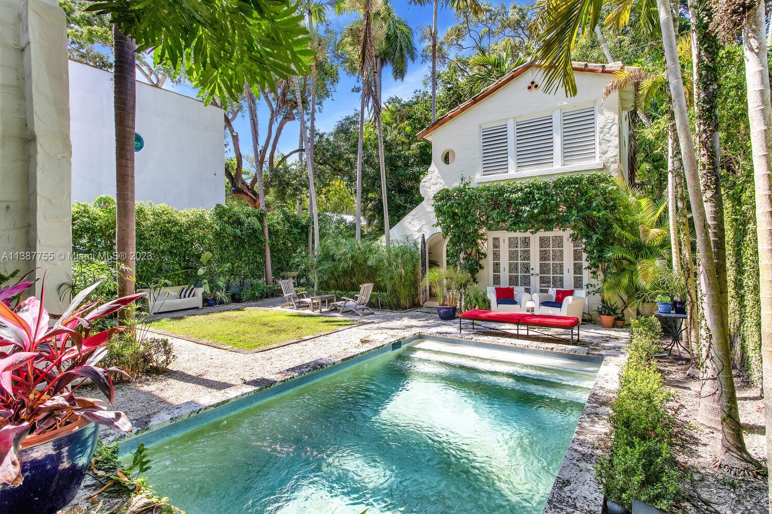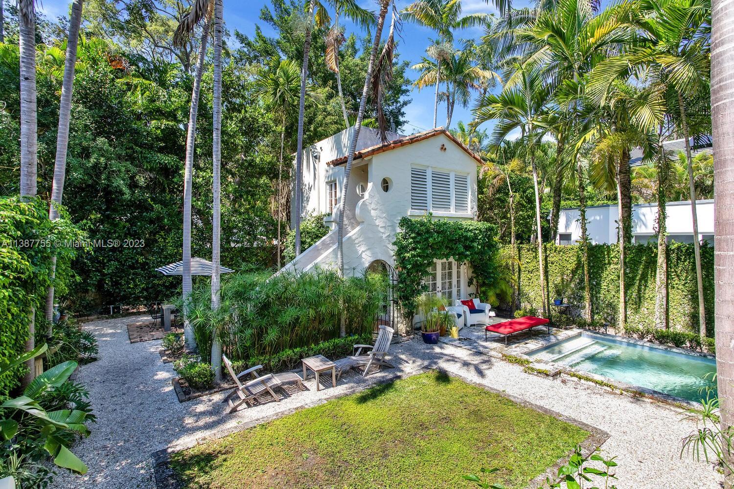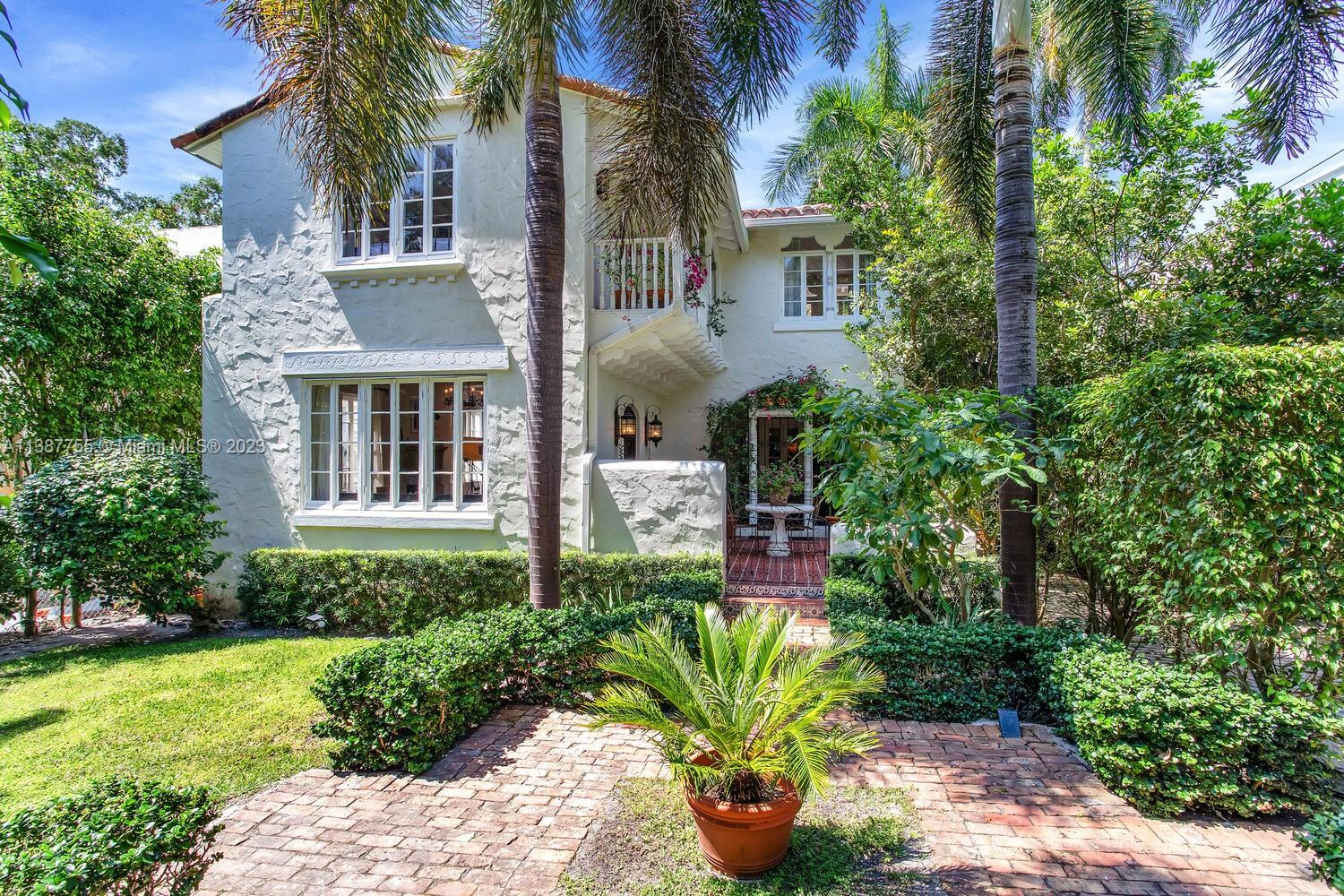 Captivating home on one of the most coveted streets in lush, tree-canopied South Coconut Grove. Walk to the Grove village center’s galleries, boutiques, cafes & bayfront parks & marinas. Light-filled interior spaces with classic architectural details including original wood flooring, 3 fireplaces & volume ceilings. Updated, high-end kitchen features statuary marble countertops, top-of-the-line appliances & separate butler’s pantry. Main house has 3BR’s/2.5BA’s - formal living & dining room + 2 inviting porches for year-round outdoor enjoyment. Two-story guest house offers living area w/mini-kitchen (ideal for poolside entertaining) + 1BR/1BA & cozy enclosed porch. The home is surrounded by an idyllic tropical garden w/vine covered walls, coral rock terraces, native palms & tranquil pool.