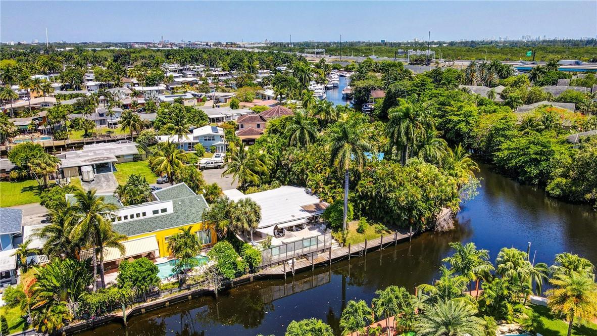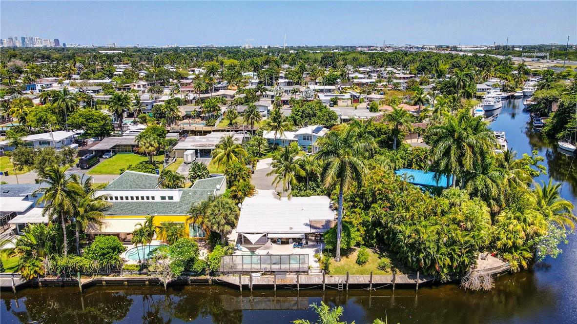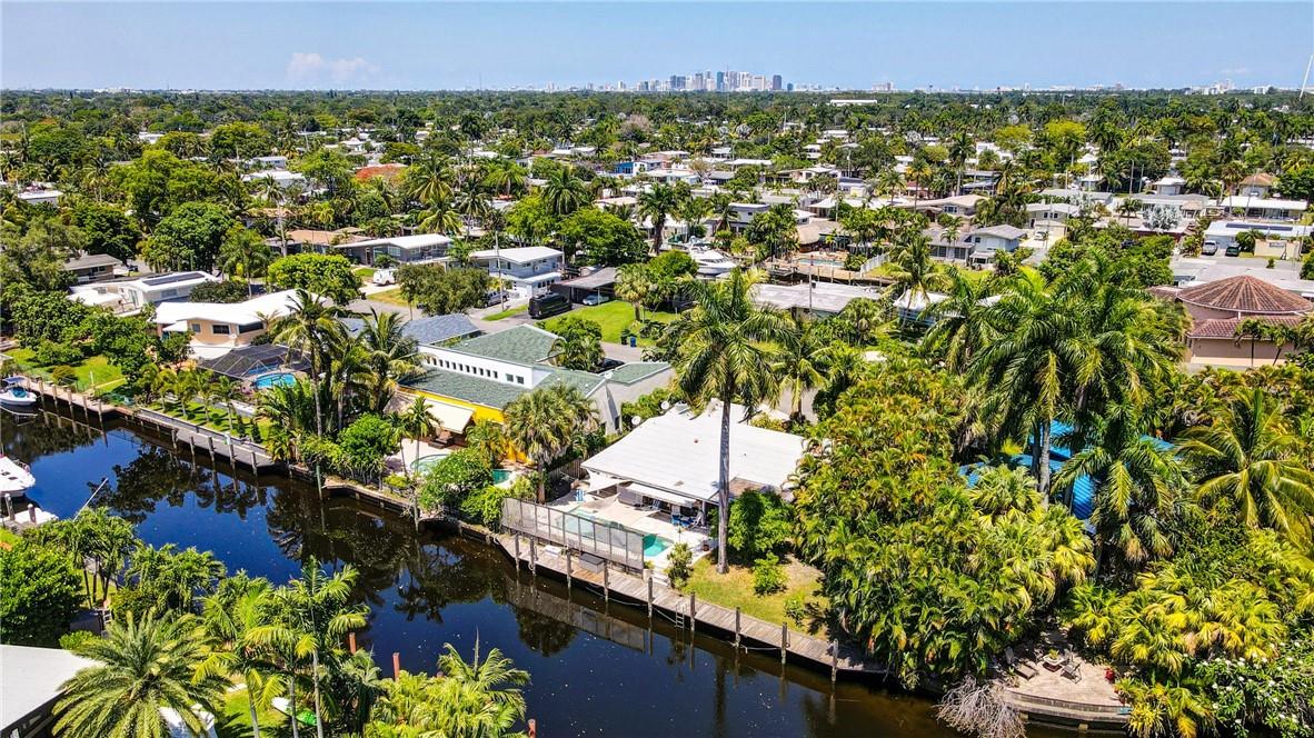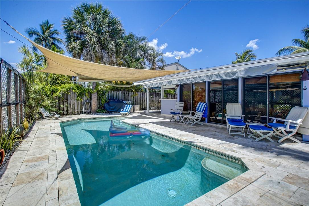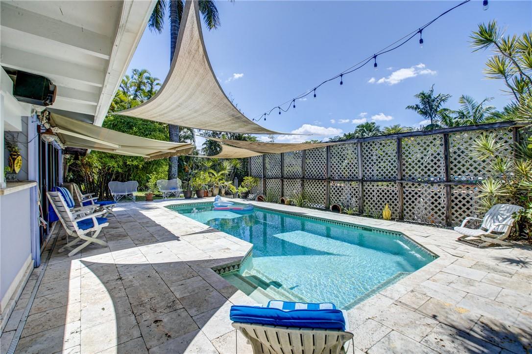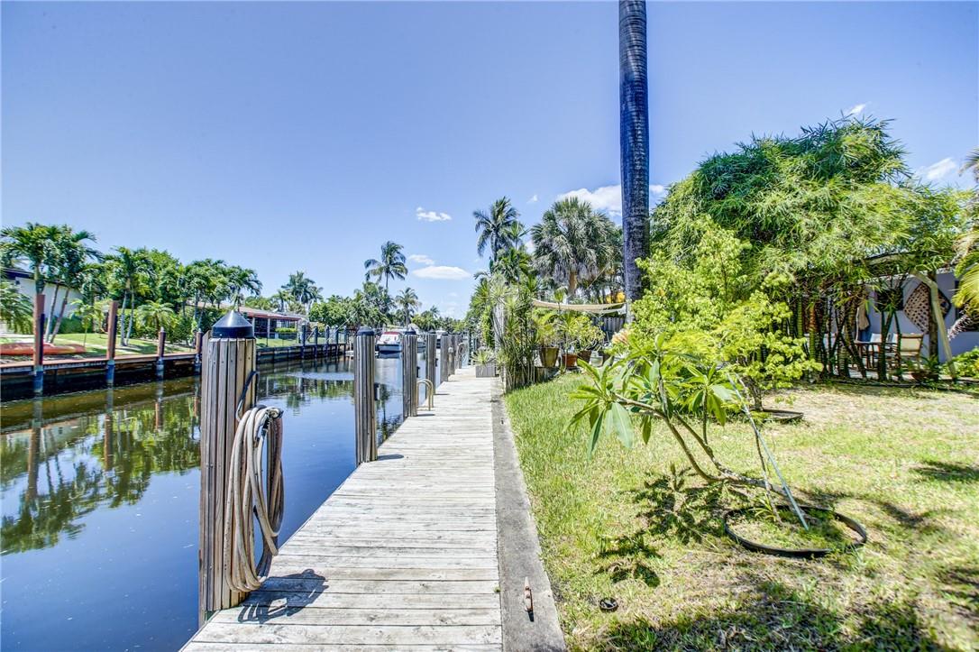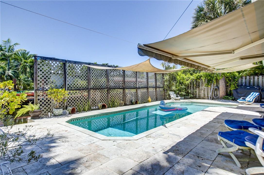 Welcome to the highly sought after Lauderdale Isles. This 2-bed, 2-bath gem is a coastal paradise, highlighting 95 feet of waterfront ocean access without any fixed bridges and a stunning river view. Its open, bright, and airy interior creates a welcoming atmosphere. The pool area features a bar and seating area, ideal for entertaining, south side yard sports a bocce court, while the private dock invites you to explore the waterways at your leisure. Inside features charming terrazzo floors and cedar ceilings. Conveniently located close to major highways, roads, shopping, entertainment, and much more, this home offers convenience and elegance in one. Any / all measurements are estimates and should be verified by the buyer. SURVEY ATTACHED.