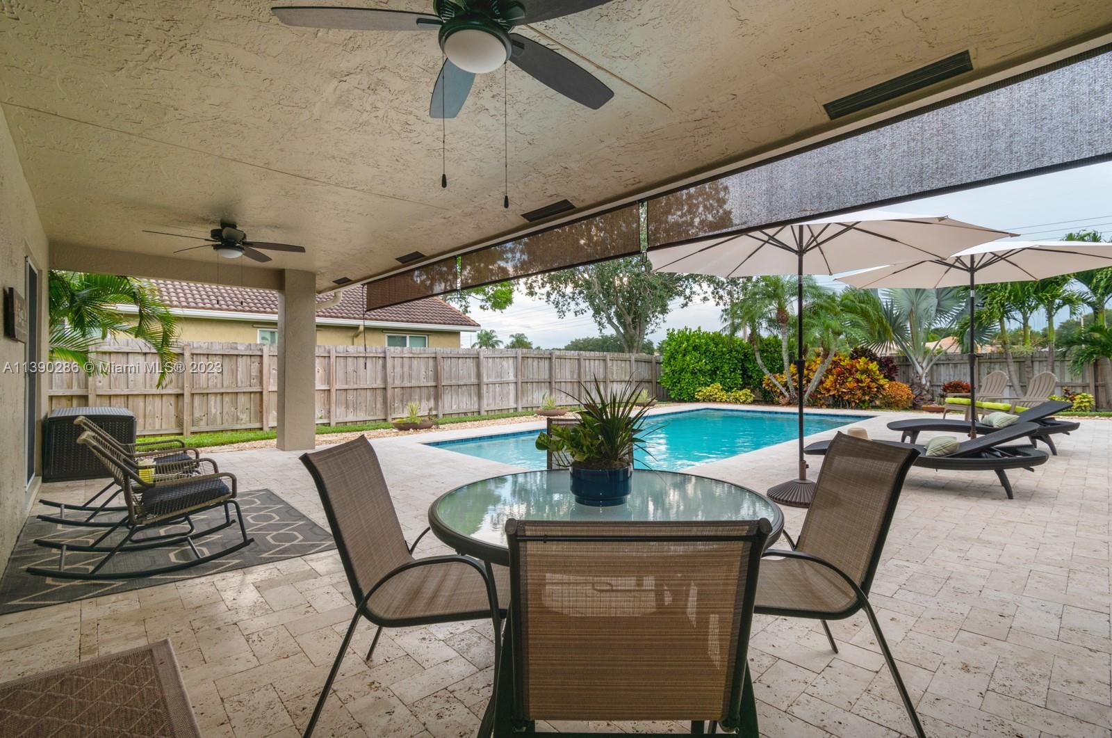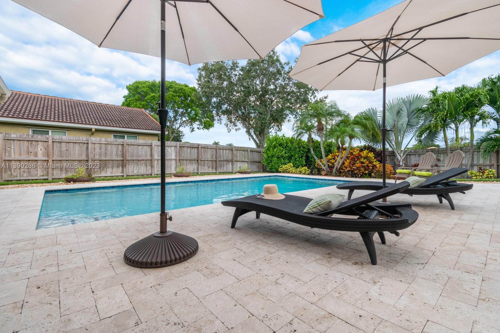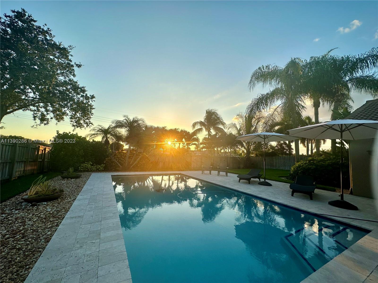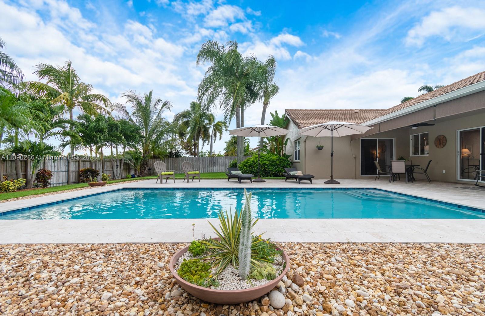 Your future home awaits in this tastefully renovated 3bed 2bath home. A fully remodeled kitchen welcomes you as you walk into this impeccable property. White shaker cabinets, granite tops, modern backsplash, stunning island, deep sink, Whirlpool appl, pull-outs, BONUS pantry, passthrough window. Master w/high, sloped ceilings, view to pool & garden, walk-in closet. Renovated bath, double sinks, separate shower & tub. Tile & laminate floors. Window treatments add elegance & warmth to every space! Remodeled 2nd bath. Laundry w/Whirlpool W&D. Modern style pool, gorgeous backyard, travertine deck. Porch offers shaded area great for relaxing & entertaining. Private fully fenced. 2 sheds. 2-car garage, side door for access. Impact garage door, panels. Tile roof 2009. HOA $370/yr Superb location!