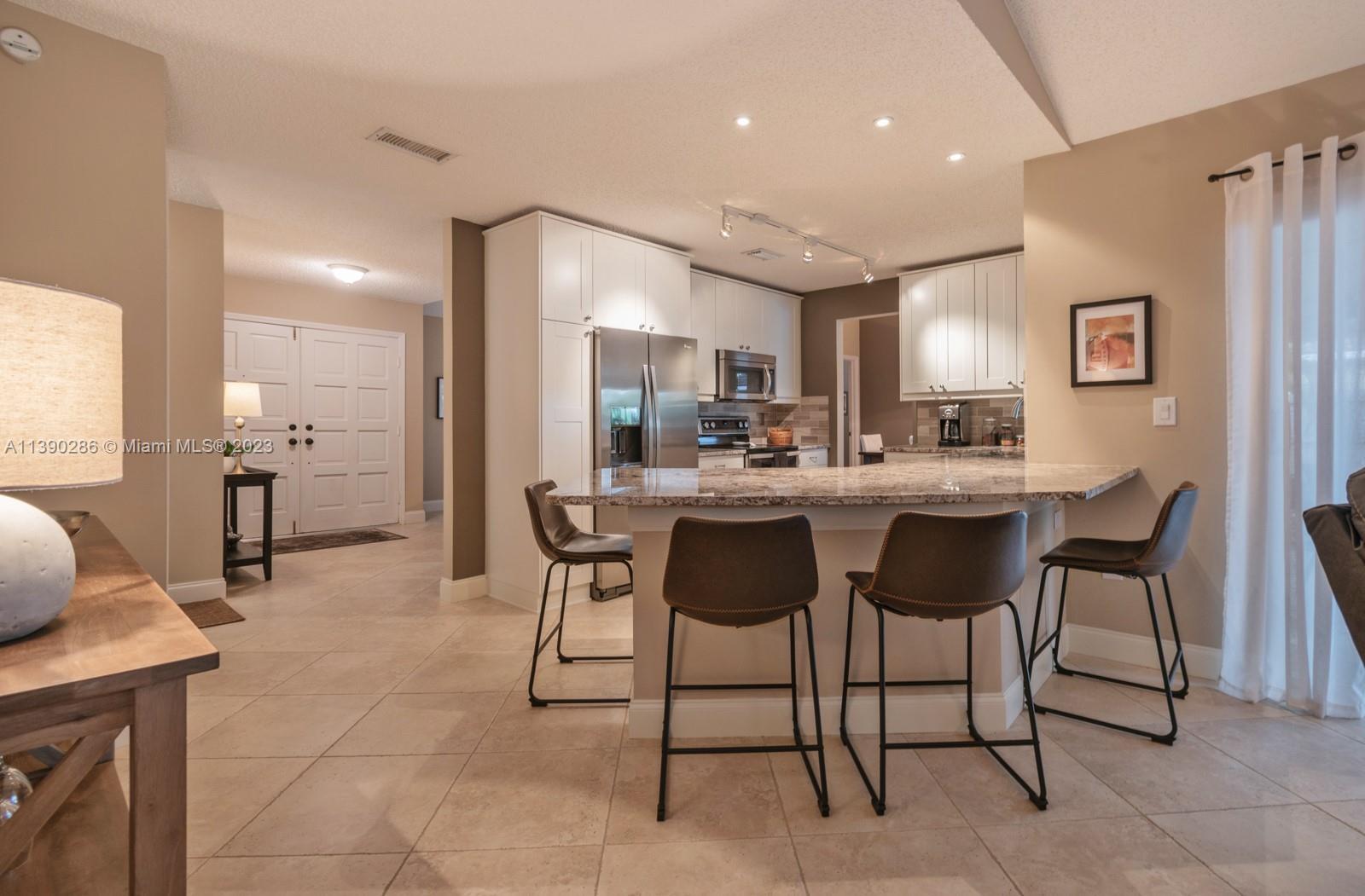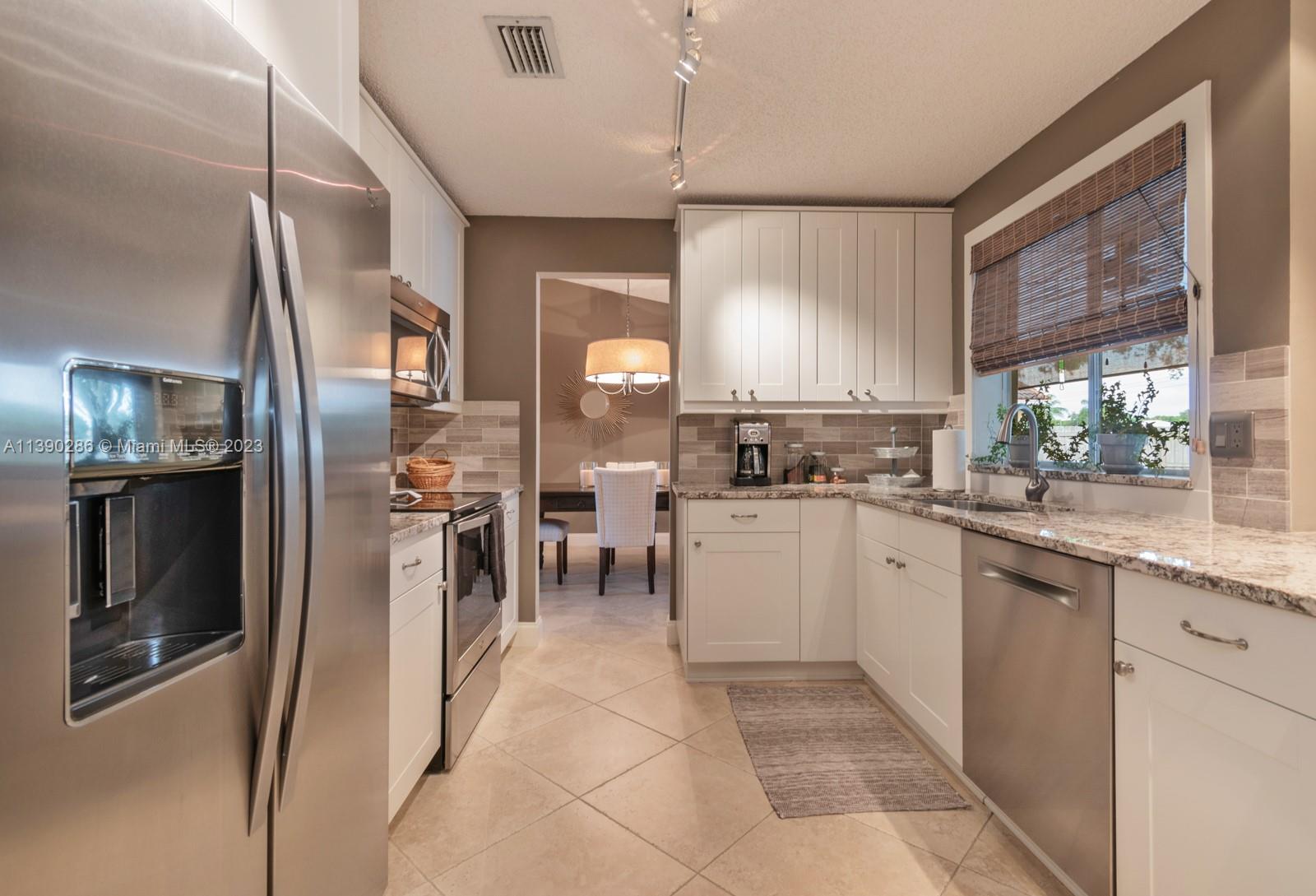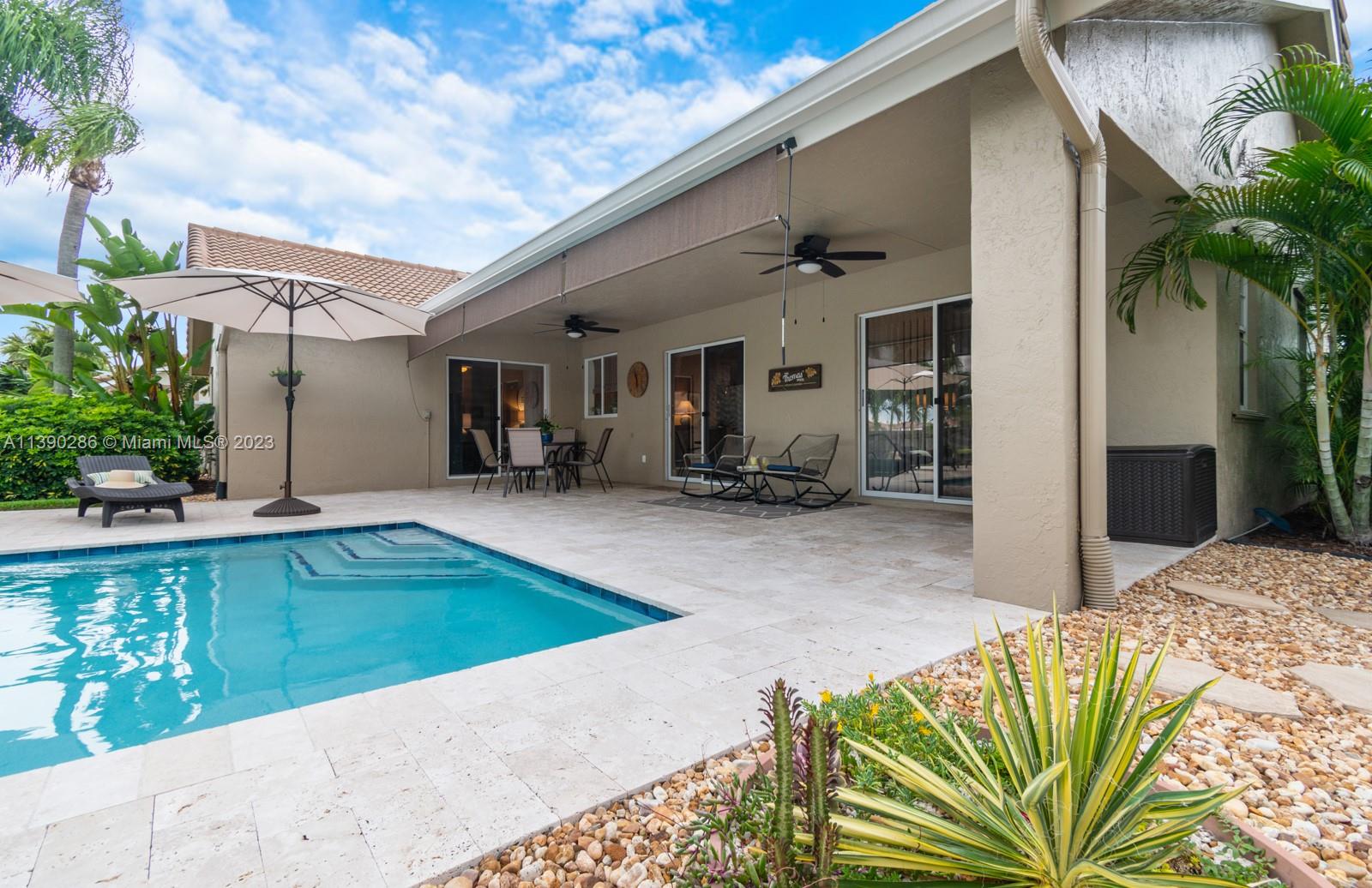 Your future home awaits in this tastefully renovated 3bed 2bath home. A fully remodeled kitchen welcomes you as you walk into this impeccable property. White shaker cabinets, granite tops, modern backsplash, stunning island, deep sink, Whirlpool appl, pull-outs, BONUS pantry, passthrough window. Master w/high, sloped ceilings, view to pool & garden, walk-in closet. Renovated bath, double sinks, separate shower & tub. Tile & laminate floors. Window treatments add elegance & warmth to every space! Remodeled 2nd bath. Laundry w/Whirlpool W&D. Modern style pool, gorgeous backyard, travertine deck. Porch offers shaded area great for relaxing & entertaining. Private fully fenced. 2 sheds. 2-car garage, side door for access. Impact garage door, panels. Tile roof 2009. HOA $370/yr Superb location!