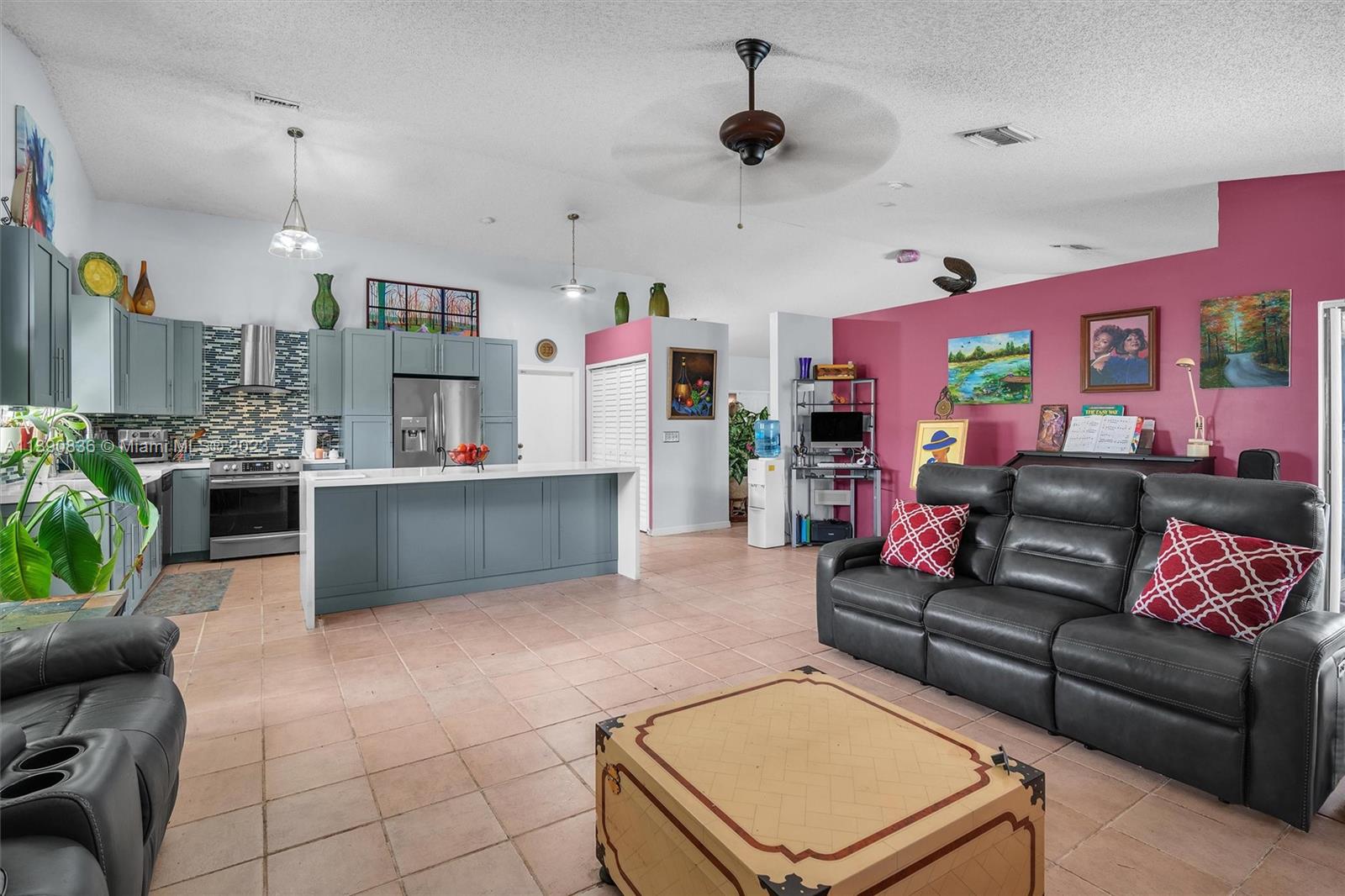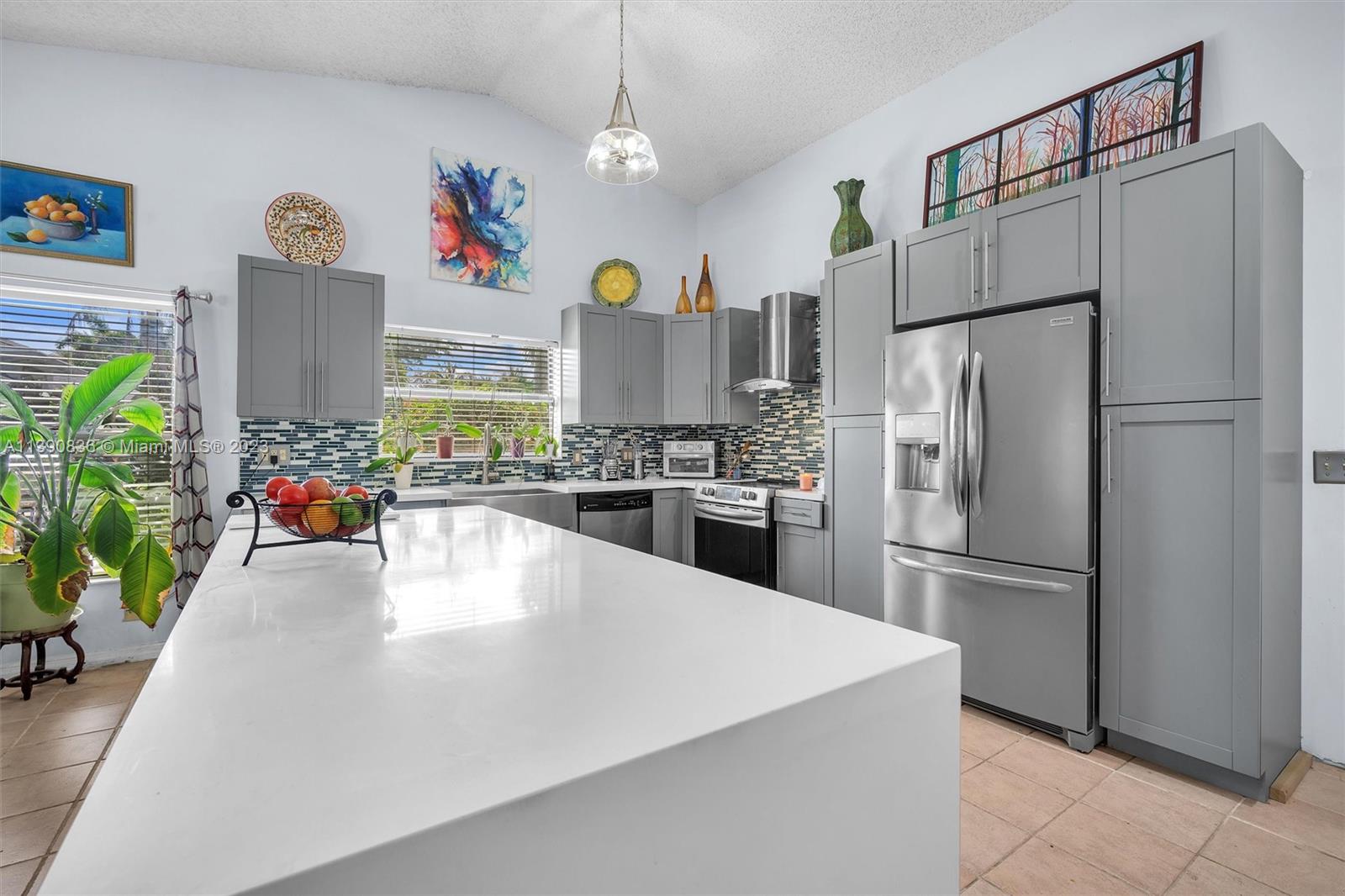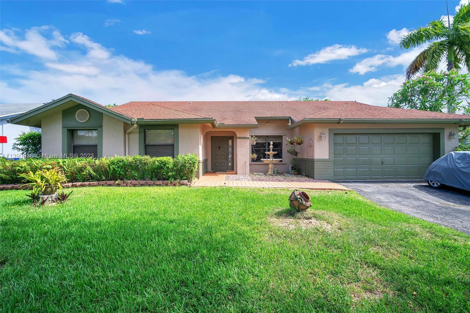 This beautiful & spacious pool & lakefront property sits on a very private and quiet street. It has three bedrooms & three bathrooms, family room & a two car garage. The pool & lake can be viewed from all the main living areas, including the main bedroom. The newly designed modern kitchen is a cook's dream! It has a Quarts waterfall large eating island, stainless appliances, glass backsplash, soft closing drawers & lots of storage space. Two of the spacious bedrooms include private bathrooms. The property is completely tiled & has lots of natural light. The property boasts a 3D shingles roof, replaced pool pump, hurricane panels & newer water heater. It has a very low association & it is walking distance to the elementary school & a park. Easy access to highway.