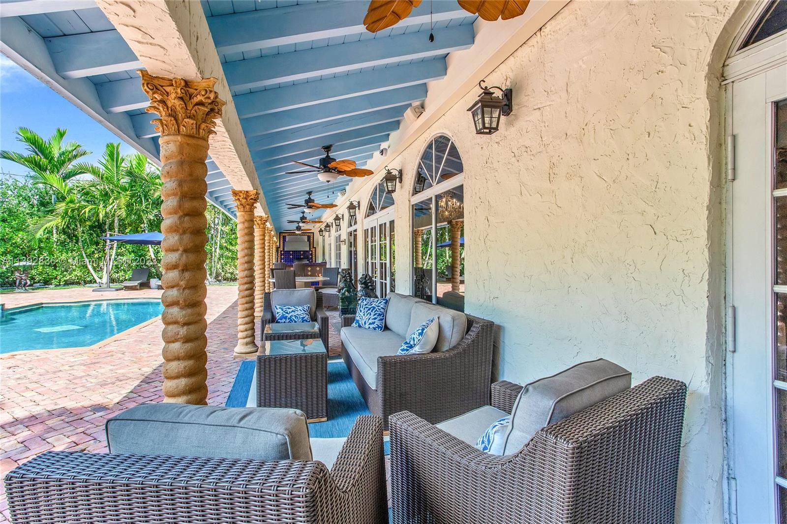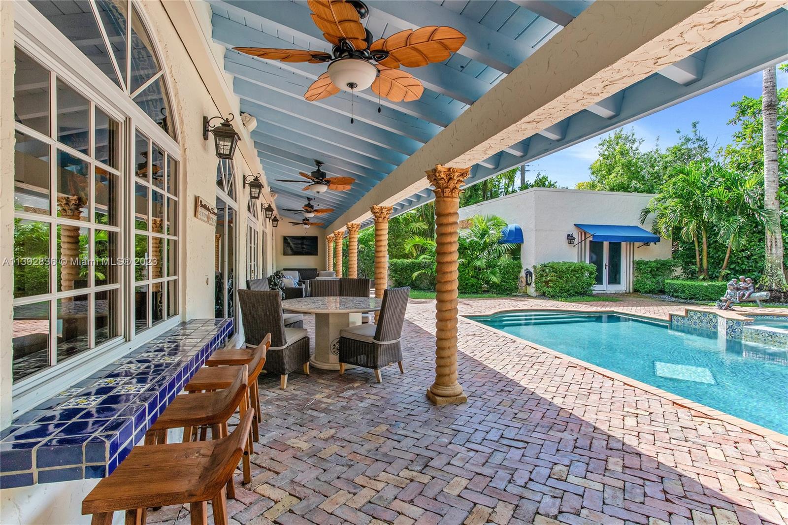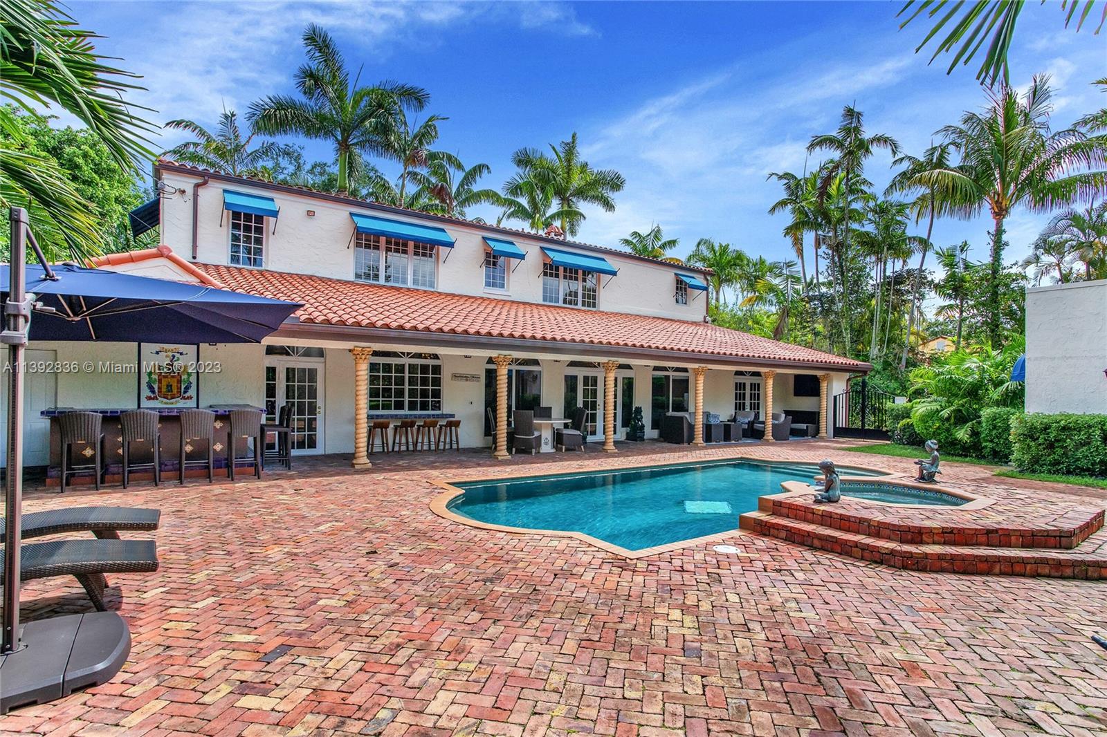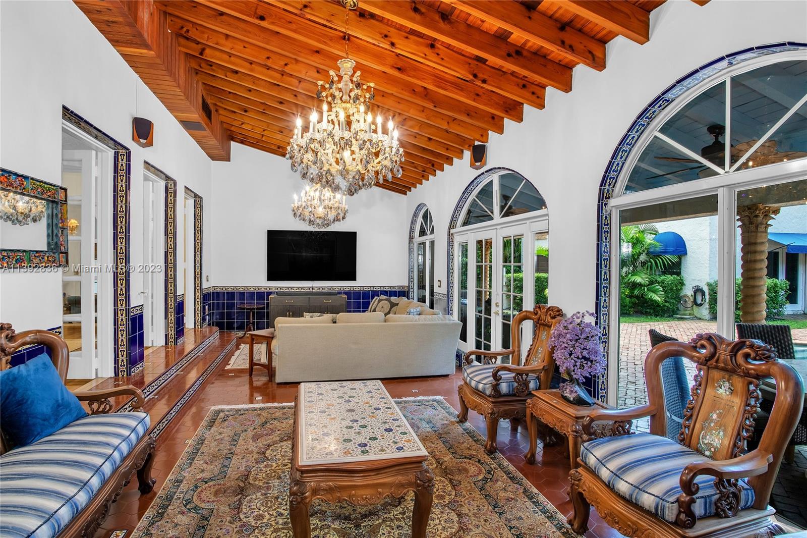 Majestic Mediterranean mansion on Coral Way. Grand foyer leads to large gracious spaces; living room w/fireplace,library/office w/gas fireplace, dining room, and family room w/bar. Main floor features guest room and staff room, each w/bath, cook's kitchen, breakfast room, and wine cellar. Impact glass French doors open to wide covered terrace w/entertaining area. On the 2nd floor: primary bedroom with massive bath and 2 walk-in closets; two other bedrooms each with private bath. Home was renovated in 2006 preserving the Old Spanish look and charm w/wood, marble, and tile floors, beamed ceilings and original stained glass. Pool area features a cabana w/bath, steam room, and a 2nd wine cellar (possible guest cottage). Impact glass throughout, roof and ACs new in 2022.