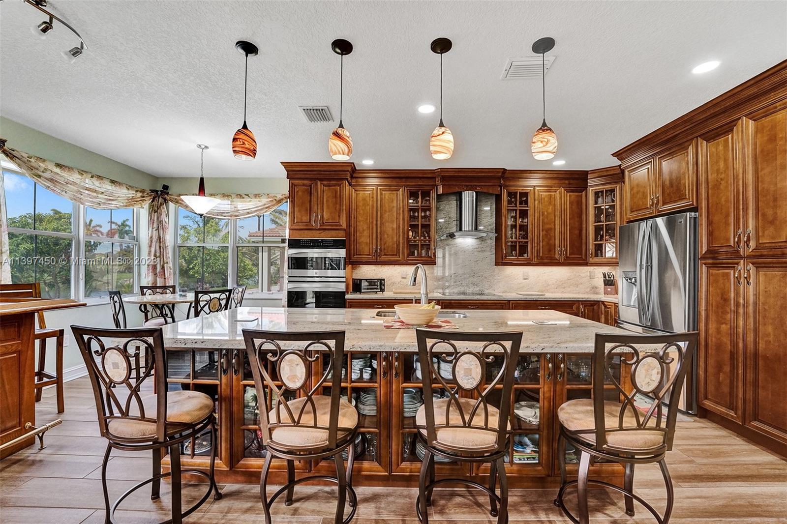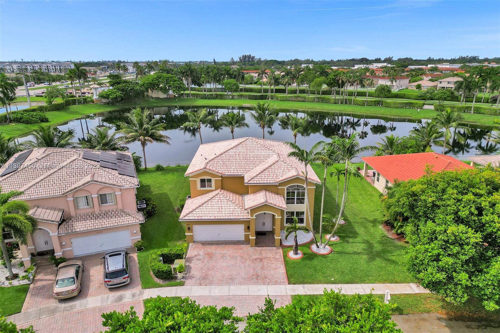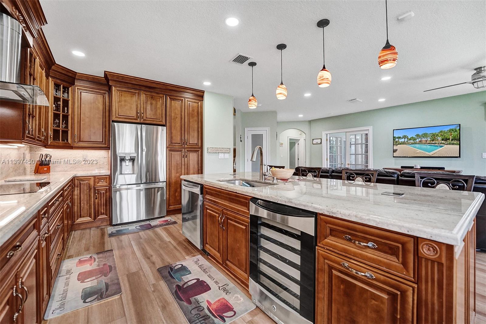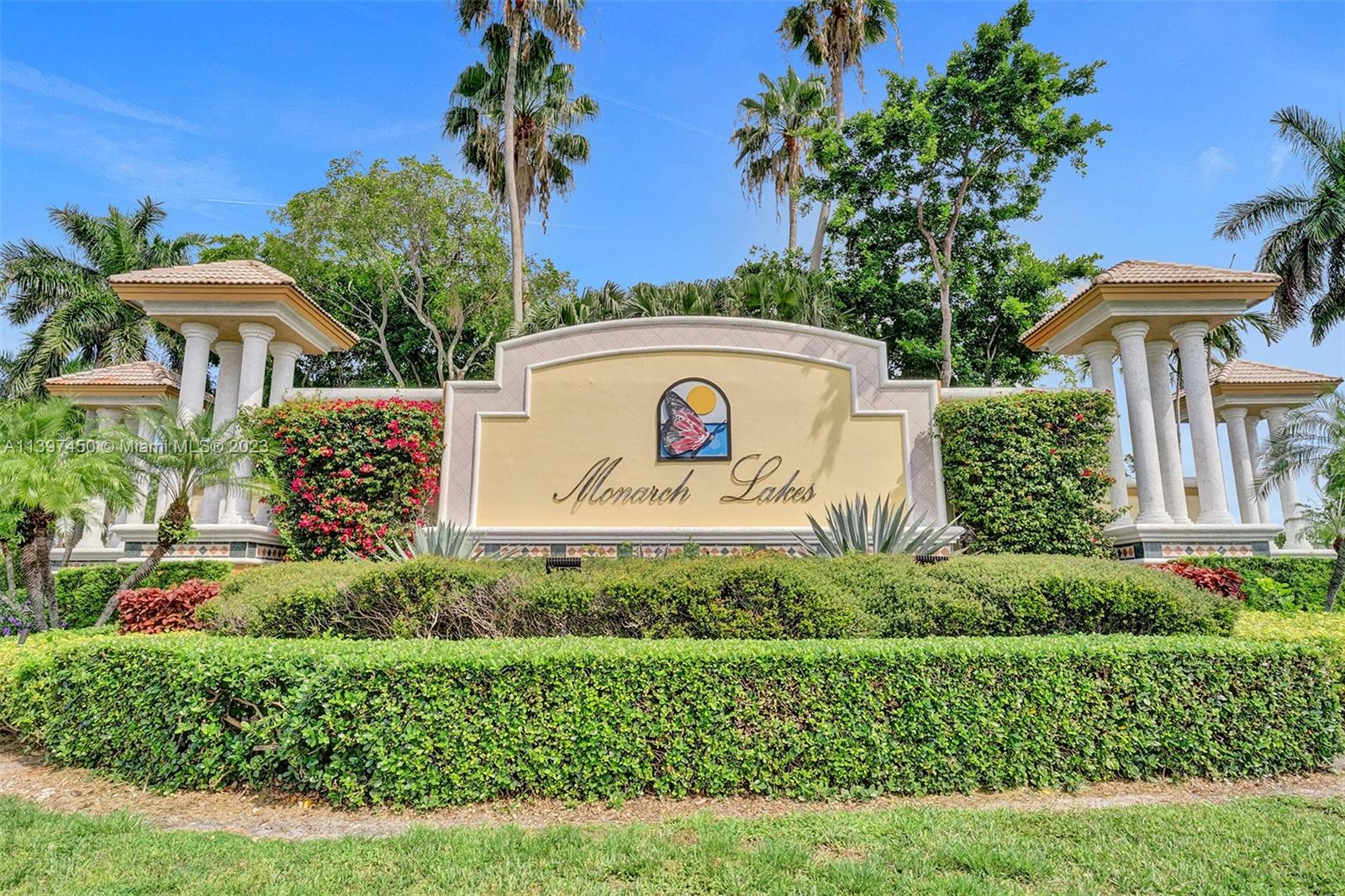 The most attractive and meticulously 1 owner recently renovated waterfront 4/3/2 home in Monarch Lakes currently for sale offering luxurious and serene living with rare wood-like porcelain tile throughout. Electrical wiring system and plumbing pipes has been replaced with upgraded materials throughout entire home in 2019. The gourmet kitchen is a culinary enthusiast's dream, boasting stainless steel appliances, sleek stone countertops, wine cooler, and an abundance of custom cabinetry. This home features a 1st Floor Bedroom and Full bathroom, a plus for a multi-generation family. Pictures don’t give this home justice, schedule your tour today.
