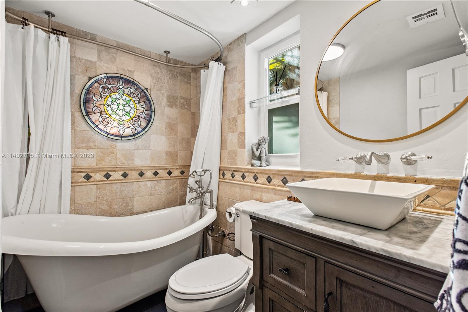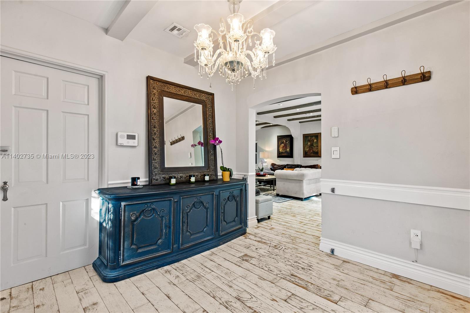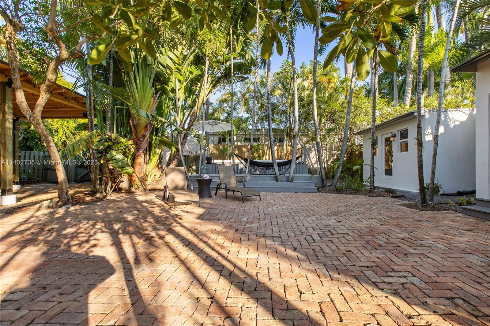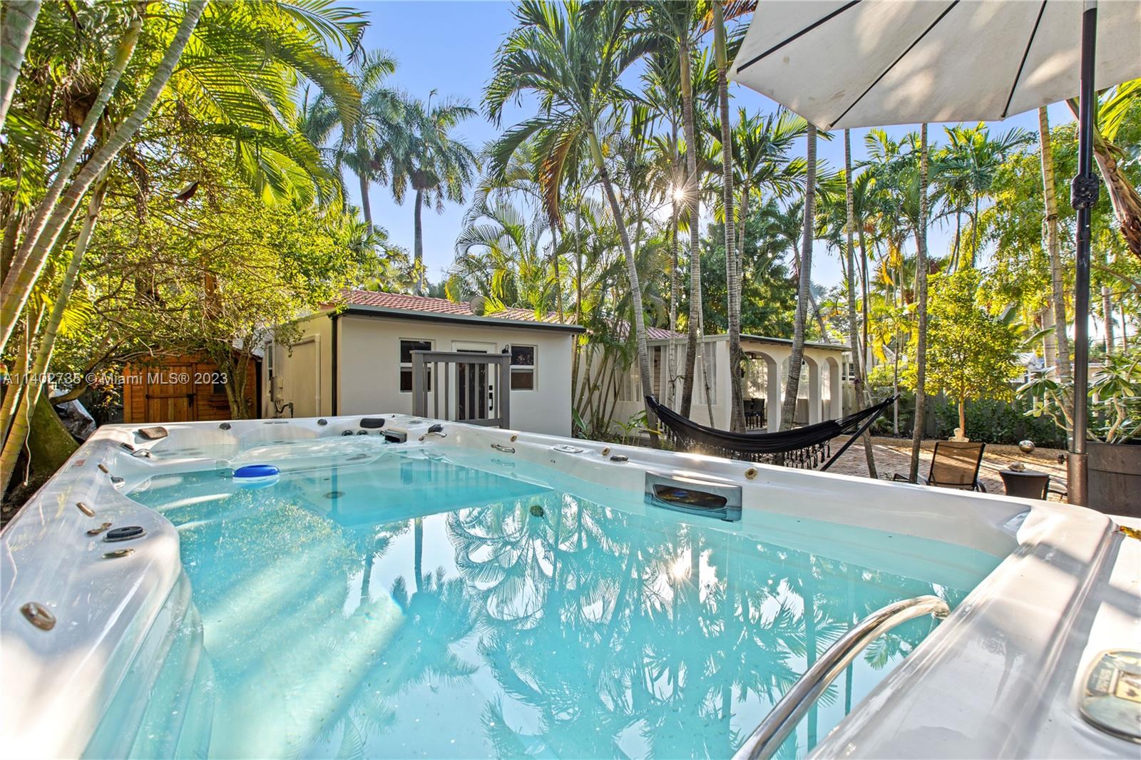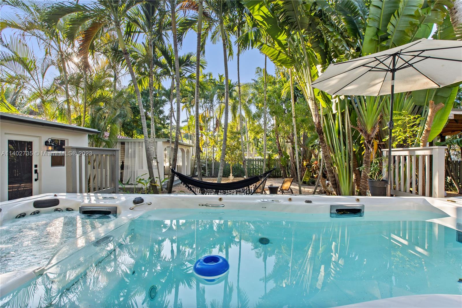 Elegant 2 bedroom / 2 bath home with a lot of character. Tastefully designed interior with a beautiful kitchen featuring a professional gas stove, ss appliances, and custom cabinetry. Wood flooring, exposed wood beams and fireplace. One bath has a unique claw bottom tub and the other is an oversized primary bath. New impact windows/doors. Your private tropical oasis awaits. Enjoy your private fenced resort-inspired backyard w deck & jacuzzi/spa and two under cover outdoor living spaces great for entertaining. Chicago brick surrounding the home plus a coral retaining wall. Incredible location, 1 1/2 blocks from Southlake, approximately 1 mile from the beach and Downtown Hollywood. Some furnishings available for sale. Chandelier in foyer does not convey/will be replaced.