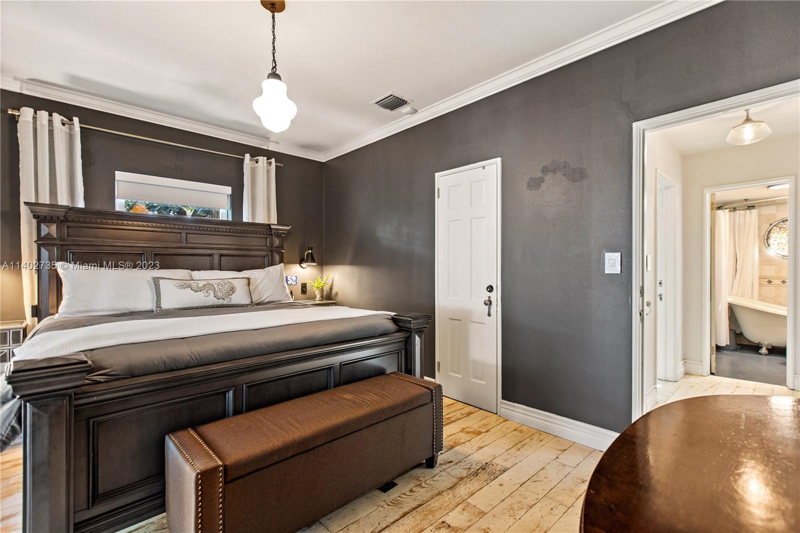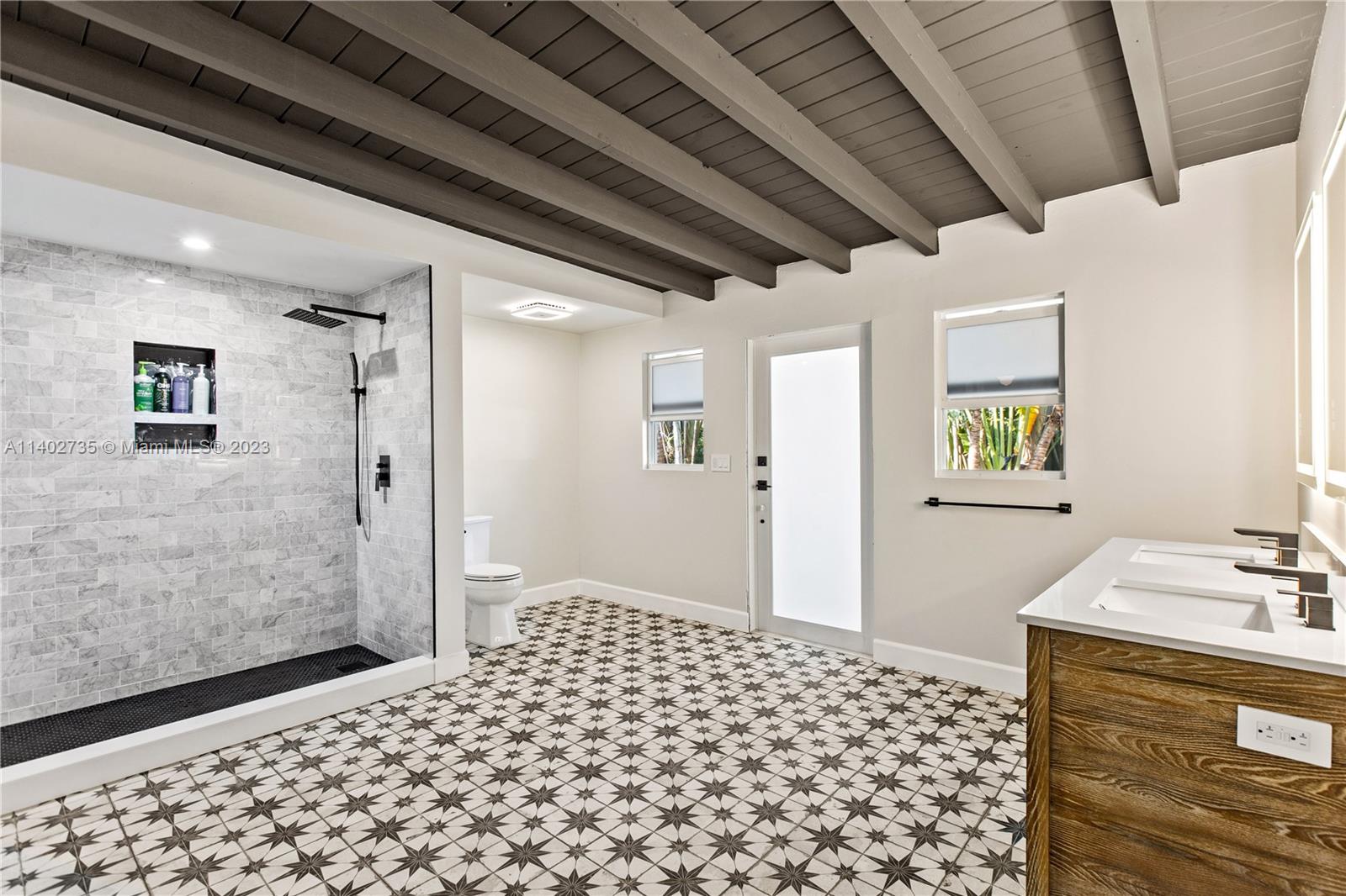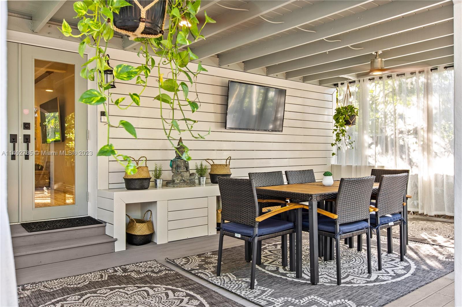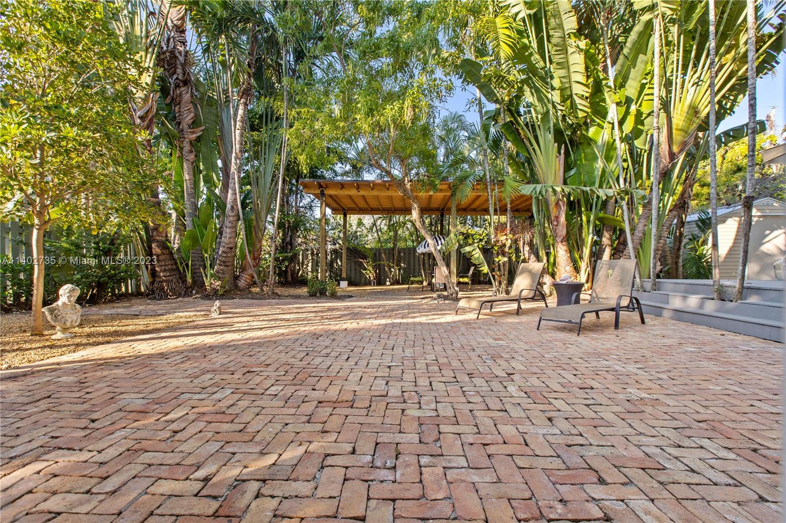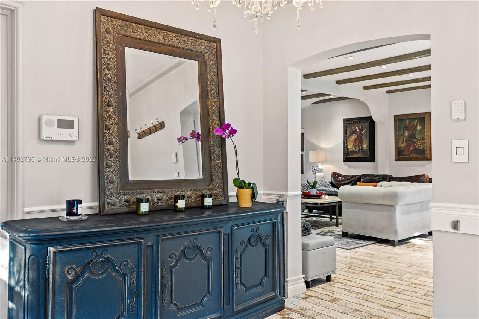 Elegant 2 bedroom / 2 bath home with a lot of character. Tastefully designed interior with a beautiful kitchen featuring a professional gas stove, ss appliances, and custom cabinetry. Wood flooring, exposed wood beams and fireplace. One bath has a unique claw bottom tub and the other is an oversized primary bath. New impact windows/doors. Your private tropical oasis awaits. Enjoy your private fenced resort-inspired backyard w deck & jacuzzi/spa and two under cover outdoor living spaces great for entertaining. Chicago brick surrounding the home plus a coral retaining wall. Incredible location, 1 1/2 blocks from Southlake, approximately 1 mile from the beach and Downtown Hollywood. Some furnishings available for sale. Chandelier in foyer does not convey/will be replaced.