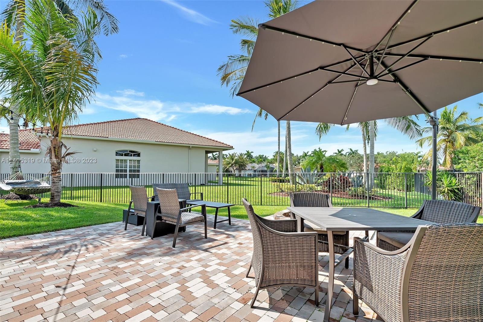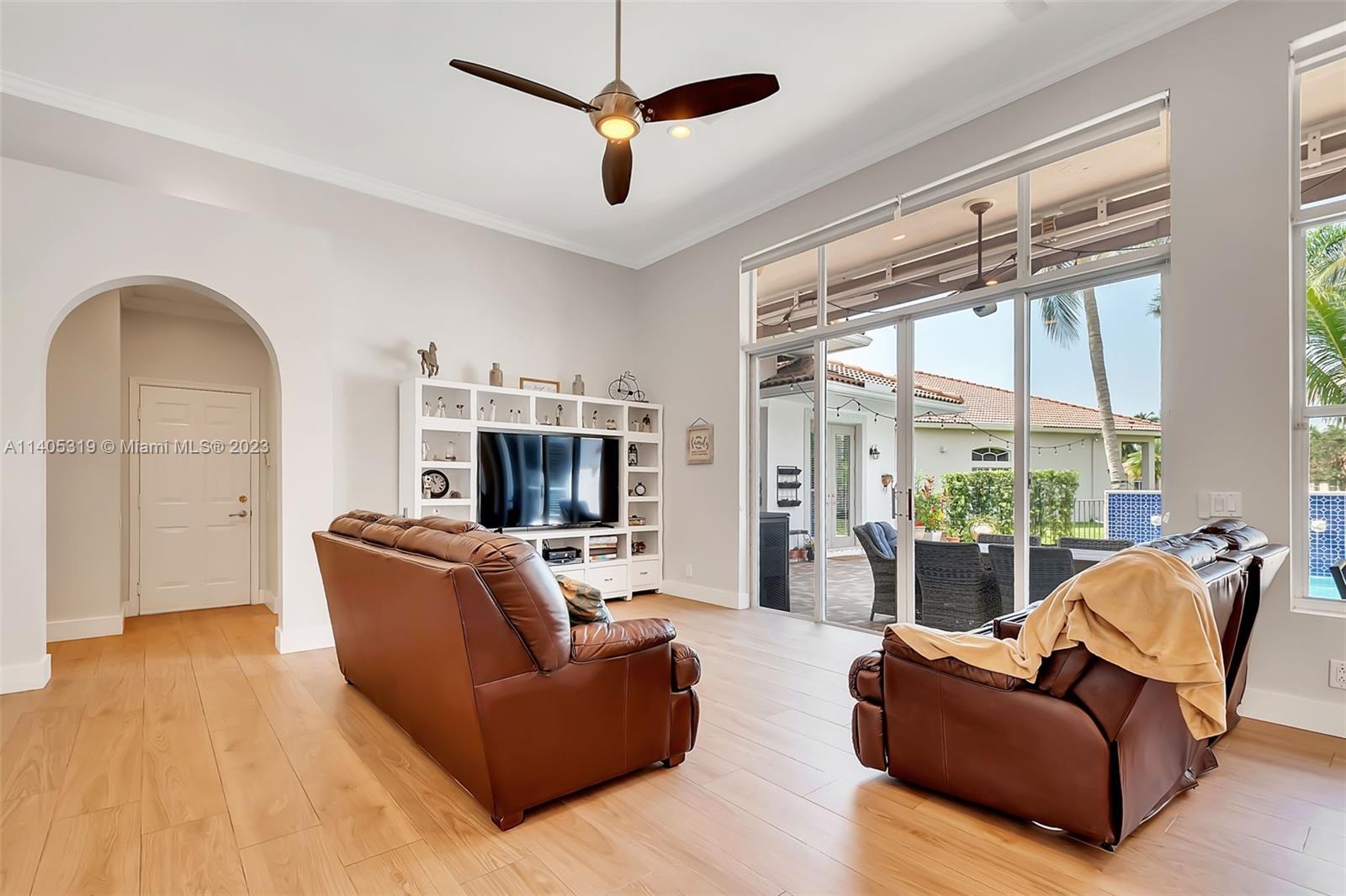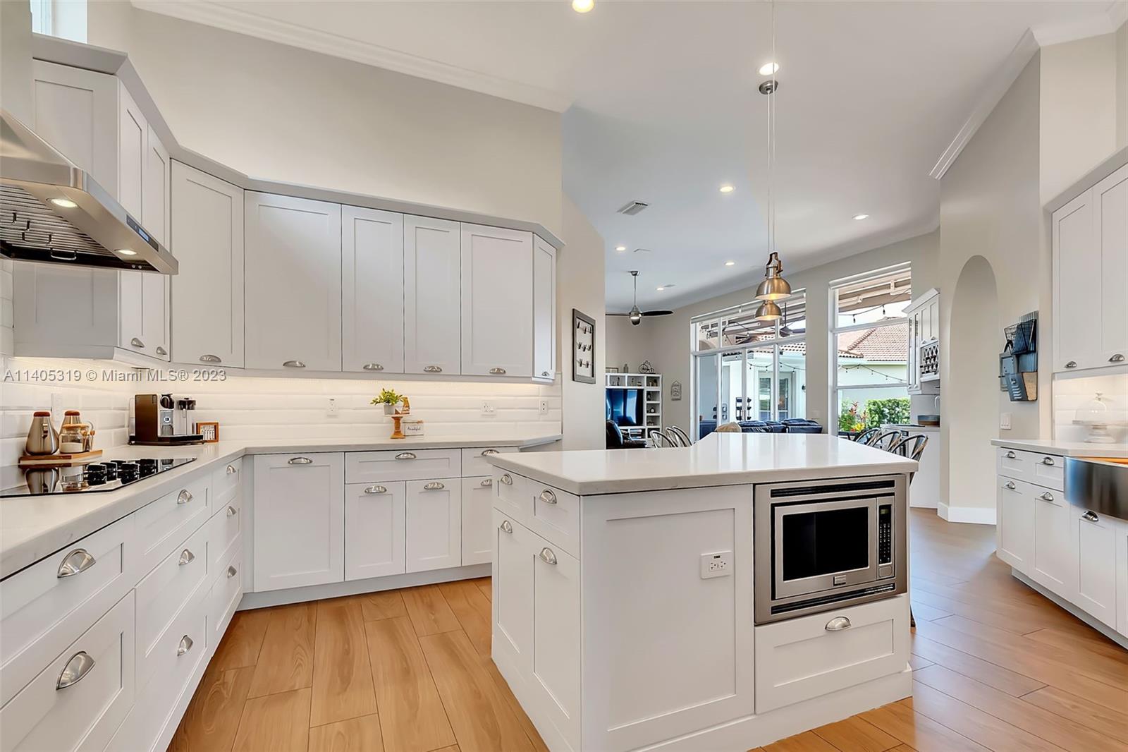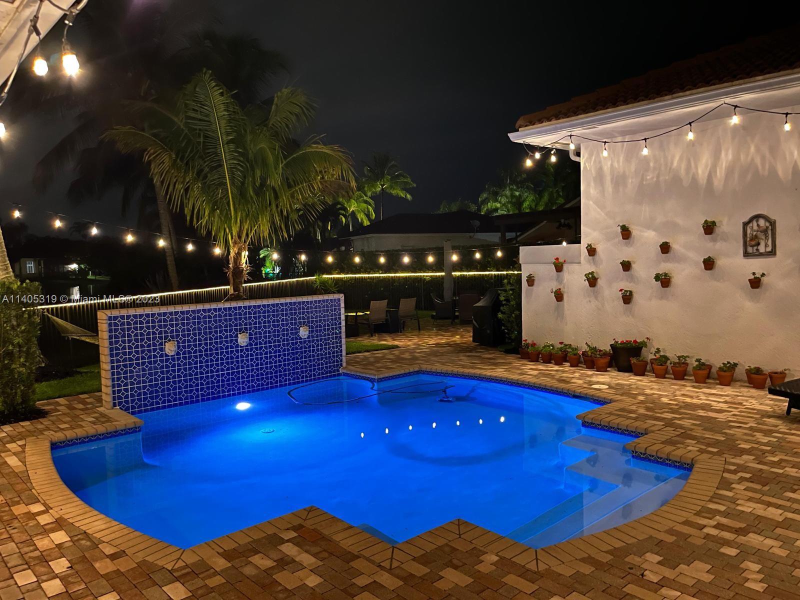 Discover luxury living in this beautiful "courtyard model" home nestled in a cul-de-sac in the prestigious Weston Hills golf community. The home has a main house with 3 beds/3 baths and an additional 4th room and bathroom located in the guest house. The pool was resurfaced in 2020 and has a serene waterfall. Elegant wood-looking floor tiles adorn the entire home. The designer kitchen boasts white quartz countertops, white wood cabinets, a smart double oven, a 60" refrigerator, an electric stove top with an outside venting range hood, a bar with a wine cooler, and an oversized island—great for entertaining. The master bedroom features a pool-view sitting area. Plantation shutters and remodeled bathrooms add to the allure. Near a community park just a short walk away. Weston A+ Schools.