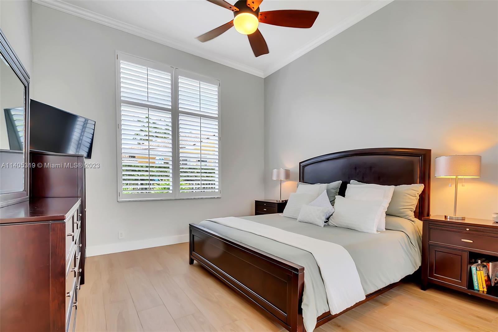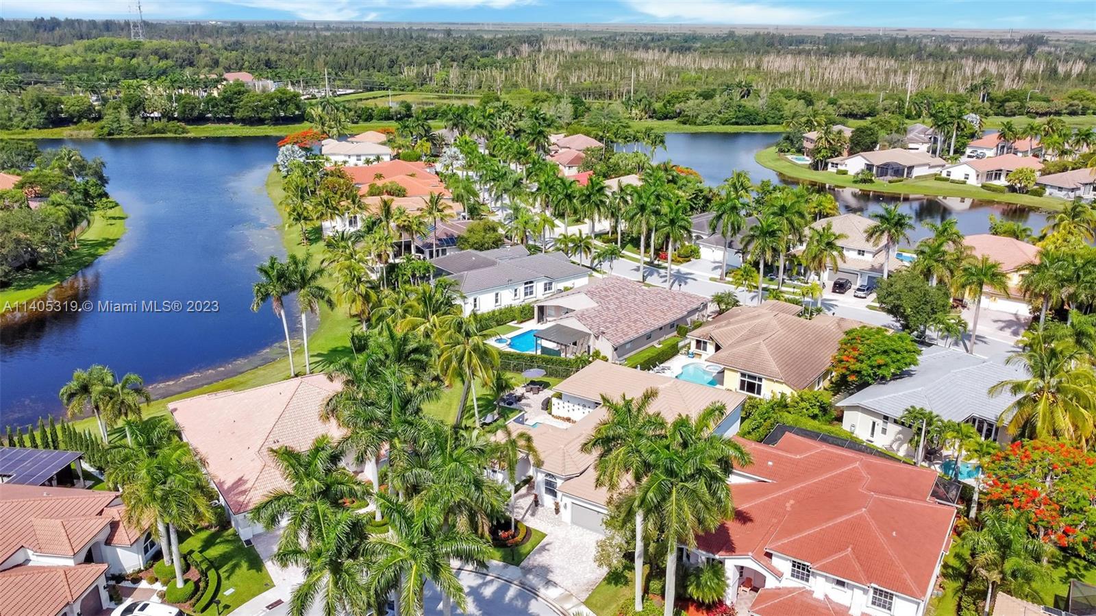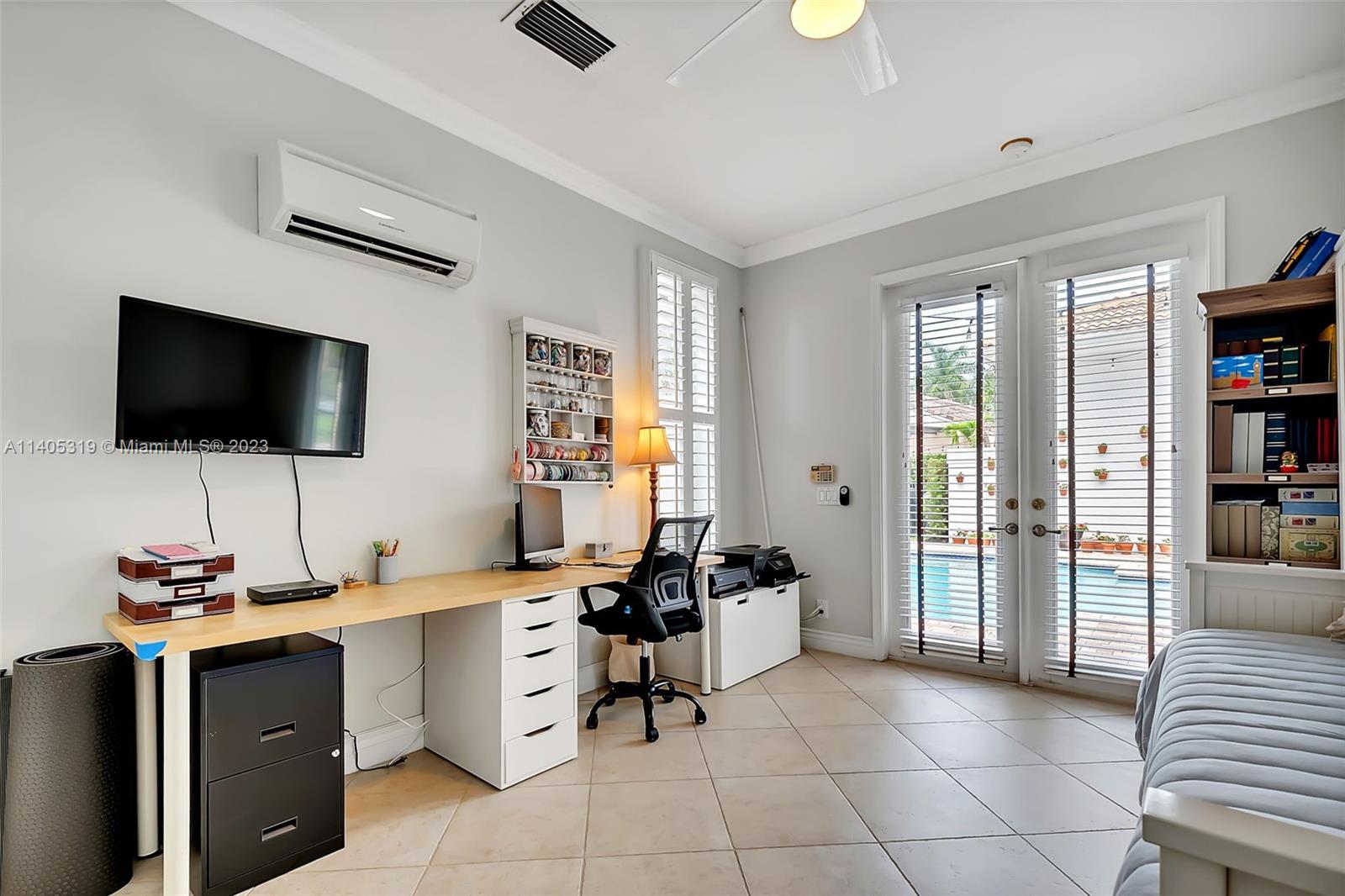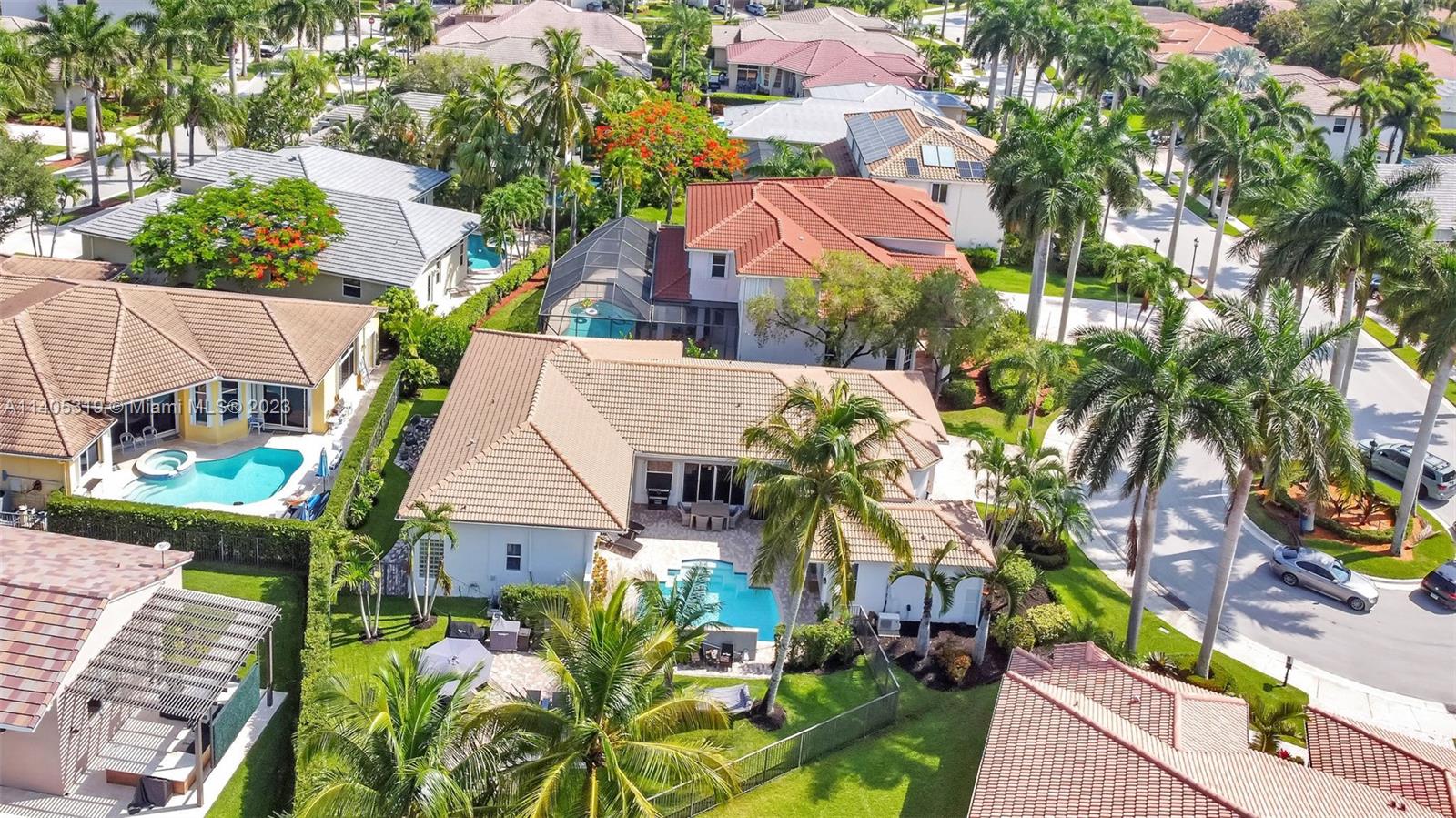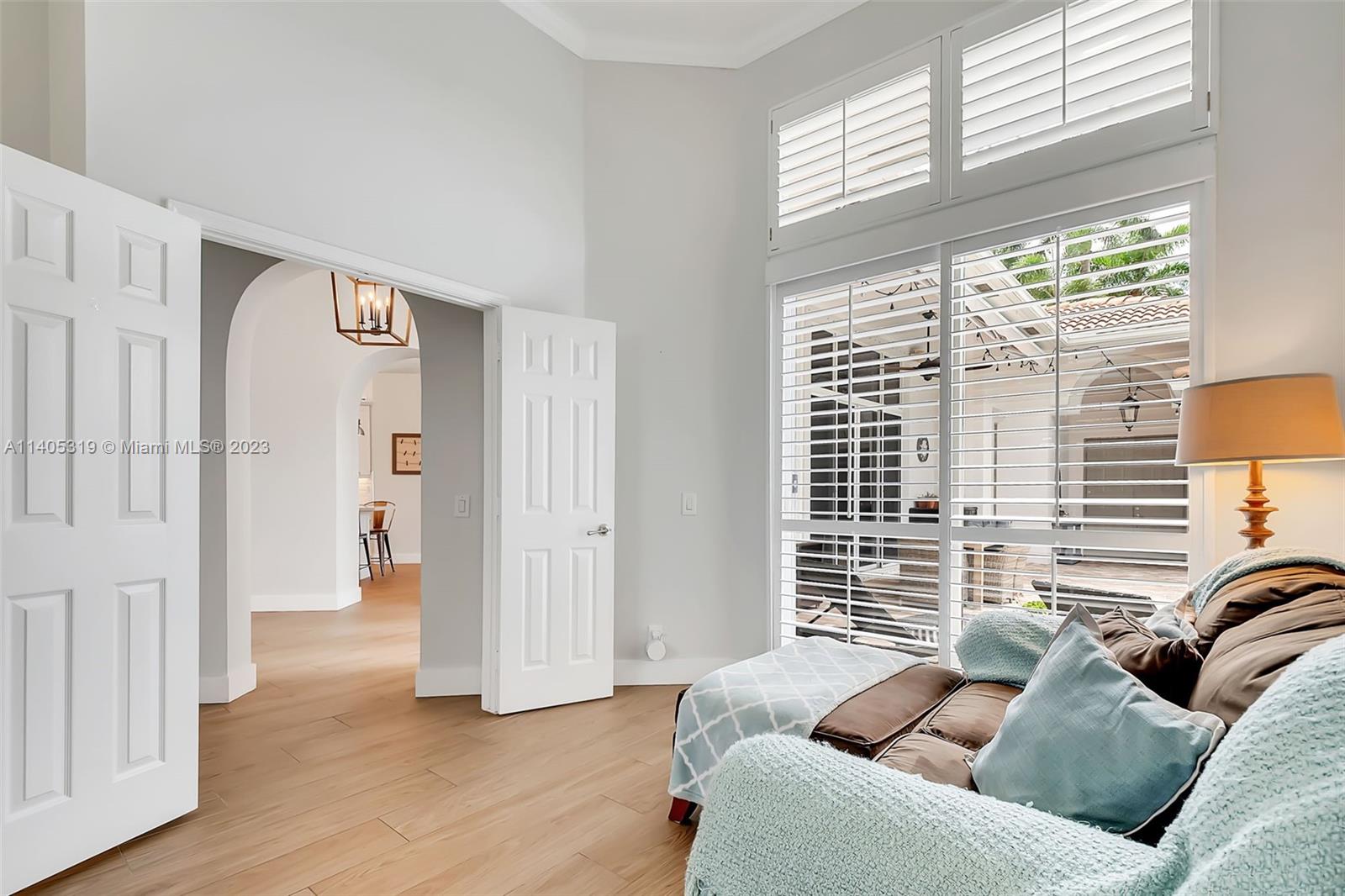 Discover luxury living in this beautiful "courtyard model" home nestled in a cul-de-sac in the prestigious Weston Hills golf community. The home has a main house with 3 beds/3 baths and an additional 4th room and bathroom located in the guest house. The pool was resurfaced in 2020 and has a serene waterfall. Elegant wood-looking floor tiles adorn the entire home. The designer kitchen boasts white quartz countertops, white wood cabinets, a smart double oven, a 60" refrigerator, an electric stove top with an outside venting range hood, a bar with a wine cooler, and an oversized island—great for entertaining. The master bedroom features a pool-view sitting area. Plantation shutters and remodeled bathrooms add to the allure. Near a community park just a short walk away. Weston A+ Schools.