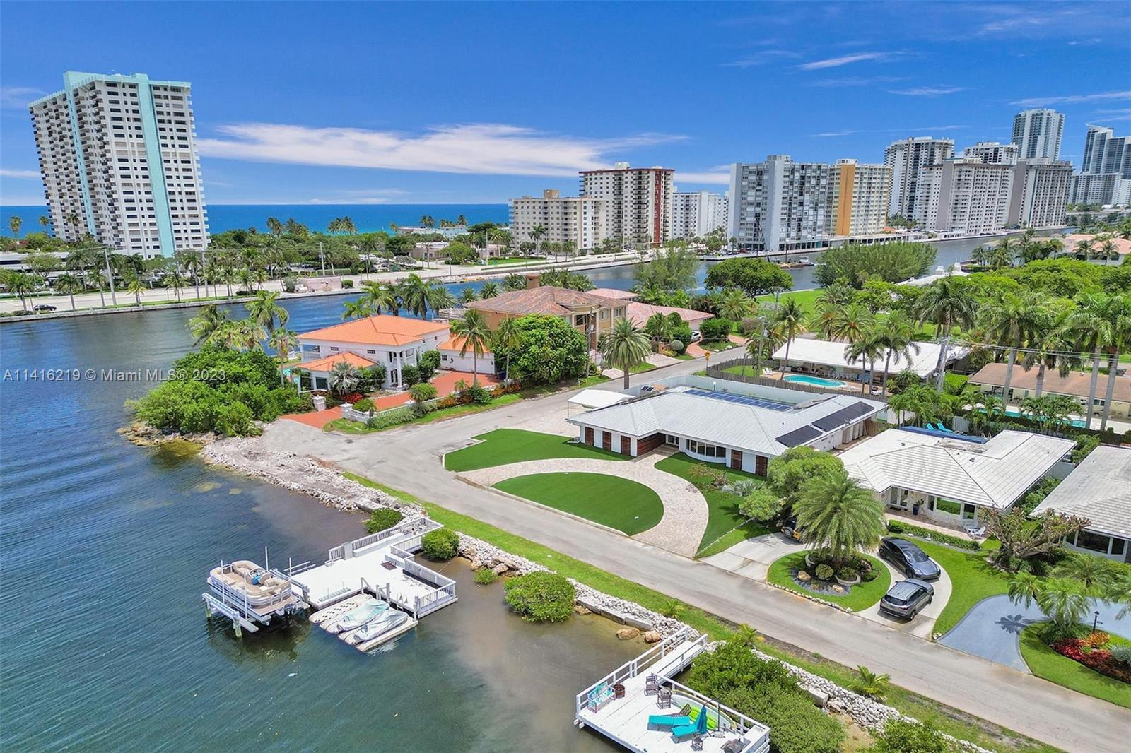 FLORIDA DREAM HOME FOR SALE!!! A 4B/3B single family home for sale in the heart of the Hollywood Beach FL. This jewel has 100 feet of shoreline. The home faces the only water sports friendly ocean access lake in south Florida. You can water ski, boat and dine on the local sand bar. This Property is in a rare double corner lot 100x125 with a new spacious private dock. The home features 4B/3B with 2,554 sf living area, solar panels, metal roof, maintenance free yard Astro turf, saltwater pool, paved circular driveway, hurricane glass windows/doors throughout, modern baths, great modern eat-in kitchen w/ stainless steel appliances, European's closets cabinetry & built-in garage cabinets and floors. The sale includes boat lift, generator, sauna, BBQ grill, and hot tub. You must come see it!