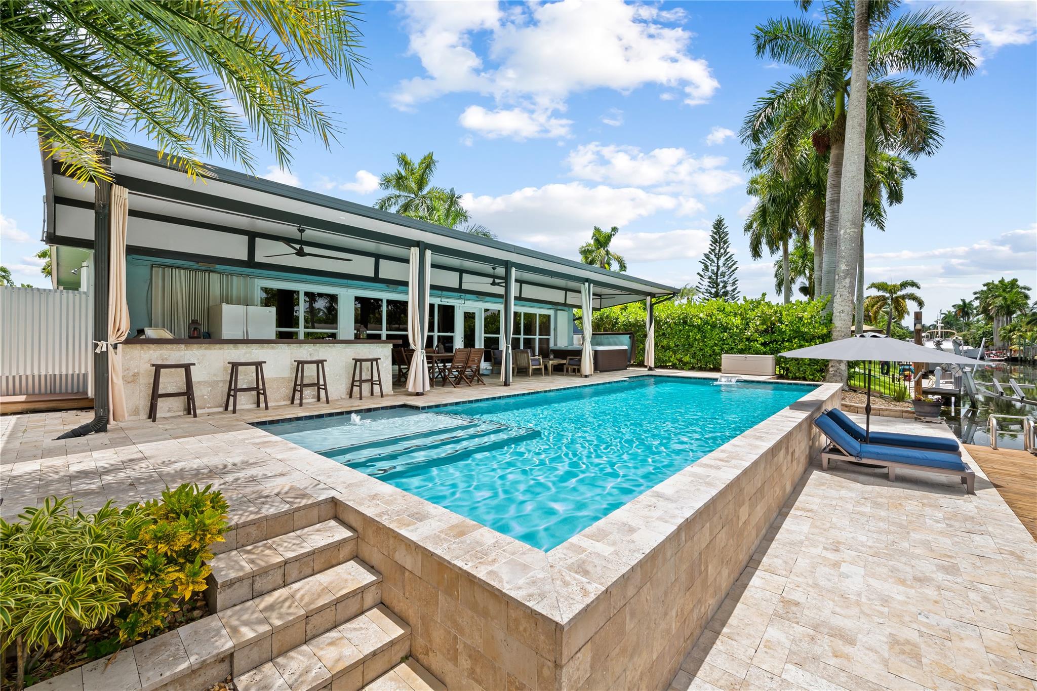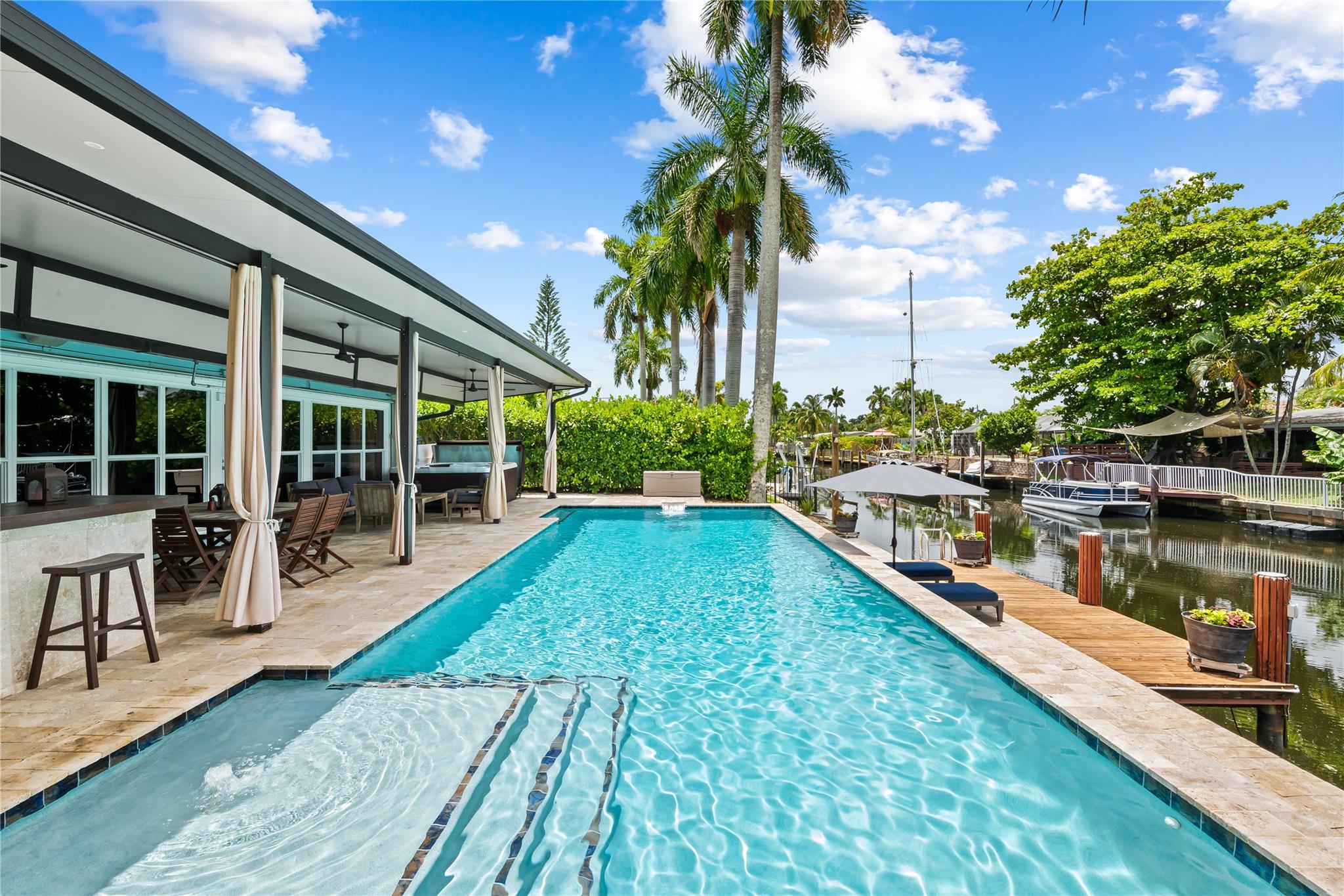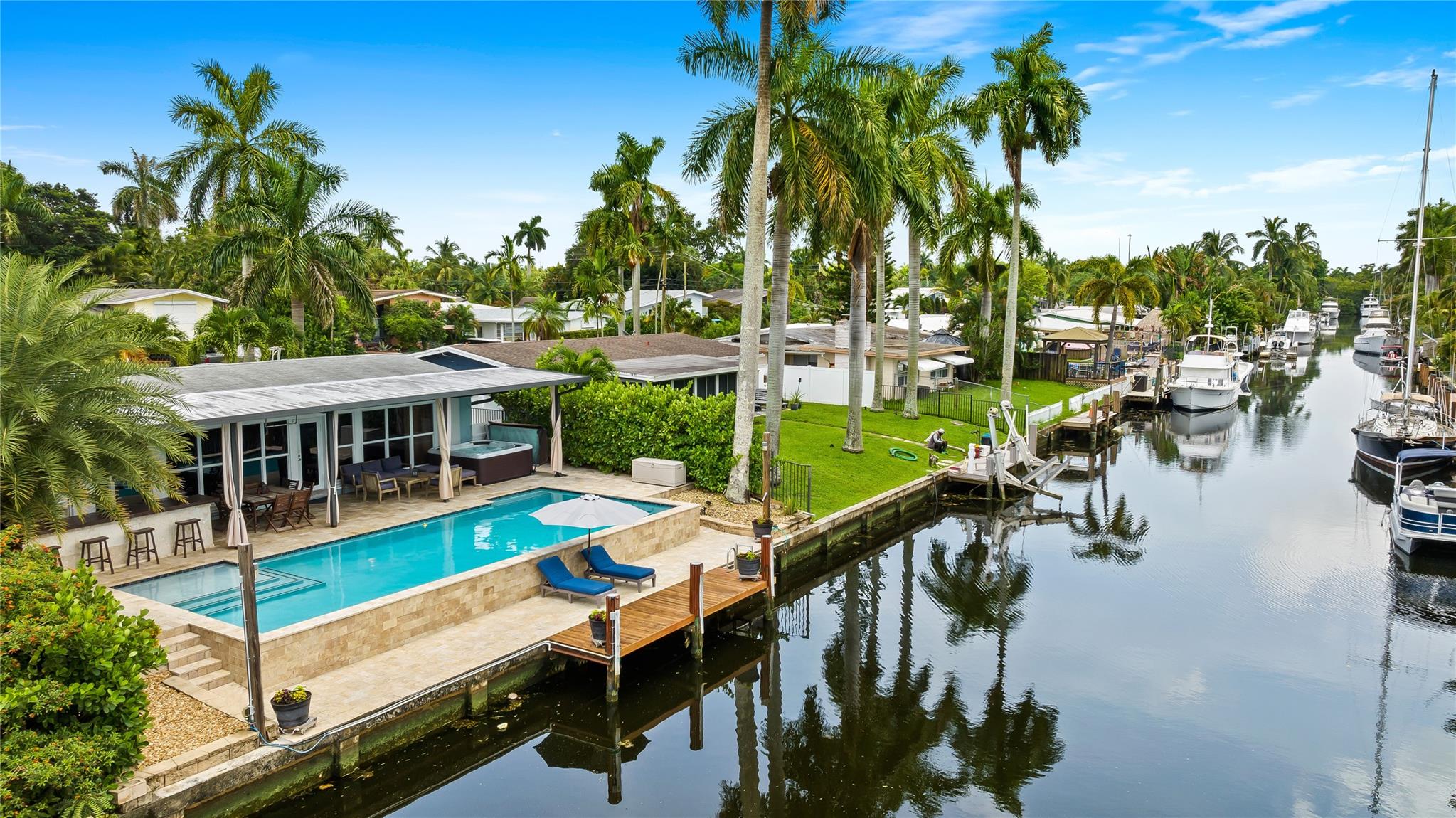 YOUR 65FT WATERFRONT 3BR | 2BA POOL HOME awaits for you! Your home features an extended driveway great for Boats, and RV'S. As you walk inside the grand foyer entry, you will be greeted with an Open Floor Plan great for entertaining. Updated Kitchen features Quartz Countertops and stainless steel appliances. Vaulted Ceilings and terrazzo floors throughout your home! Spacious Master Bedroom bath with Tub and Shower. The private backyard is a retreat with modern travertine, beautiful 20,000 Gallon Salt Water Pool, Separate Hot Tub, outdoor shower and a kitchen. A 65ft-Sea Wall accompanied by a 20ft-dock and option to extend the dock. Added water and 30 amp shore power for a boat completes this waterfront paradise!