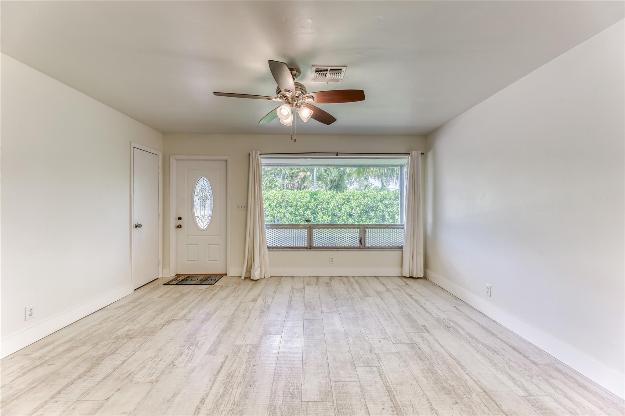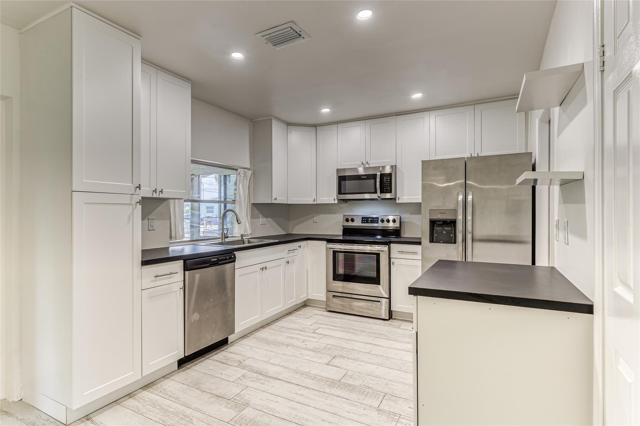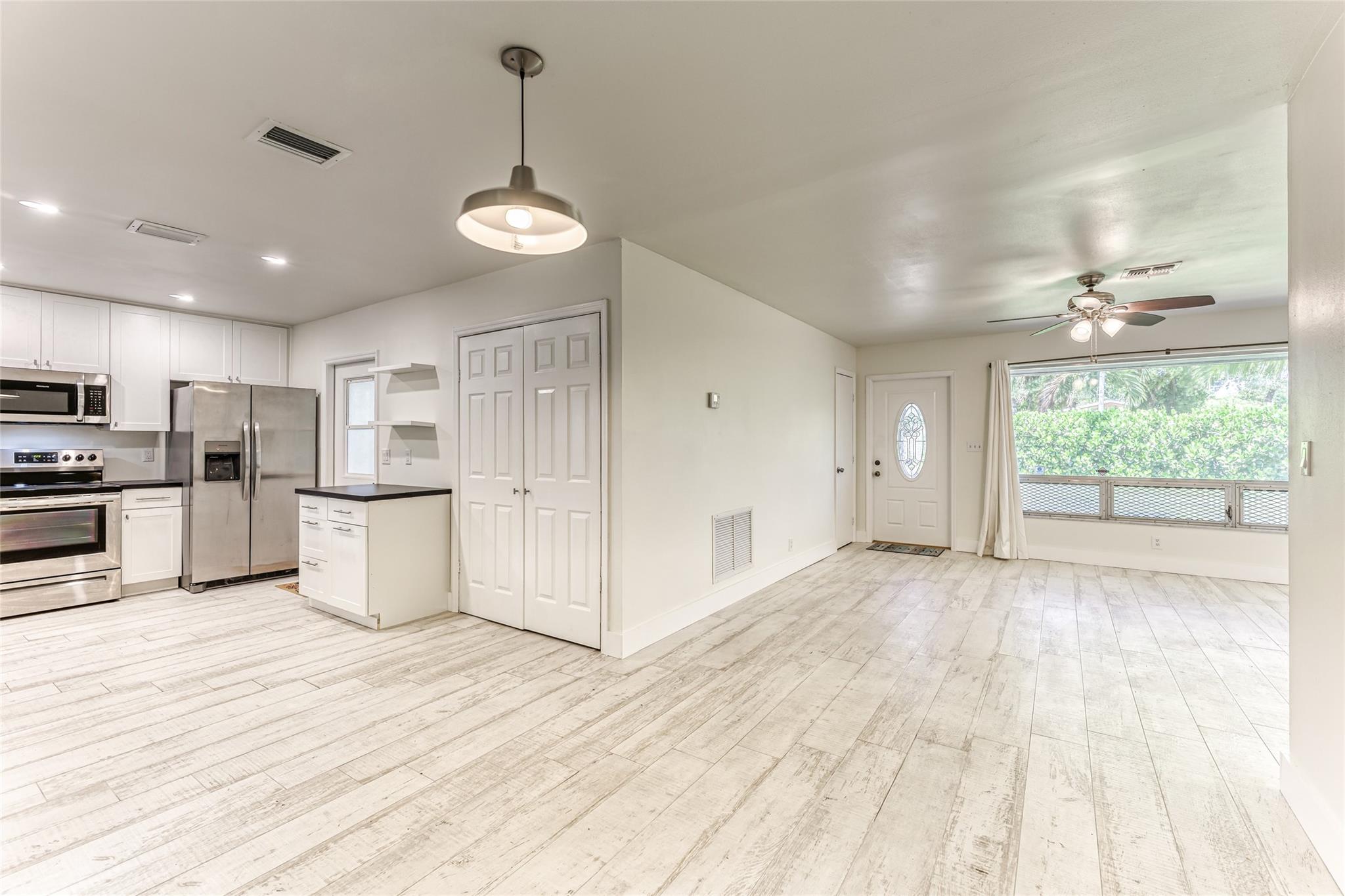 Enjoy this updated 2 bedroom, 1 bath home with a 1 car carport in the heart of Pompano Beach. This freshly painted home features a New Roof 2023, New Kitchen 2022, Updated Bathroom 2022 & new wood-plank tile throughout the entire home 2022. Enjoy entertaining in this large kitchen with white cabinets, new appliances, floating shelves, and tons of great storage. The living room is large with tons of natural light and dining room has french doors out to the back screened patio and backyard. The home also features new duct work, indoor laundry room, updated electrical, large back screened patio that is perfect for extending living space. The home has a huge fenced yard with tons of room for boat, car and RV parking. Centrally located and close to great dining, shopping and transportation.