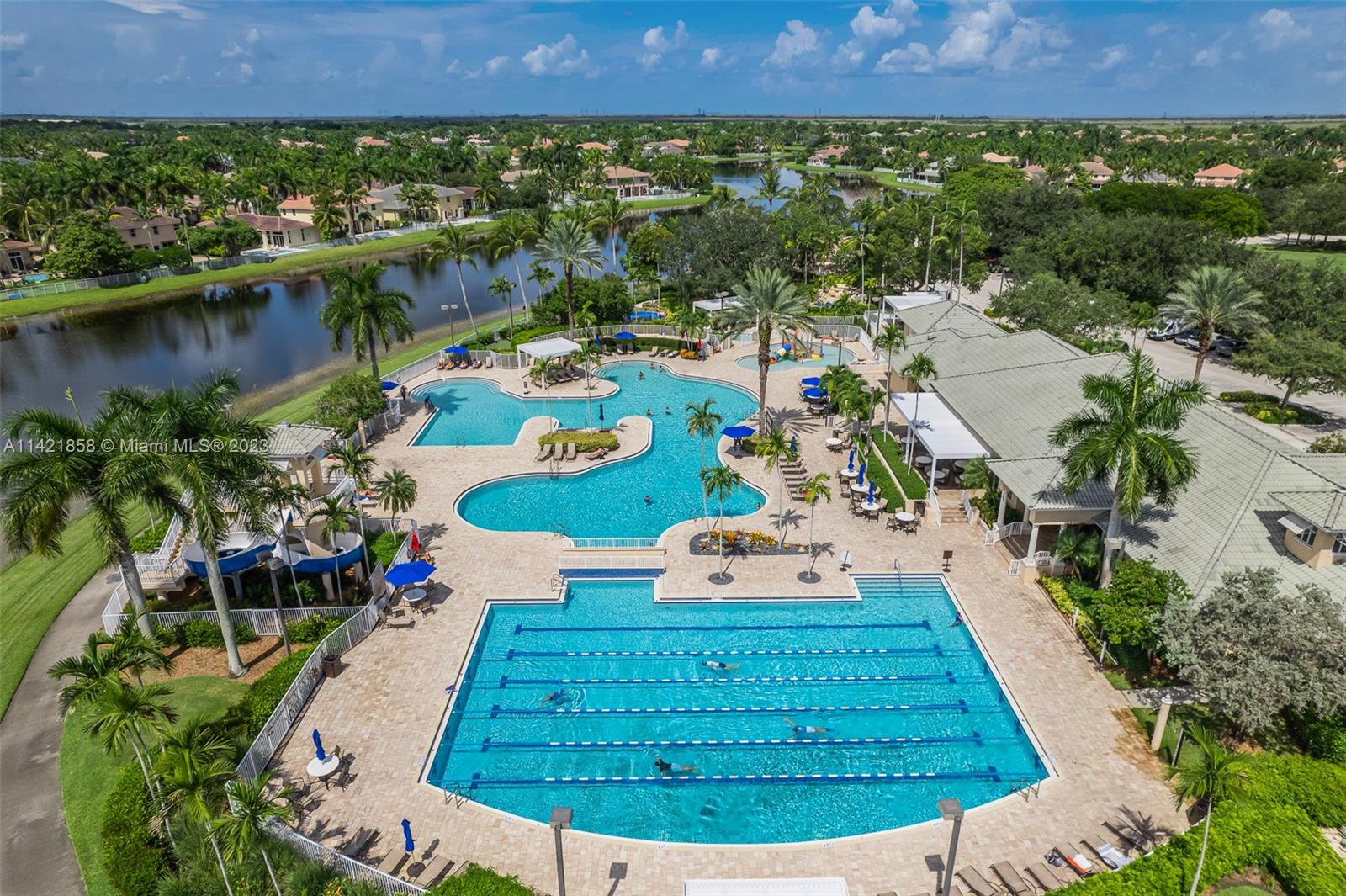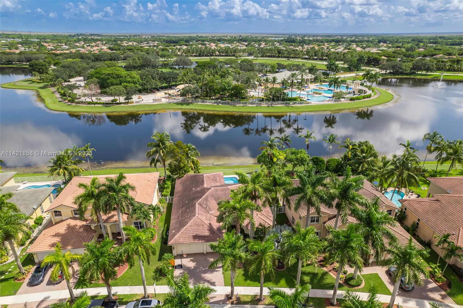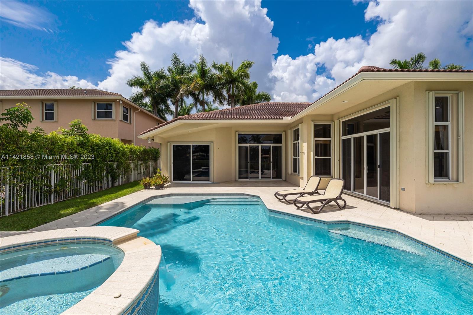 Spectacular premium location in Savanna, The Cove. Quiet royal palm tree street. Location, location, location. This water view home, has lots of natural lighting and an open, bright floor plan. Located in Gated Community of Savanna, 4 bedrooms, 3 bathrooms, 3 car garage, vaulted ceilings, laundry room, accordion shutters and an amazing lake view. Primary bedroom has 2 walk-in closets. Pool area is private. Stunning backyard with covered patio. Fabulous resort-style amenities for the entire family; clubhouse with heated lap pool, resort pool, kids pool, water slide, playground, soccer field, basketball court, hockey rink, BBQ area, miniature golf, and much more. 24 hour guarded gated community near to Weston Regional Park, Publix, restaurants and stores. Excellent A+ schools.