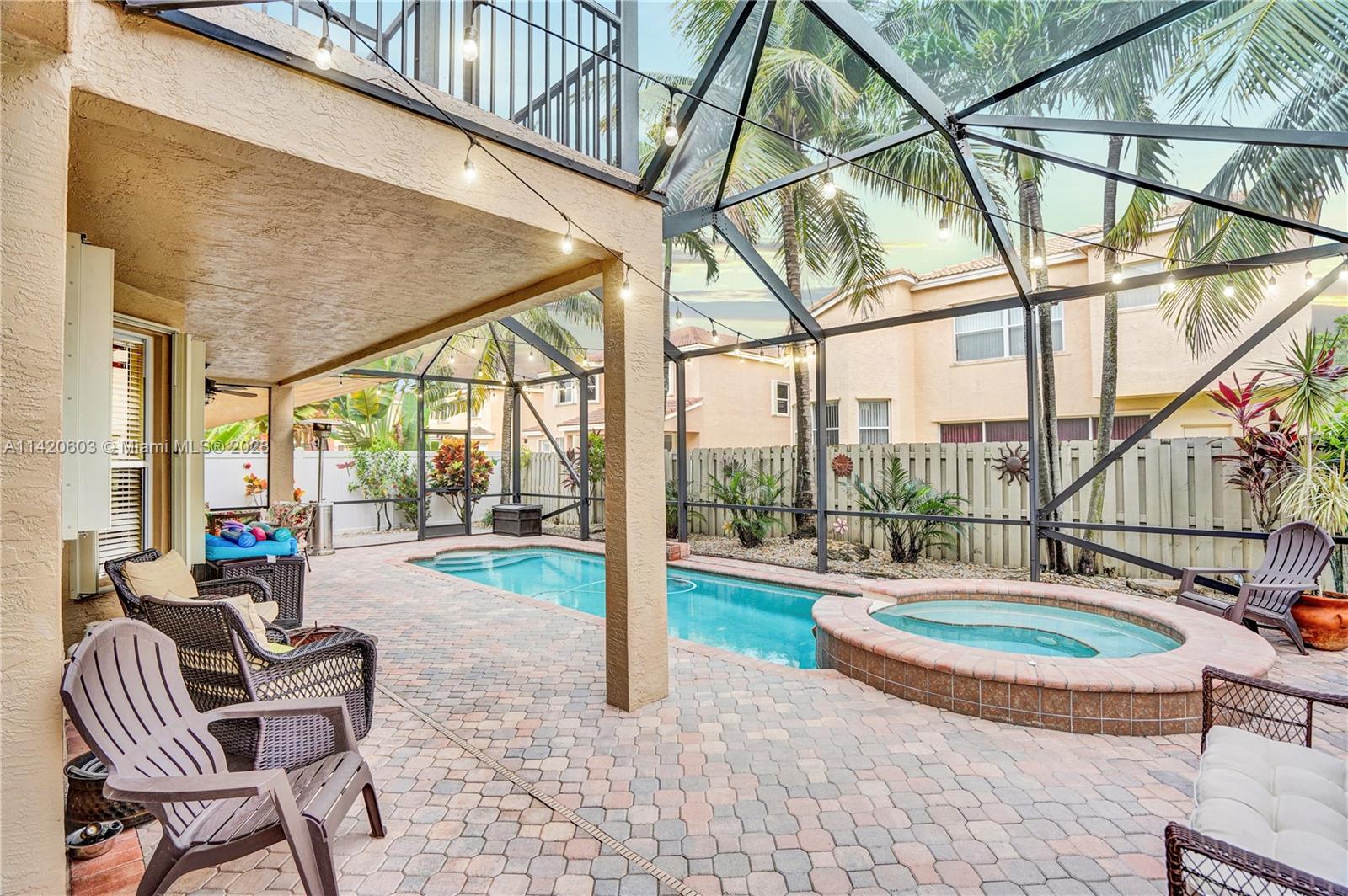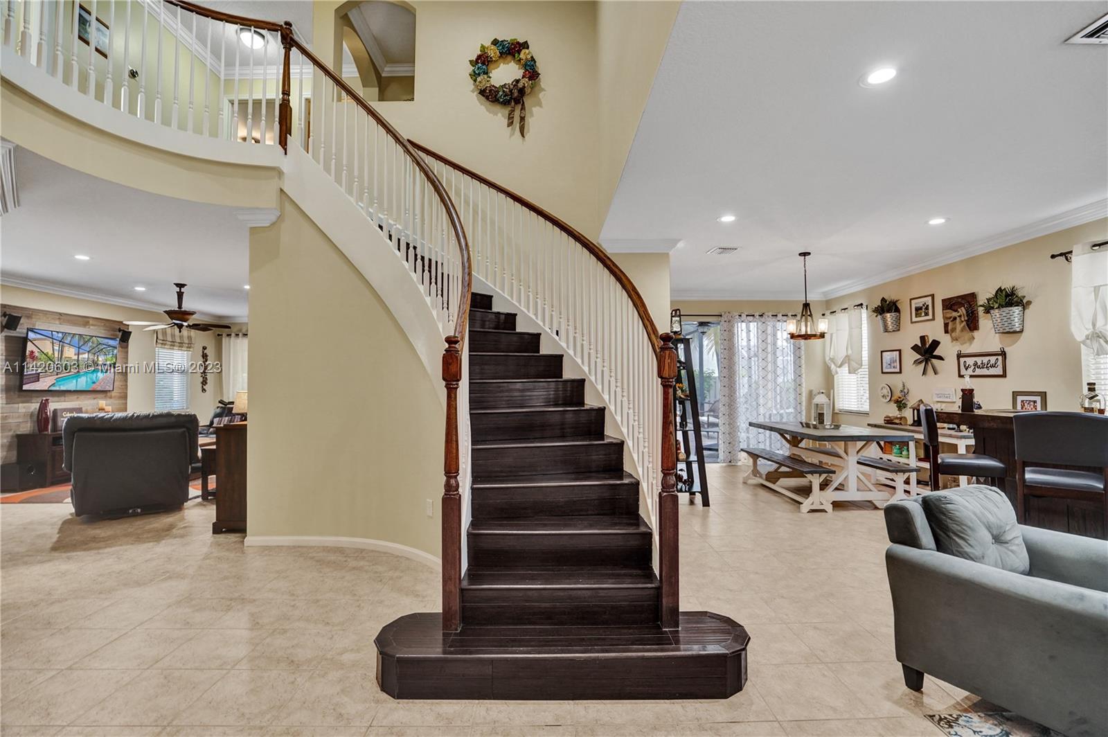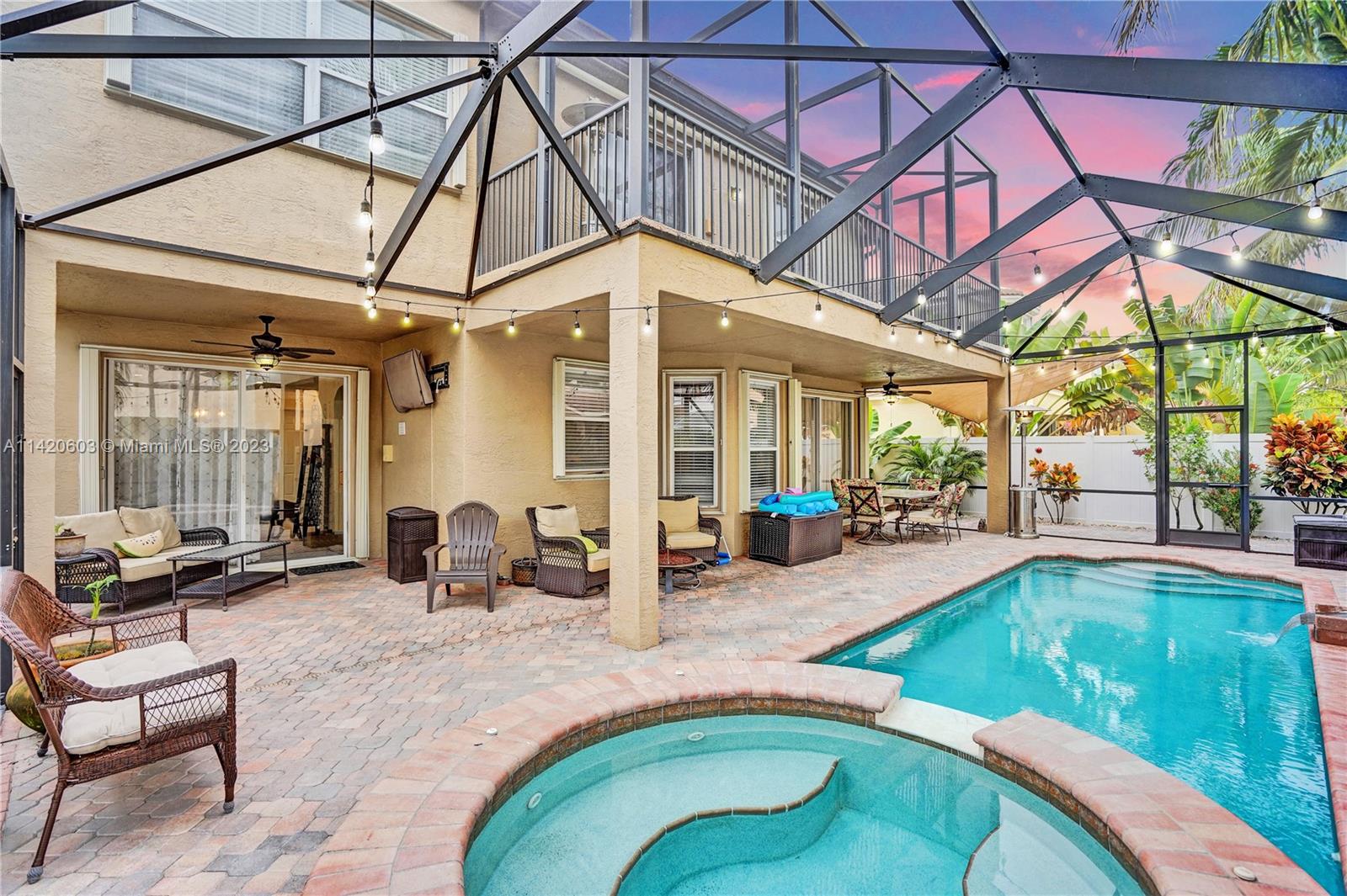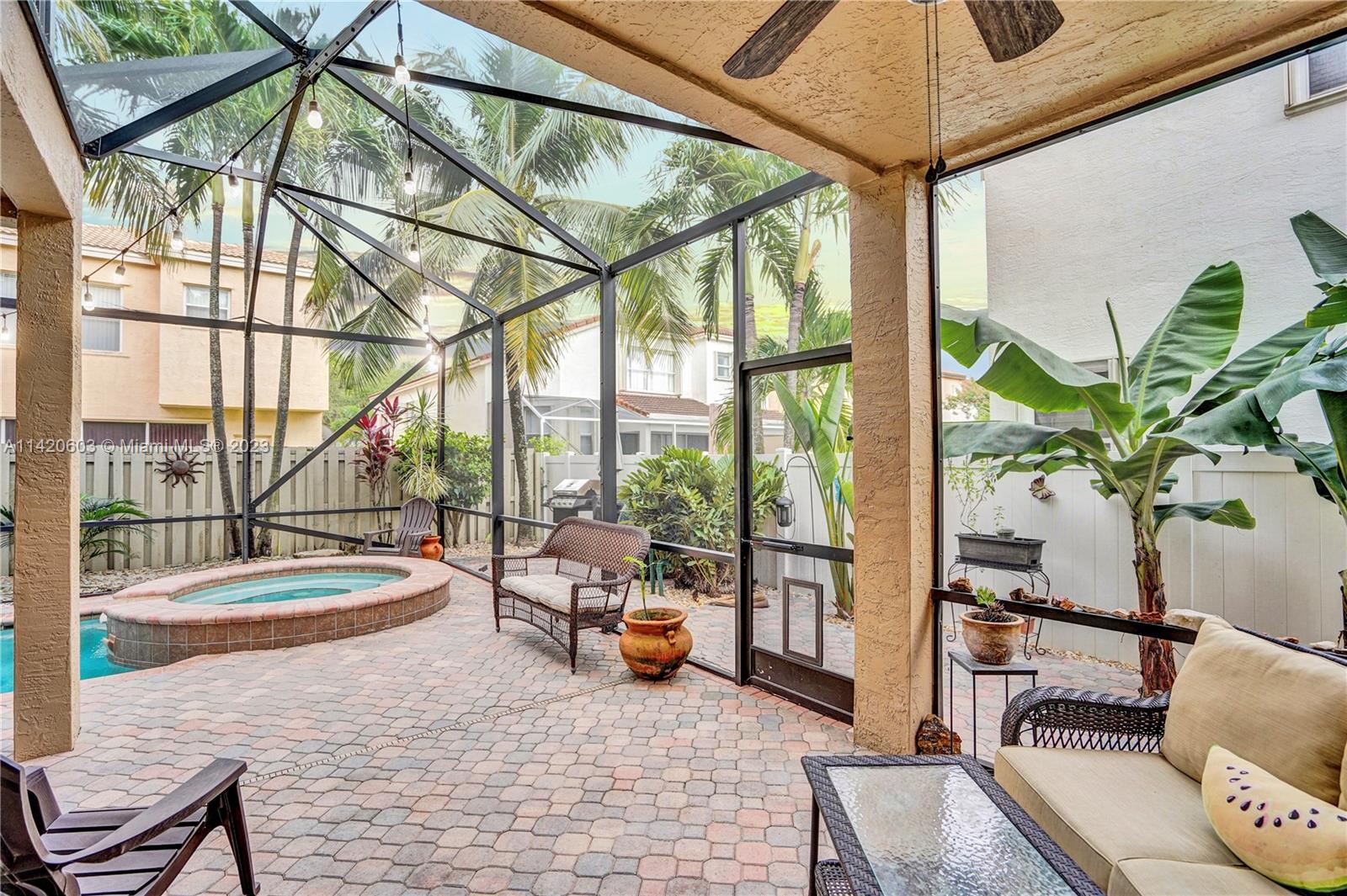 Gorgeous, light & bright – your pool home oasis awaits! This freshly painted, 5 bed, 2.5 bath home features an open concept layout w/tile flooring throughout spacious living areas, a generously sized kitchen w/newer appliances (2021), crown molding & tastefully remodeled baths (2022). The owner's suite comes complete w/2 walk-in closets & a dream spa bath (2023) w/separate shower, freestanding tub & dual sinks. Outdoors, entertaining is easy w/an expanded covered & screened patio, sparkling pool w/new salt cell (2023) & pool pump (2022), fenced yard, banana trees & additional screened balcony w/retractable awning. Accordion shutters for convenience! The gated community of Riviera Isles offers residents a beautiful pool & playground area, tennis, basketball, gym & community security patrol