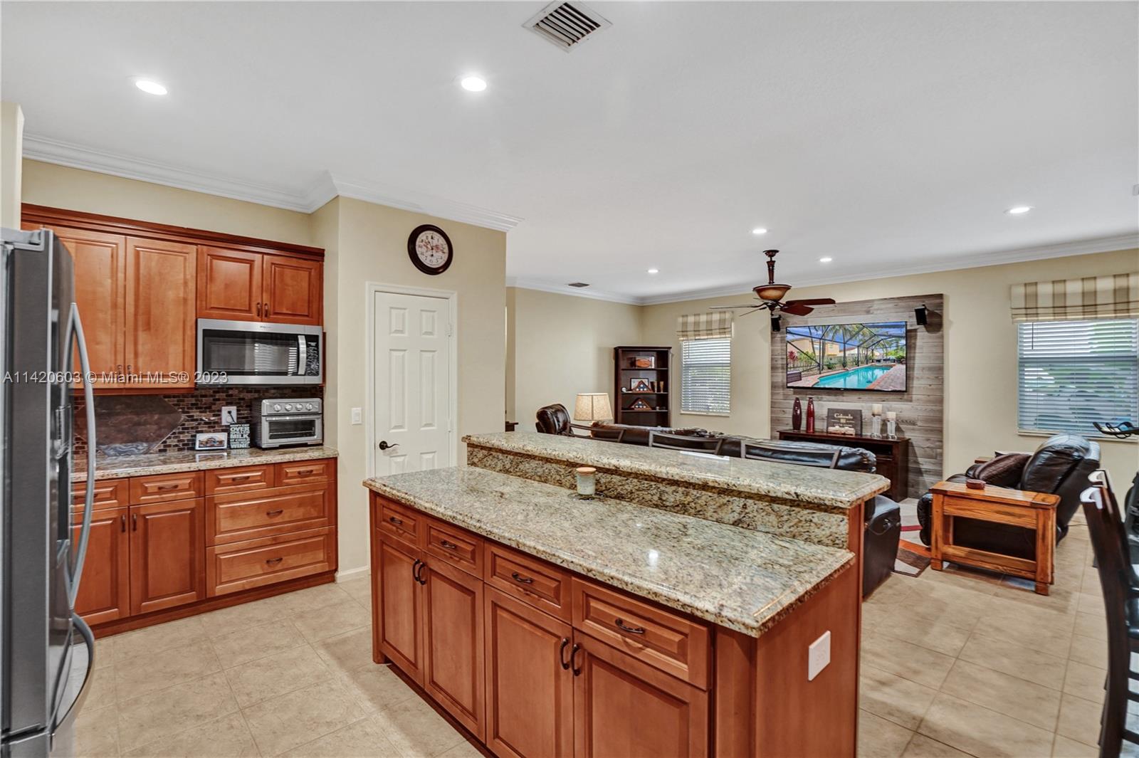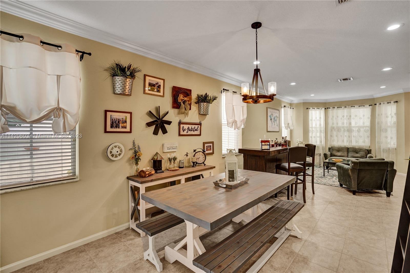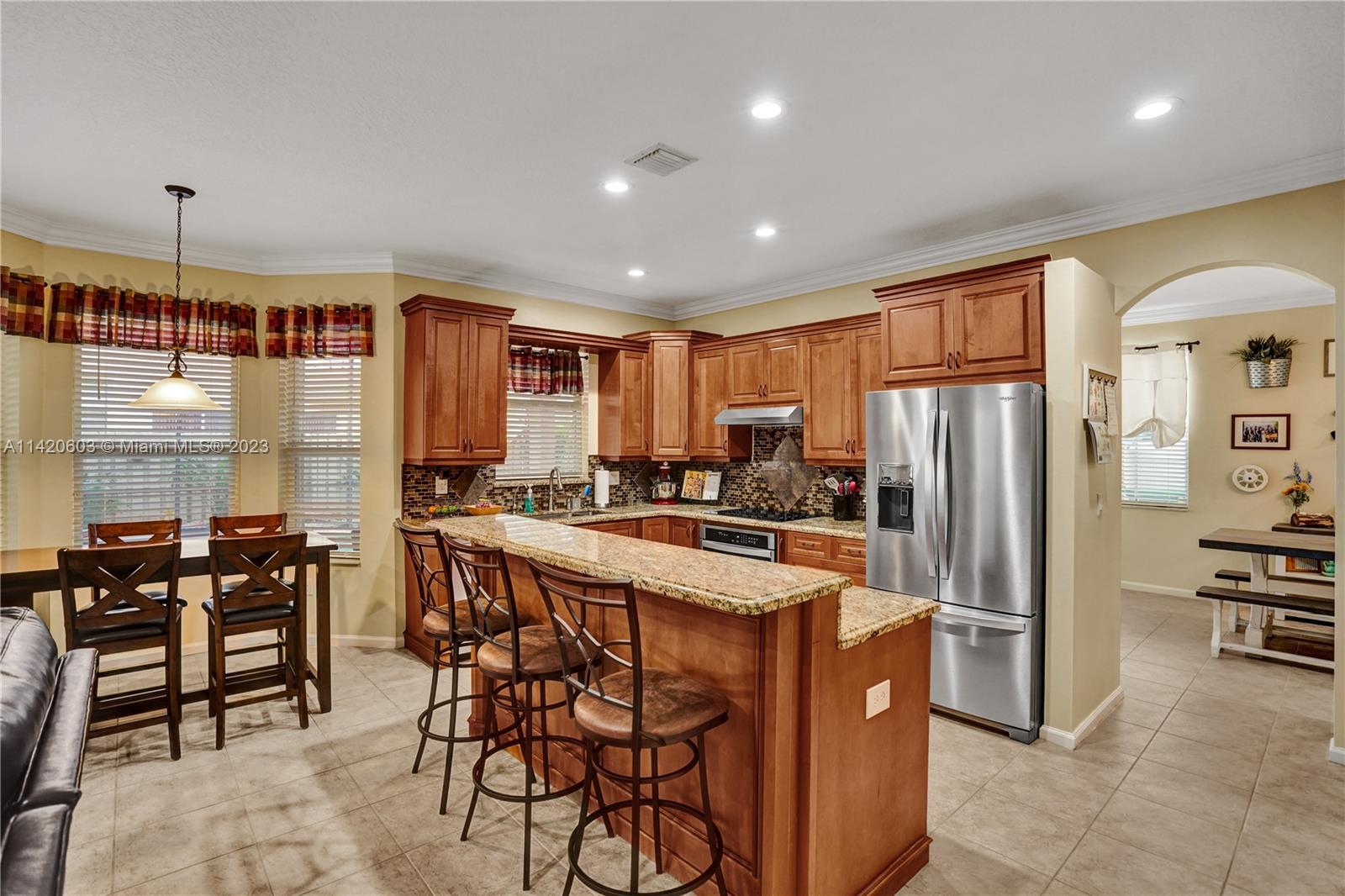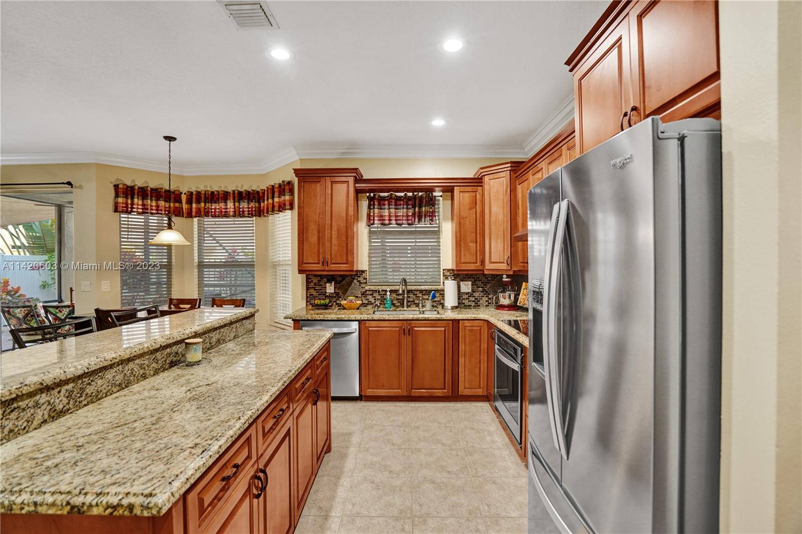 Gorgeous, light & bright – your pool home oasis awaits! This freshly painted, 5 bed, 2.5 bath home features an open concept layout w/tile flooring throughout spacious living areas, a generously sized kitchen w/newer appliances (2021), crown molding & tastefully remodeled baths (2022). The owner's suite comes complete w/2 walk-in closets & a dream spa bath (2023) w/separate shower, freestanding tub & dual sinks. Outdoors, entertaining is easy w/an expanded covered & screened patio, sparkling pool w/new salt cell (2023) & pool pump (2022), fenced yard, banana trees & additional screened balcony w/retractable awning. Accordion shutters for convenience! The gated community of Riviera Isles offers residents a beautiful pool & playground area, tennis, basketball, gym & community security patrol
