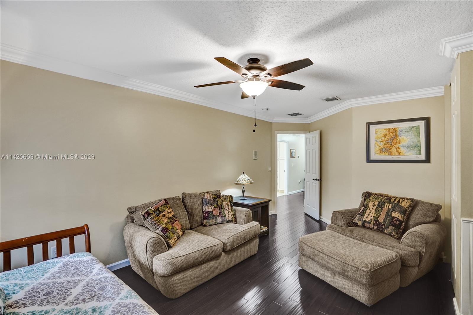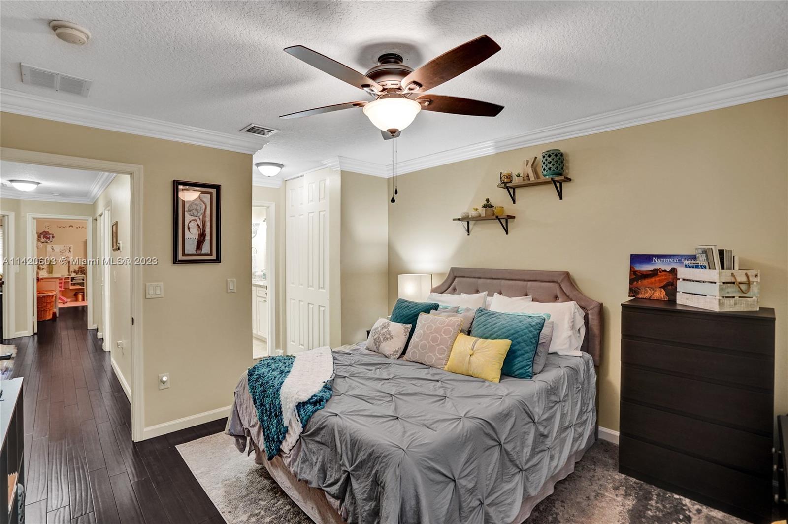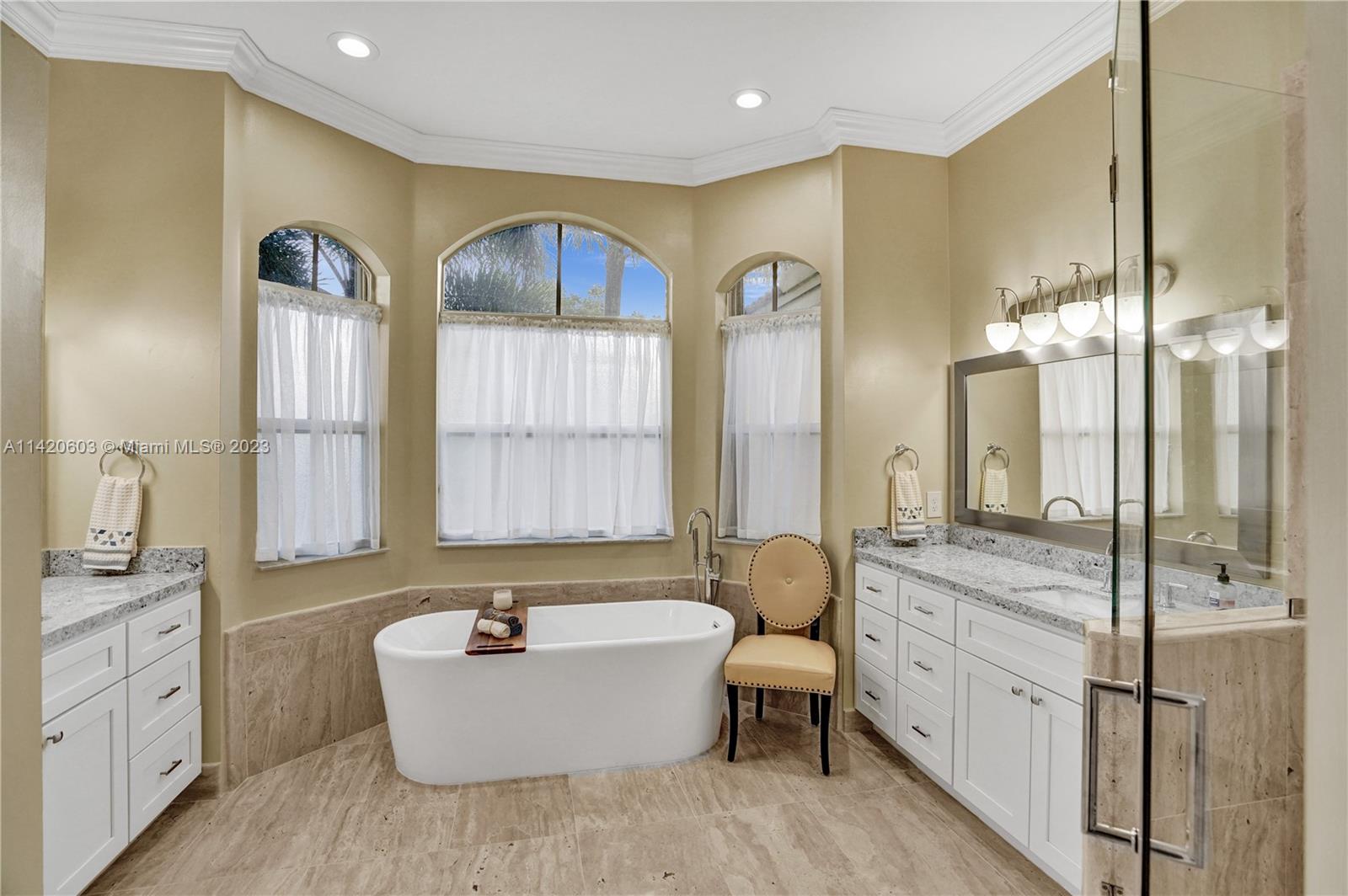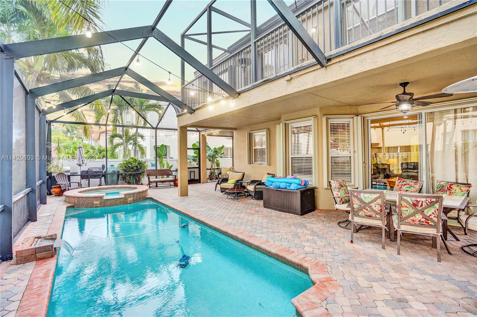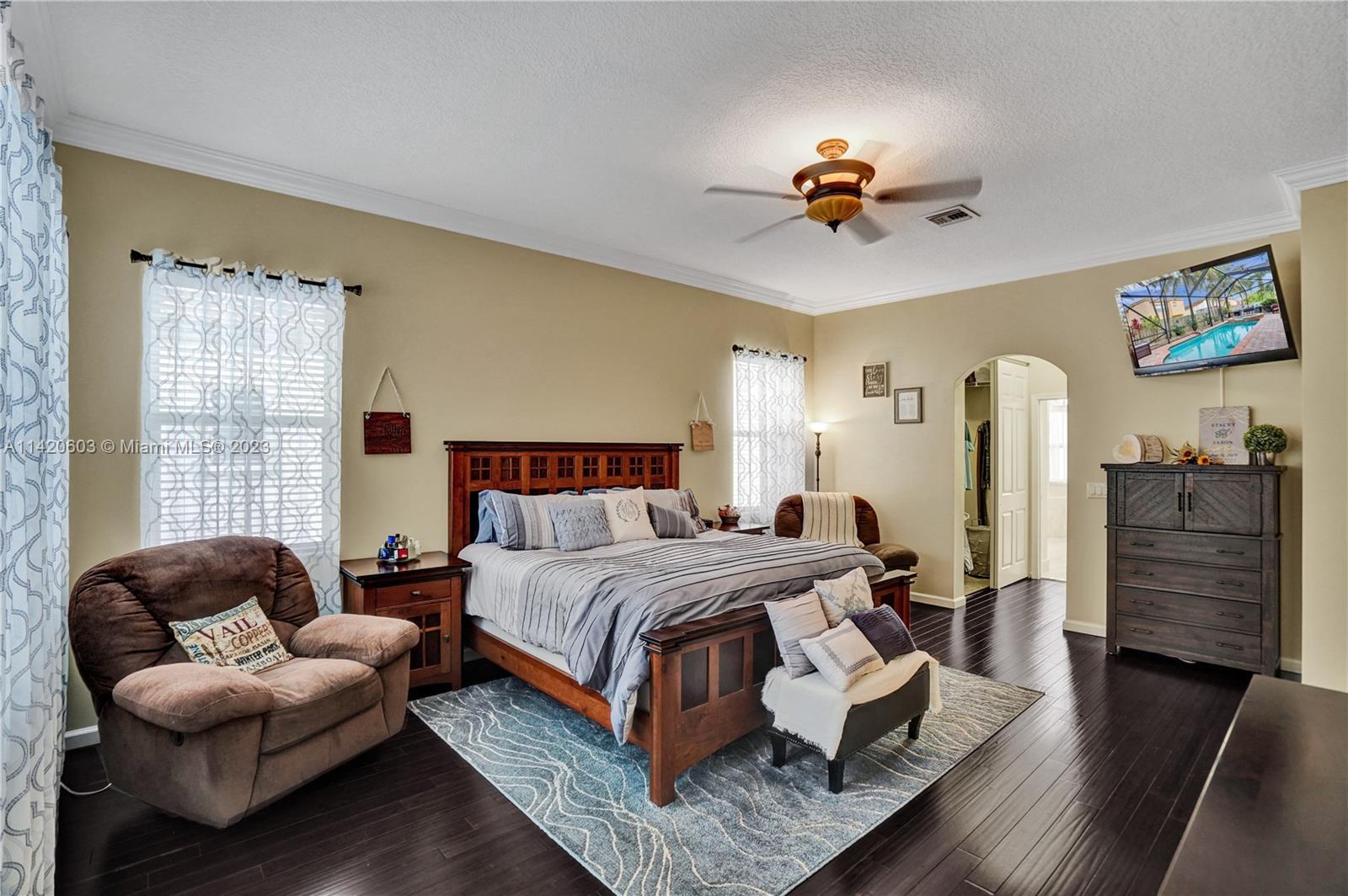 Gorgeous, light & bright – your pool home oasis awaits! This freshly painted, 5 bed, 2.5 bath home features an open concept layout w/tile flooring throughout spacious living areas, a generously sized kitchen w/newer appliances (2021), crown molding & tastefully remodeled baths (2022). The owner's suite comes complete w/2 walk-in closets & a dream spa bath (2023) w/separate shower, freestanding tub & dual sinks. Outdoors, entertaining is easy w/an expanded covered & screened patio, sparkling pool w/new salt cell (2023) & pool pump (2022), fenced yard, banana trees & additional screened balcony w/retractable awning. Accordion shutters for convenience! The gated community of Riviera Isles offers residents a beautiful pool & playground area, tennis, basketball, gym & community security patrol