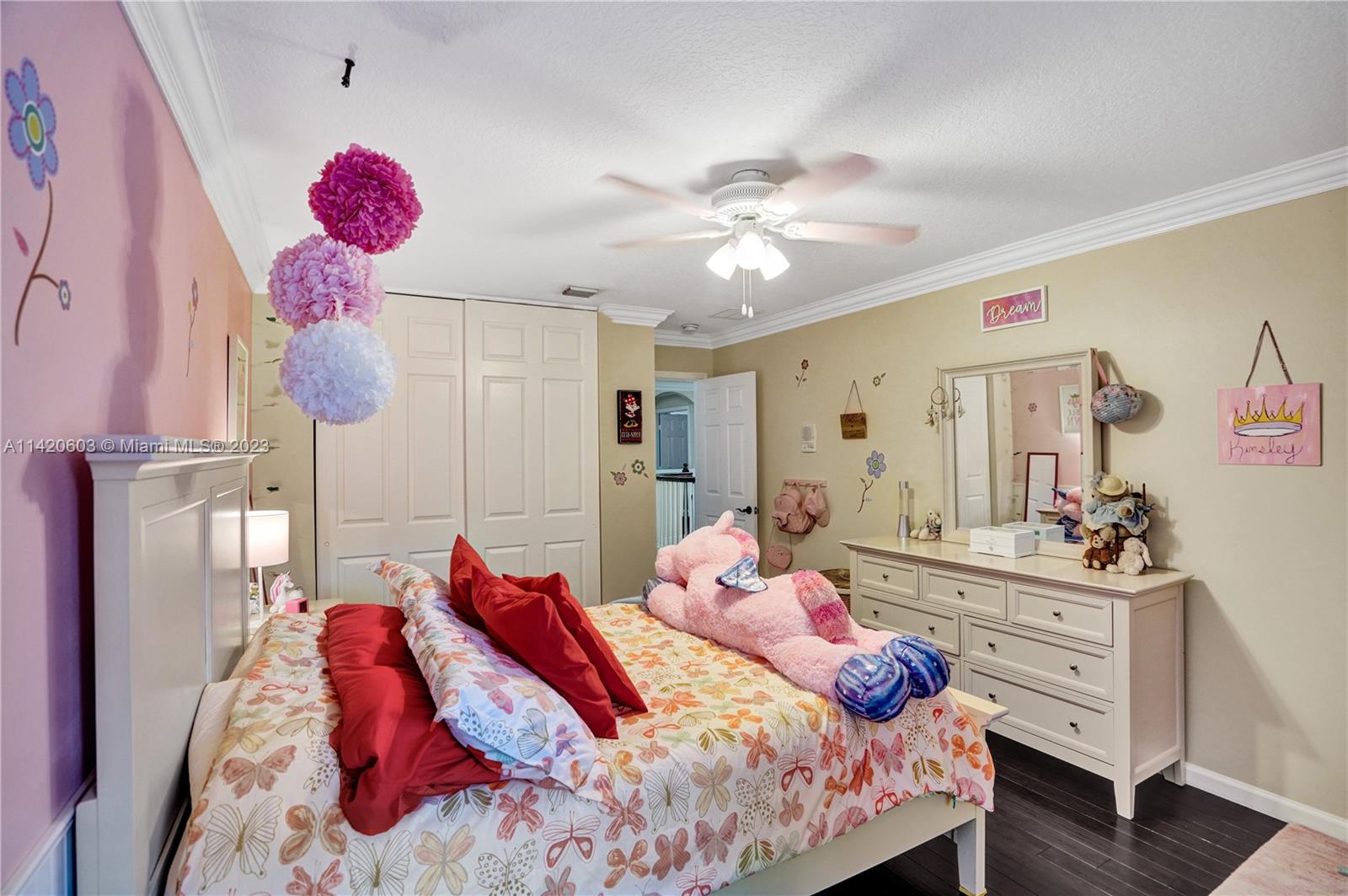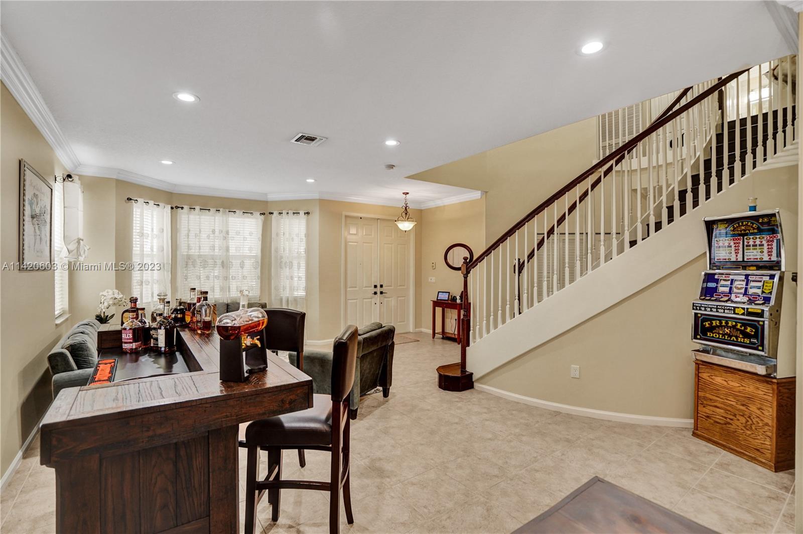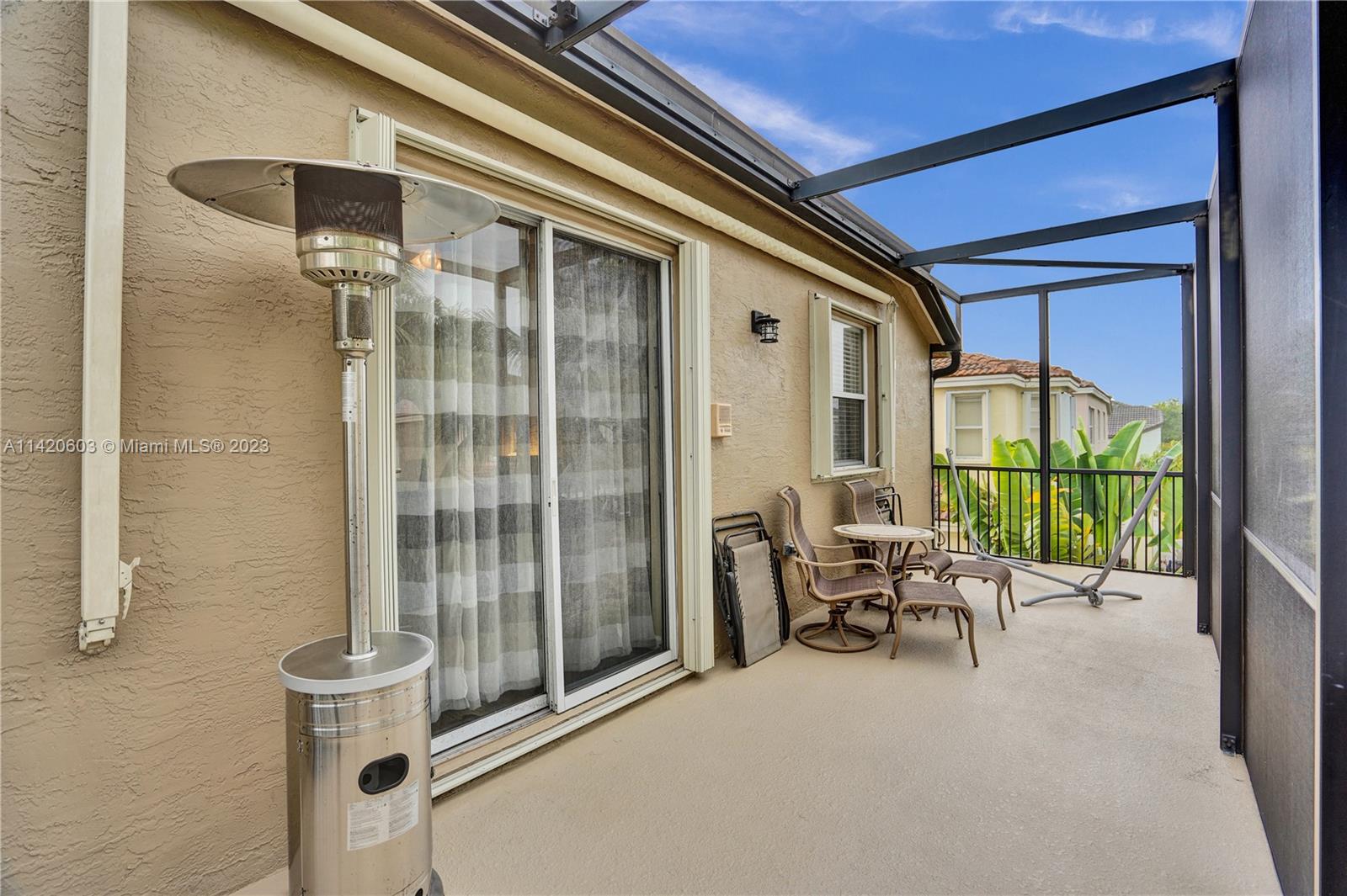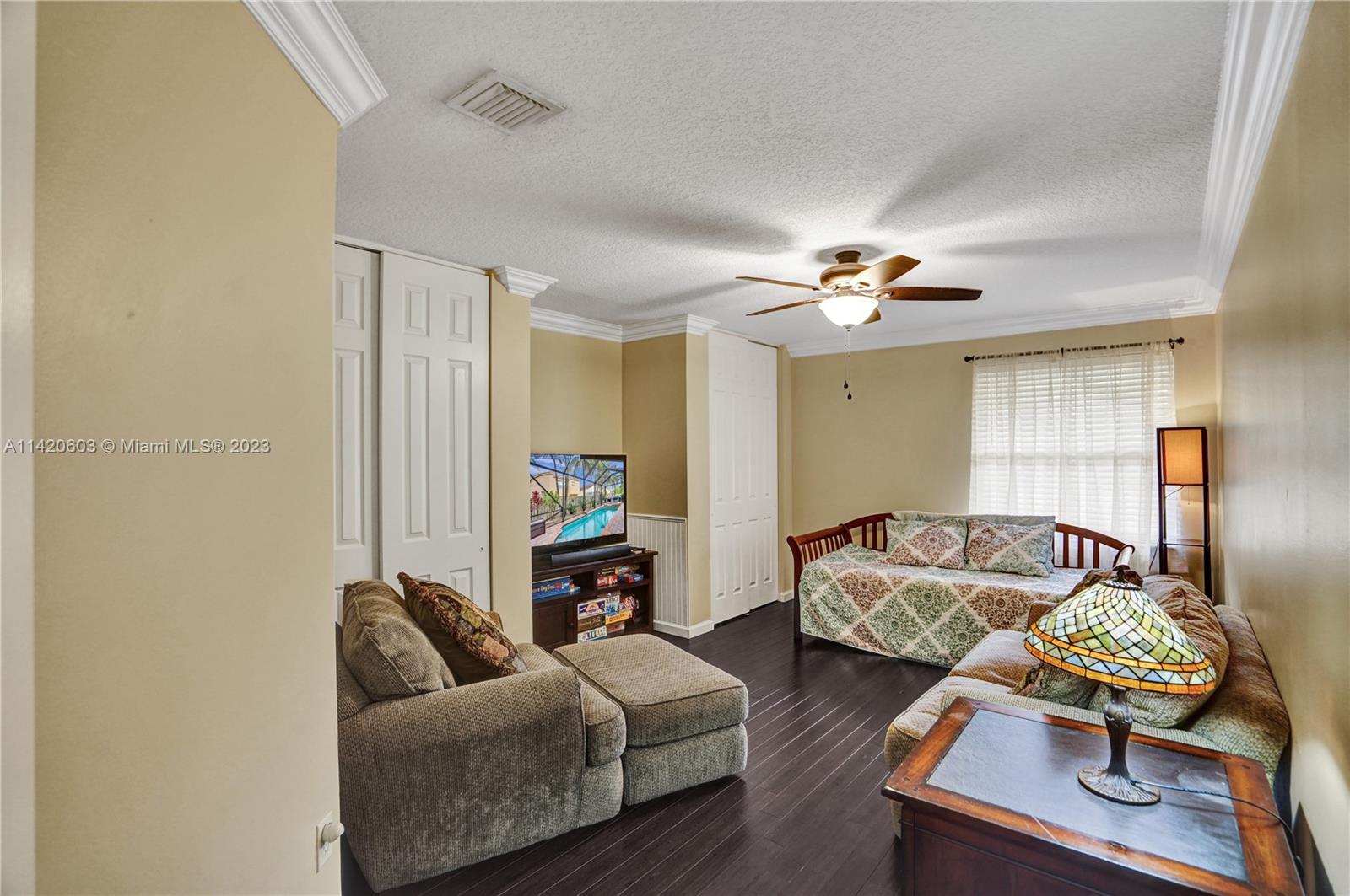 Gorgeous, light & bright – your pool home oasis awaits! This freshly painted, 5 bed, 2.5 bath home features an open concept layout w/tile flooring throughout spacious living areas, a generously sized kitchen w/newer appliances (2021), crown molding & tastefully remodeled baths (2022). The owner's suite comes complete w/2 walk-in closets & a dream spa bath (2023) w/separate shower, freestanding tub & dual sinks. Outdoors, entertaining is easy w/an expanded covered & screened patio, sparkling pool w/new salt cell (2023) & pool pump (2022), fenced yard, banana trees & additional screened balcony w/retractable awning. Accordion shutters for convenience! The gated community of Riviera Isles offers residents a beautiful pool & playground area, tennis, basketball, gym & community security patrol