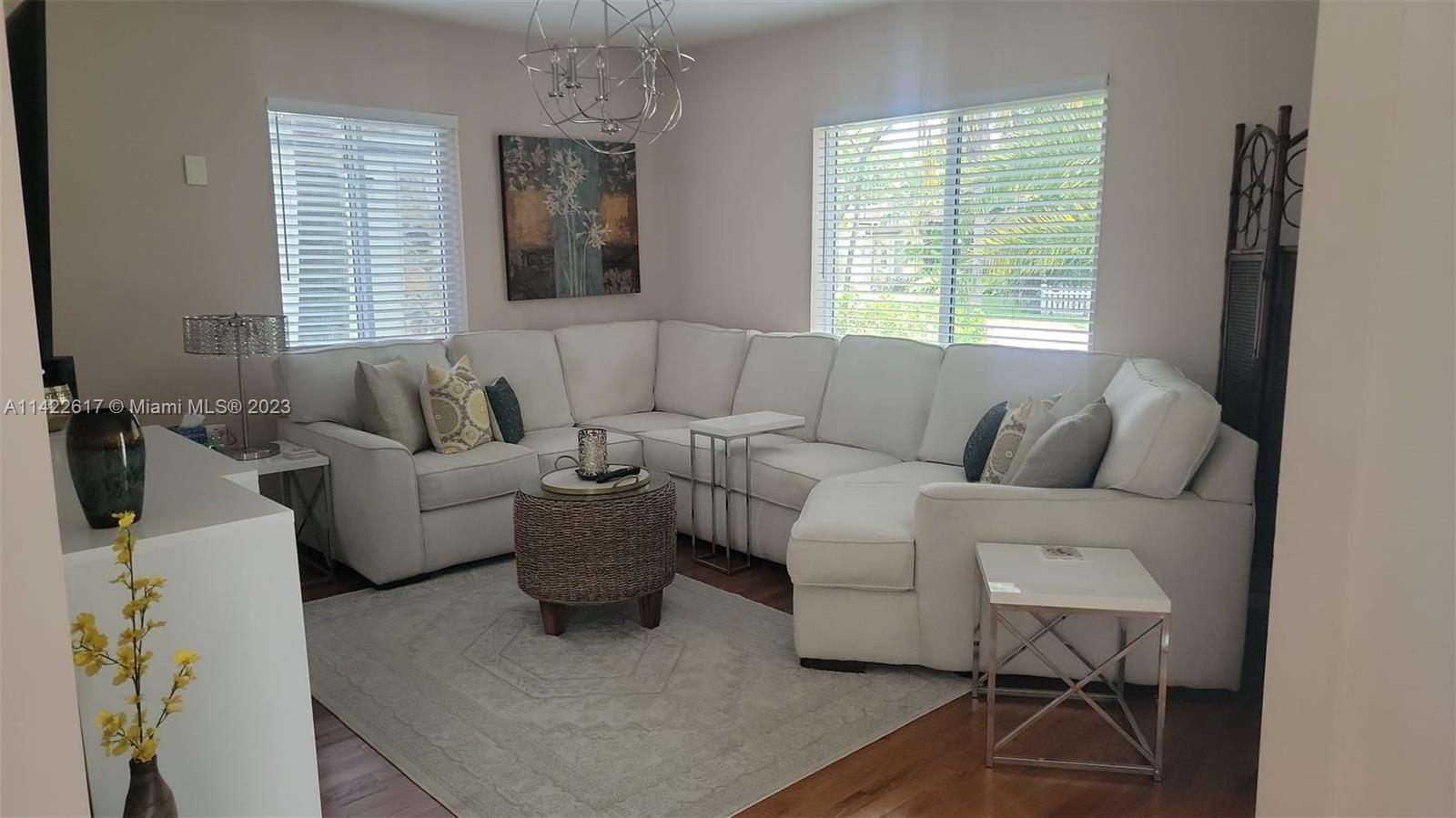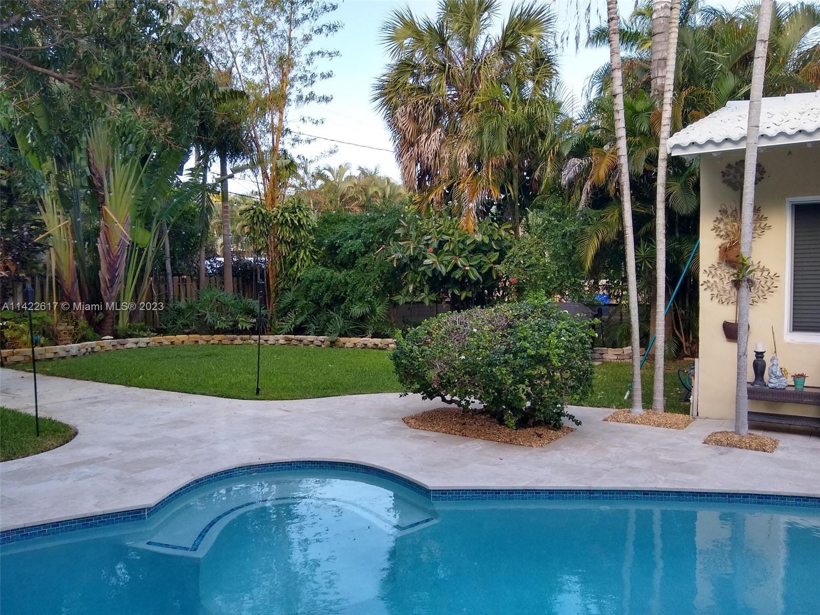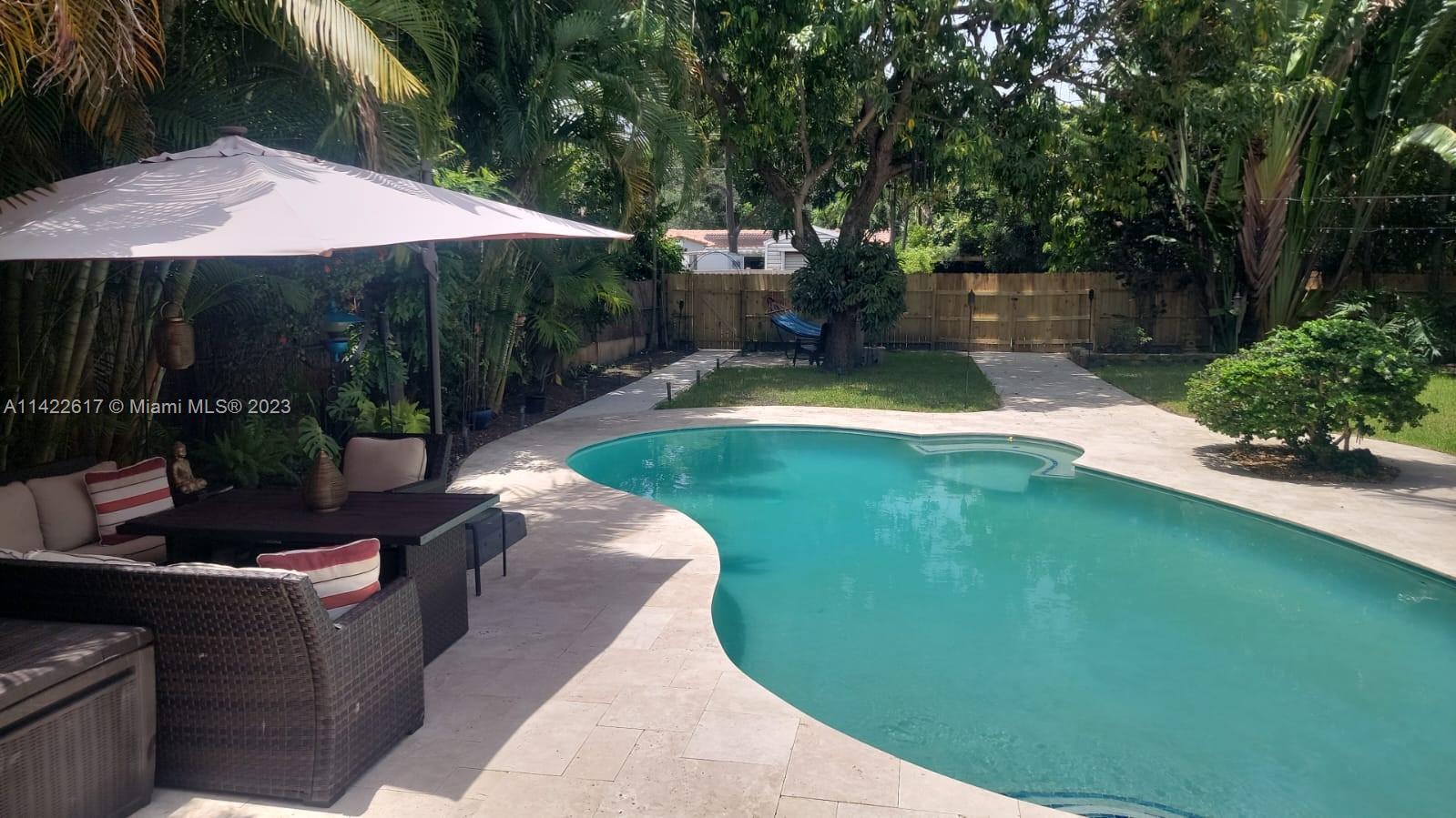 Fully furnished. Turn-key property. Charming Home with Modern Upgrades and Pool. The 1560 sq ft living space has 2 bedrooms and 2 full baths. The kitchen boasts black granite countertops, a mosaic backsplash, and LG smart wifi-enabled appliances. Enjoy the sunroom's views of the pool and mango tree. The dining room features a wood fireplace. Impact windows and doors, York air conditioner, and security enhance comfort. Outdoors, find a delightful in-ground pool with multi-colored lights, travertine pavers, a grill, and a serving station. The front yard is landscaped with pavers, Gardenias, Ixoras, Palms, and a majestic coconut tree. Don't miss this well-maintained home with a pool oasis. Own comfort, style, and relaxation.