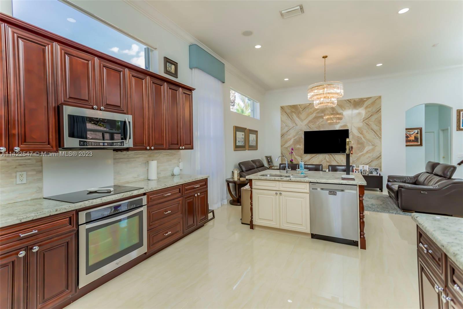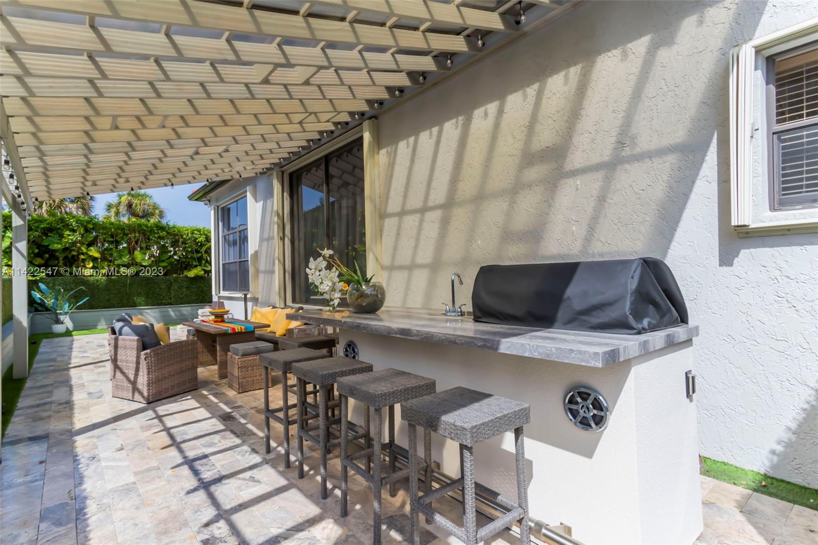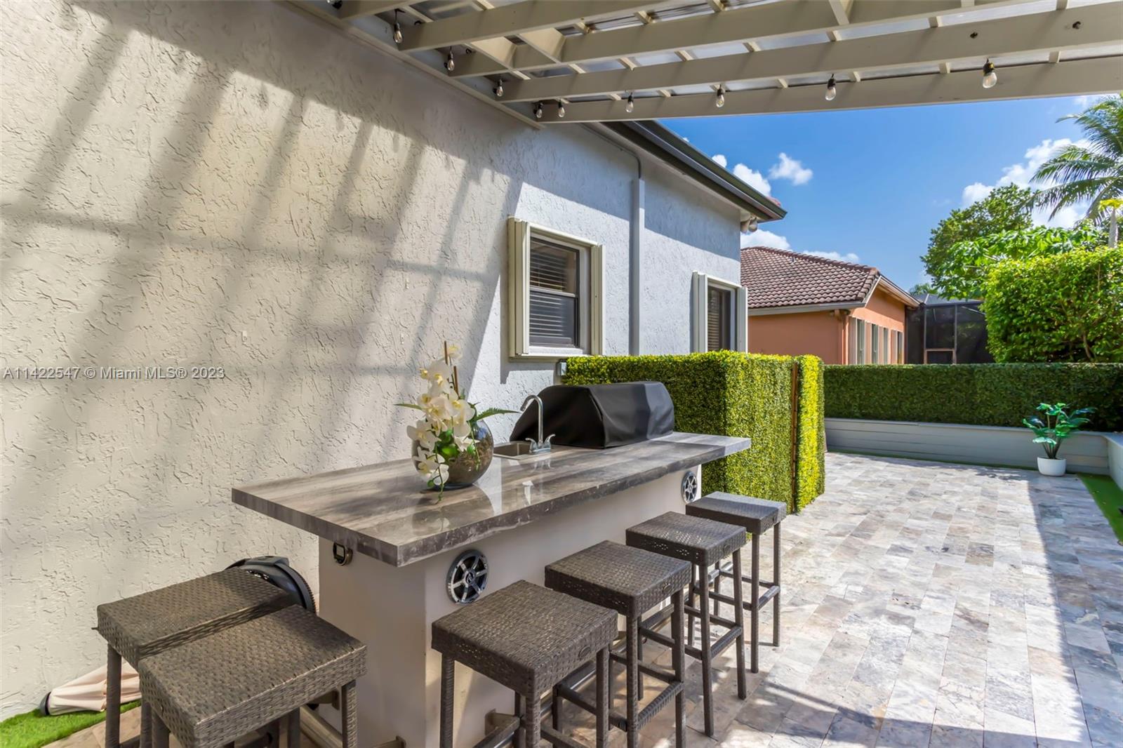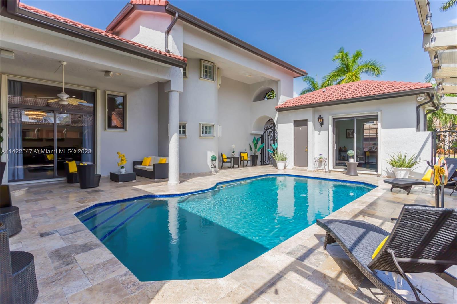 UPGRADED MODERN COURTYARD HOME IN SUNSET LAKES! MAIN HOUSE IS 5 BEDS, 4 BATHS, PRIMARY & 2ND BED ON LOWER LEVEL. GUEST HOUSE HAS 6TH BED W/BUILT-IN BAR & 5TH BATH. INTERIOR FEATURES: VOLUME CEILINGS, NEW CUSTOM SHADES, CUSTOM CALIFORNIA CLOSETS, HARDWOOD FLOORING & NEW PORCELAIN TILE FLOORING ON LOWER LEVEL & UPPER LEVEL. KITCHEN IS COMPLETELY UPGRADED W/NEW HARDWOOD CABINETRY, GRANITE COUNTERTOPS & SS APPLIANCES. 4 OF 5 BATHS COMPLETELY UPGRADED W/NEW VANITIES, NEW TILE & NEW SHOWERS. EXTERIOR FEATURES: NEW TRAVERTINE CIRCULAR DRIVEWAY, TRAVERTINE PATIO, NEW CUSTOM WROUGHT IRON GATES, NEW LANDSCAPE W/NEW LANDSCAPE BORDERS. POOL RESURFACED IN 2021 W/NEW POOL EQUIPMENT. NEW OUTDOOR COVERED KITCHEN W/GRILL, FRIDGE & SINK, NEW TURF, NEW GUTTERS. FRESHLY PAINTED, ACCORDION SHUTTERS THROUGHOUT!
