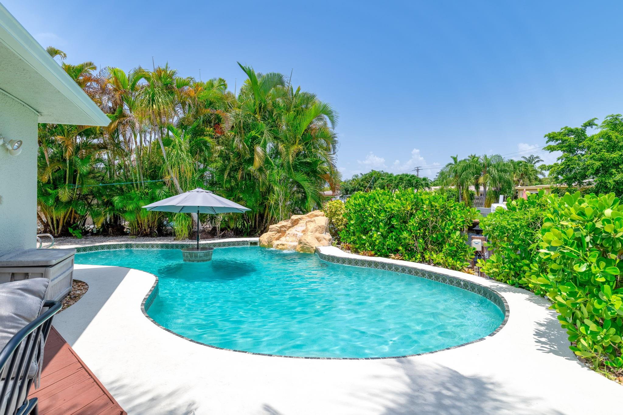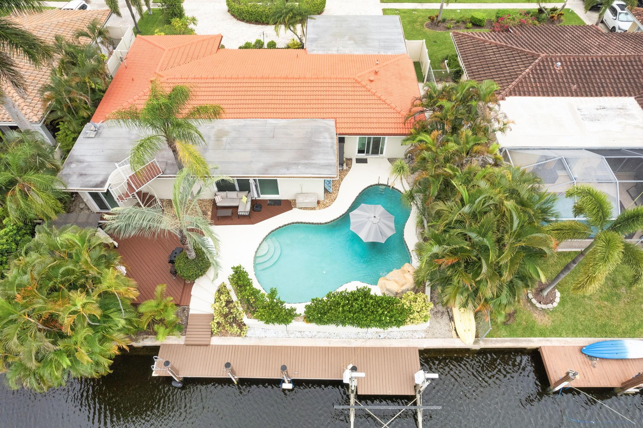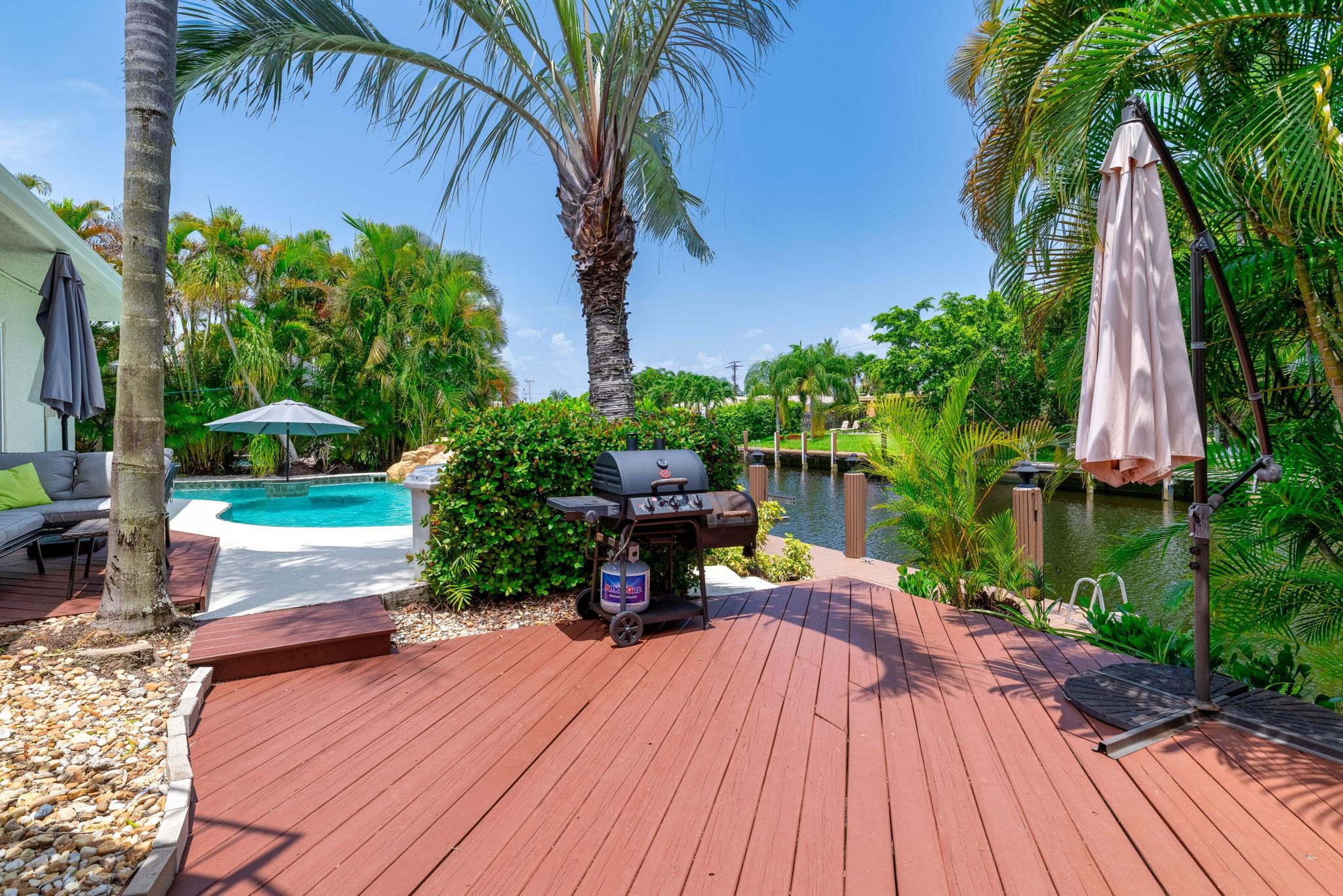 True Florida living abounds in this bright updated open plan 4bed2.5bath pool home on quiet cul-de-sac. Enjoy 75' of frontage on a wide ocean access canal with 10,000lb boat lift and 11 foot clearance at high tide. Large white tile floors with modern vinyl flooring in the bedrooms. Kitchen has new countertops. Primary bath enjoys new dual sinks and custom tile shower with rain fall and body jets. Large curved paver drive with two car garage. Impact windows, doors and garage door. Generator ready! Heated pool! Complete fresh paint inside and out top to bottom. Seawall footer four years new. Relax and enjoy your pool, pergola and water view day or night on a freshly painted wood deck. Come take a look! This one won't disappoint.