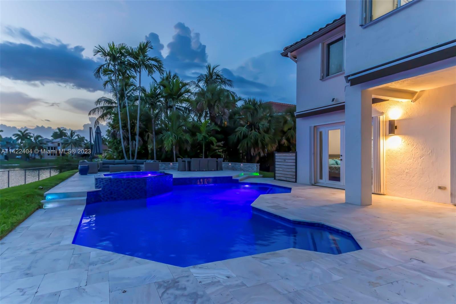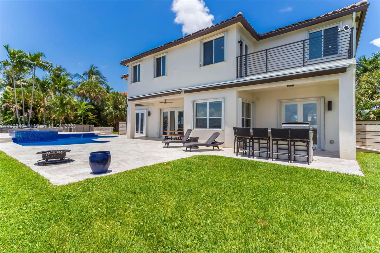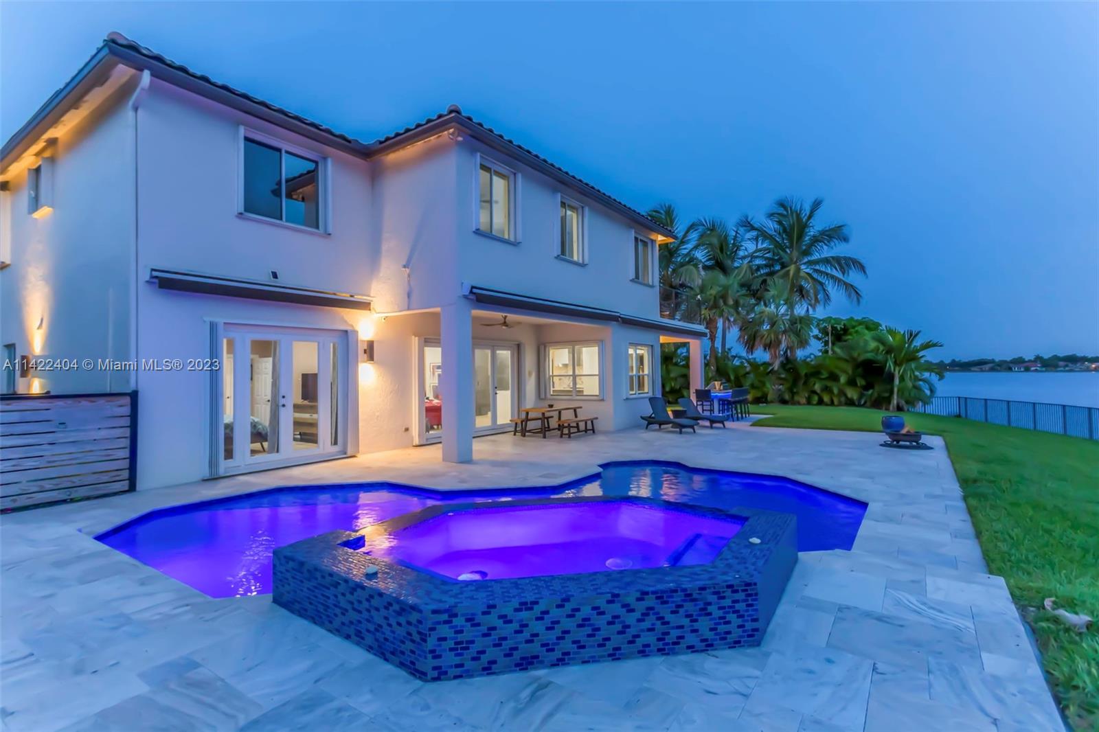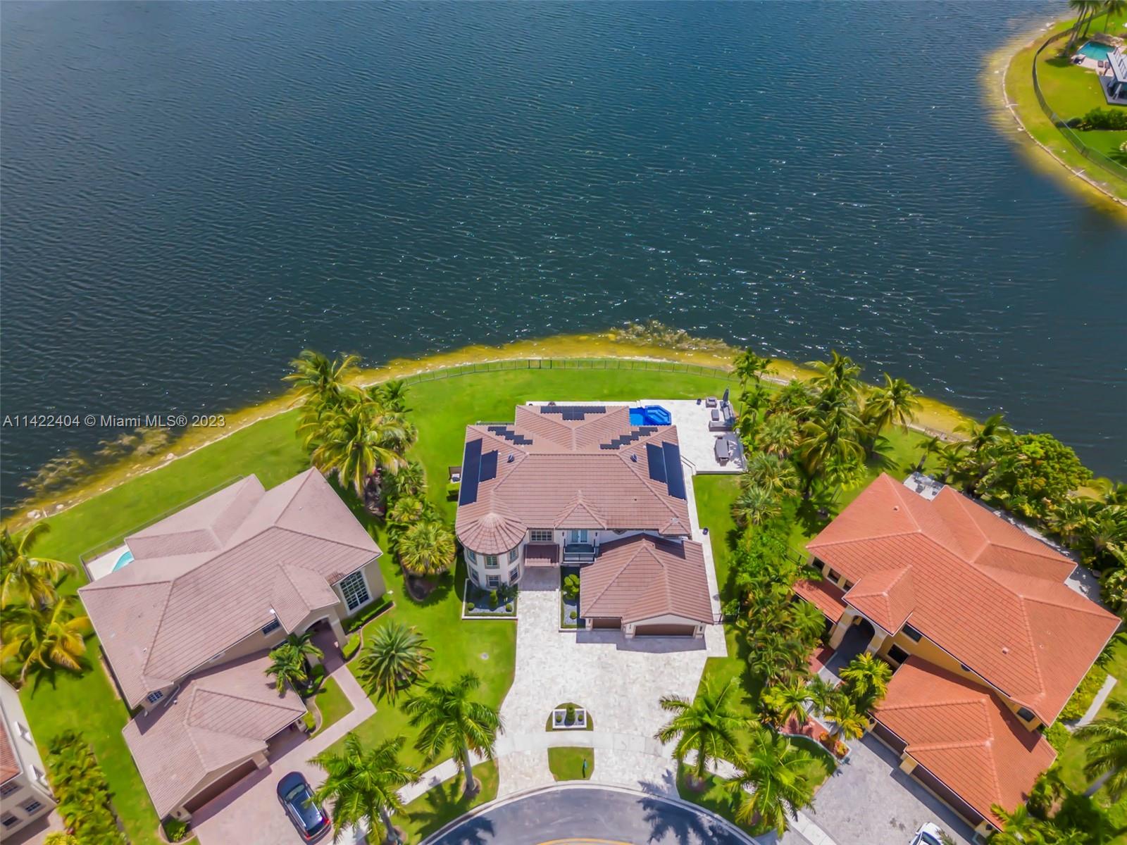 Completely remodeled modern home in Sunset Lakes. This stunning property is the essence of luxury living. Its large circular travertine paved driveway & lush landscape welcomes you. Enter the custom wrought iron doors & be captivated by the grand staircase. Main level features 3 bedrooms & cabana bath. Kitchen is completely upgraded w/ new quartz countertops, a gas stove, SS appliances, a walk-in pantry & a generously sized island. The oversized primary suite includes a seating area & an extended balcony w amazing lake views. Elevate your living standards w the completely remodeled modern style primary bathroom. The backyard oasis includes automated awnings, an outdoor kitchen, heated saltwater pool & spa. ROOF 2020. Solar panels, generator & accordion shutters throughout.