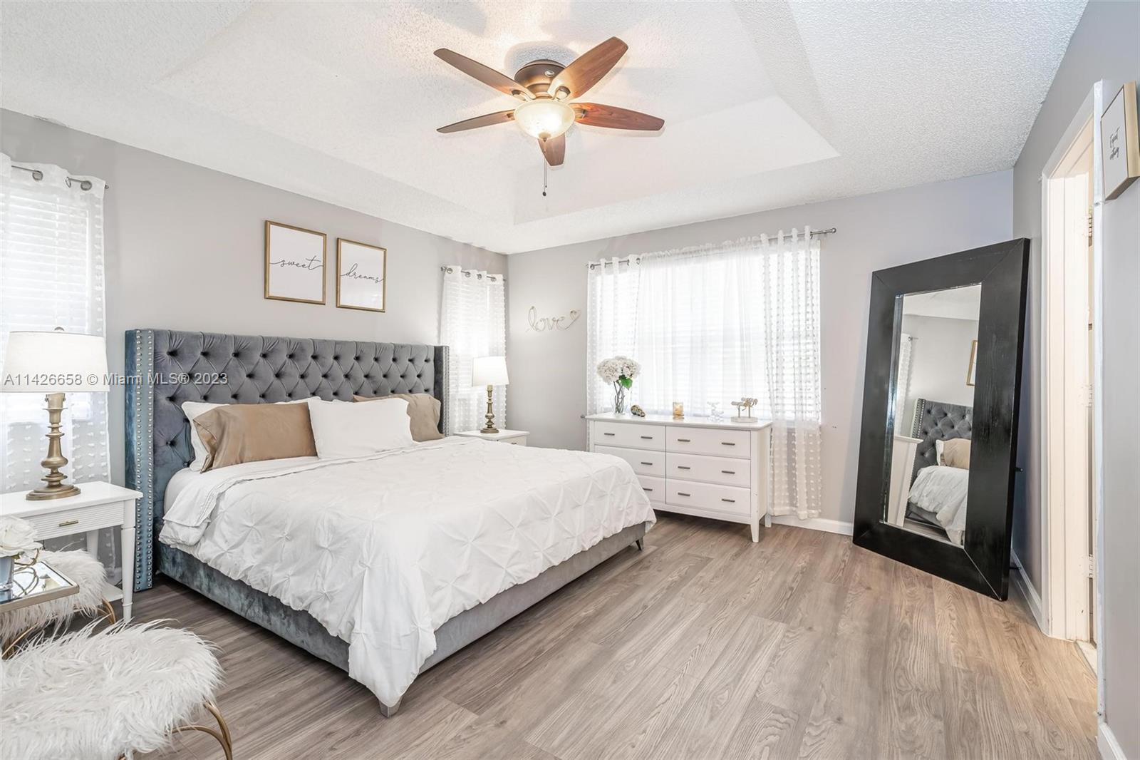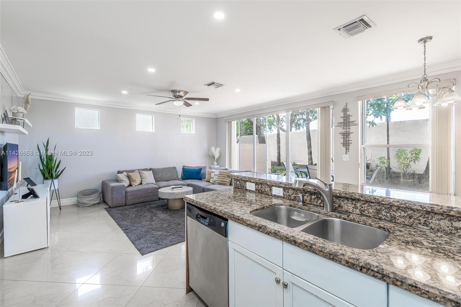 Come see this highly sought after end unit located in the charming Regalo community, 3/2.5 townhome, 1 car garage with tile flooring and LED lighting throughout the 1st floor and brand new laminate flooring upstairs. Newer AC & water heater, full-sized laundry room, spacious den/hallway and plenty of closet space. In addition, the lot offers a spacious brick patio perfect to relax and enjoy the outdoors and the convenience of accordion shutters. Walking distance to pool and playground. Minutes from I-75, Turnpike, shopping and restaurants.